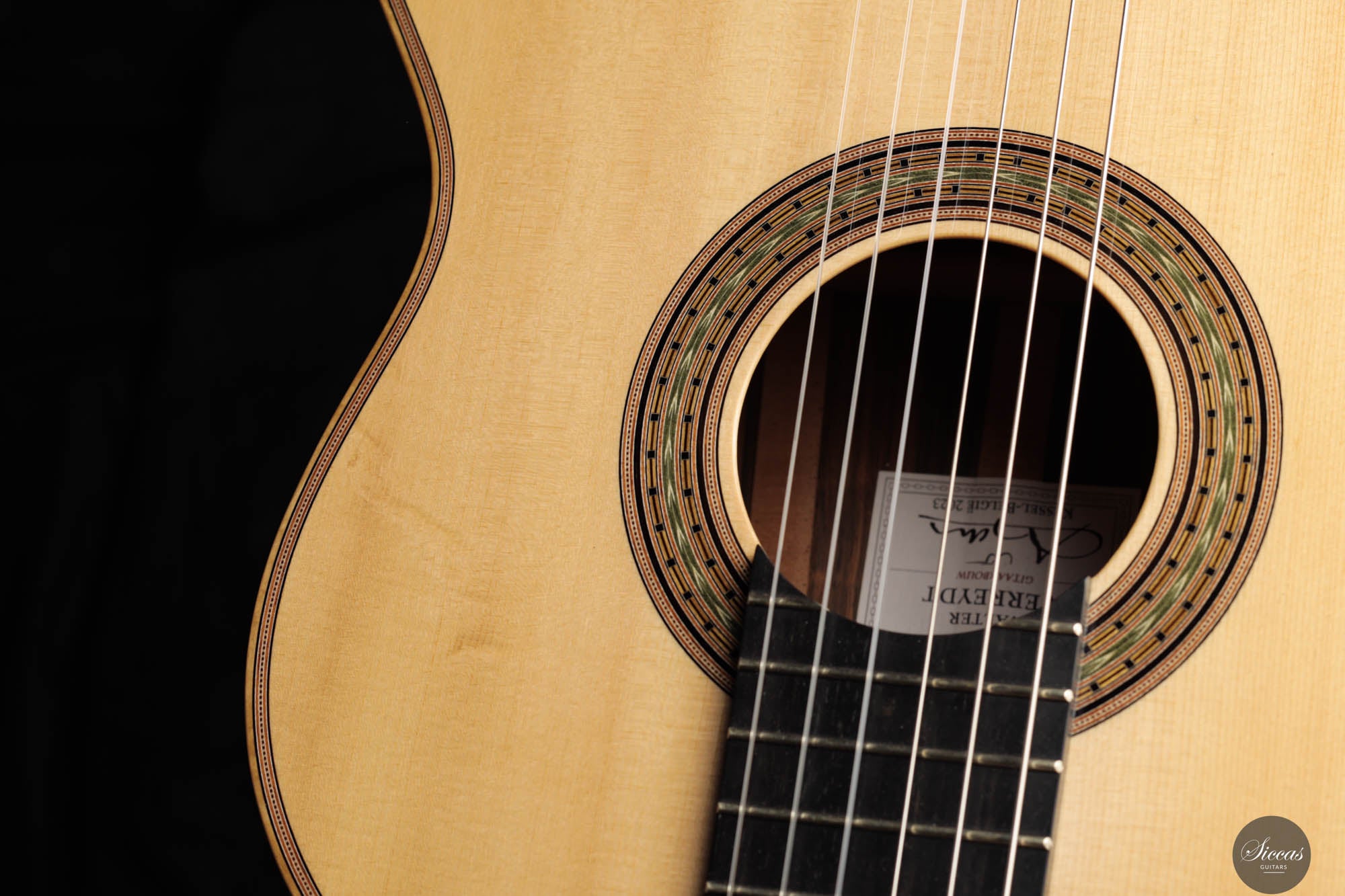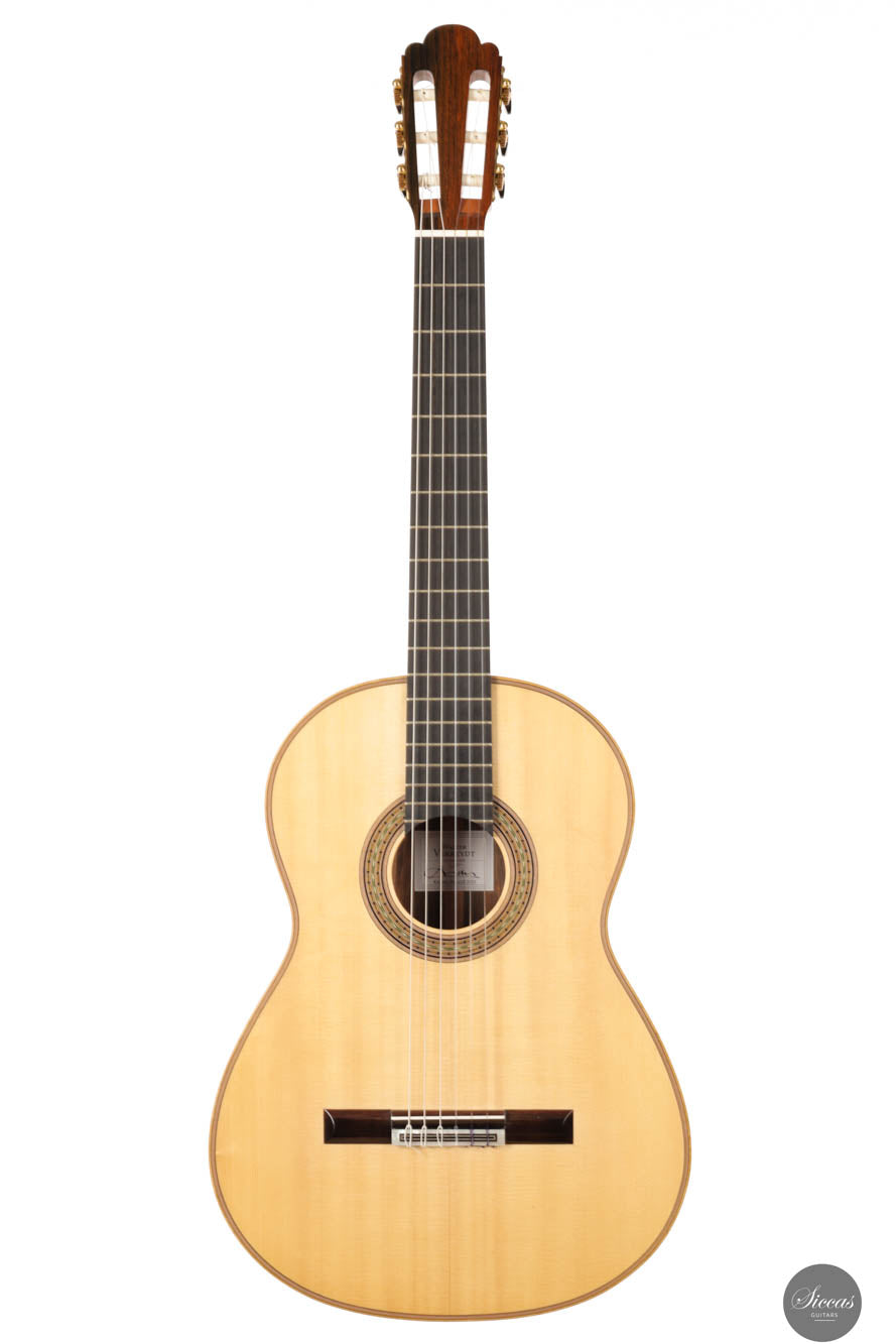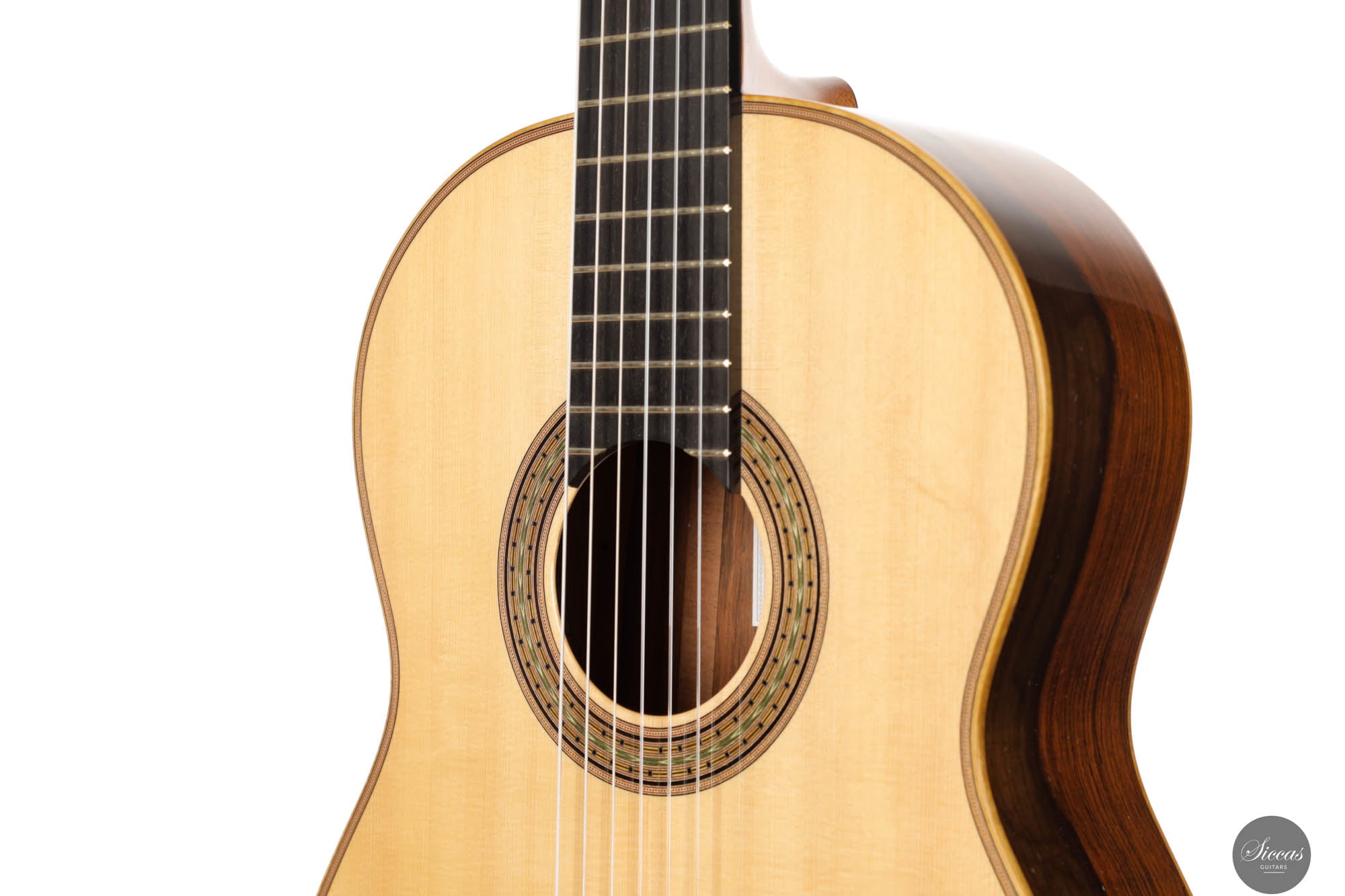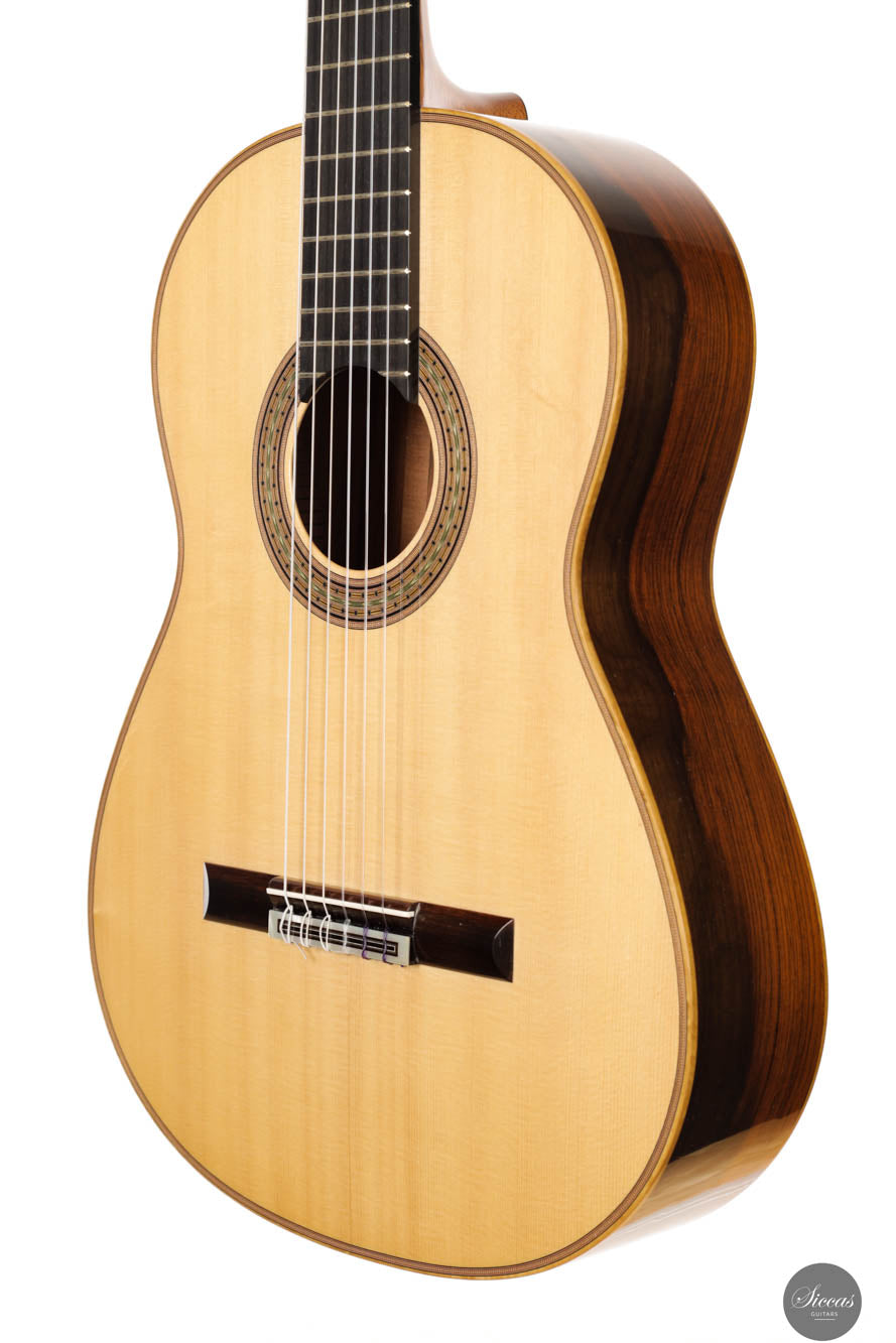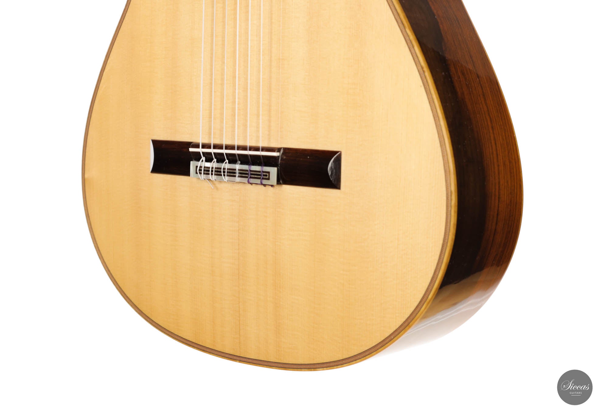 Diese Gitarre, inspiriert von den legendären Antonio de Torres, steht als Zeugnis für die zeitlose Schönheit und außergewöhnliche Klangqualität der spanischen Handwerkskunst des frühen 20. Jahrhunderts. Mit akribischer Aufmerksamkeit fürs Detail gefertigt, zeichnet sie sich durch elegantes, geradliniges Rio-Palisanderholz aus, das für Authentizität und Nachhaltigkeit CITES-zertifiziert ist, gepaart mit einer außerordentlich resonanten Fichtendecke. Vom Moment der ersten gespielten Noten an fesselt diese Gitarre sowohl den Spieler als auch den Zuhörer und transportiert sie zurück ins goldene Zeitalter der Gitarrenmusik mit ihrer enormen Ansprache und ihrem sofortigen Klang. Ihr runder Ton, eine Seltenheit unter zeitgenössischen Instrumenten, erreicht eine perfekte Balance aus Wärme und Klarheit, bereichert mit einem iberischen Charme, der zu einer nostalgischen Zeitreise einlädt. Die außergewöhnliche Projektion, Reinheit und Verfeinerung der Gitarre sind ein Indiz für das Können eines Meisterluthiers und bieten immense Zufriedenheit und ein tief bereicherndes Spielerlebnis.