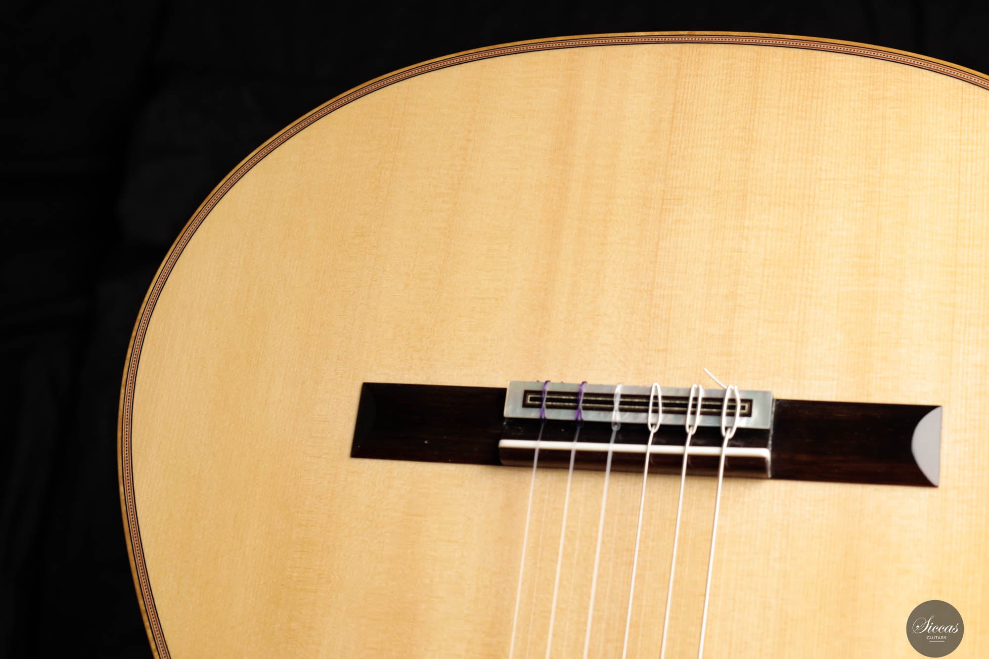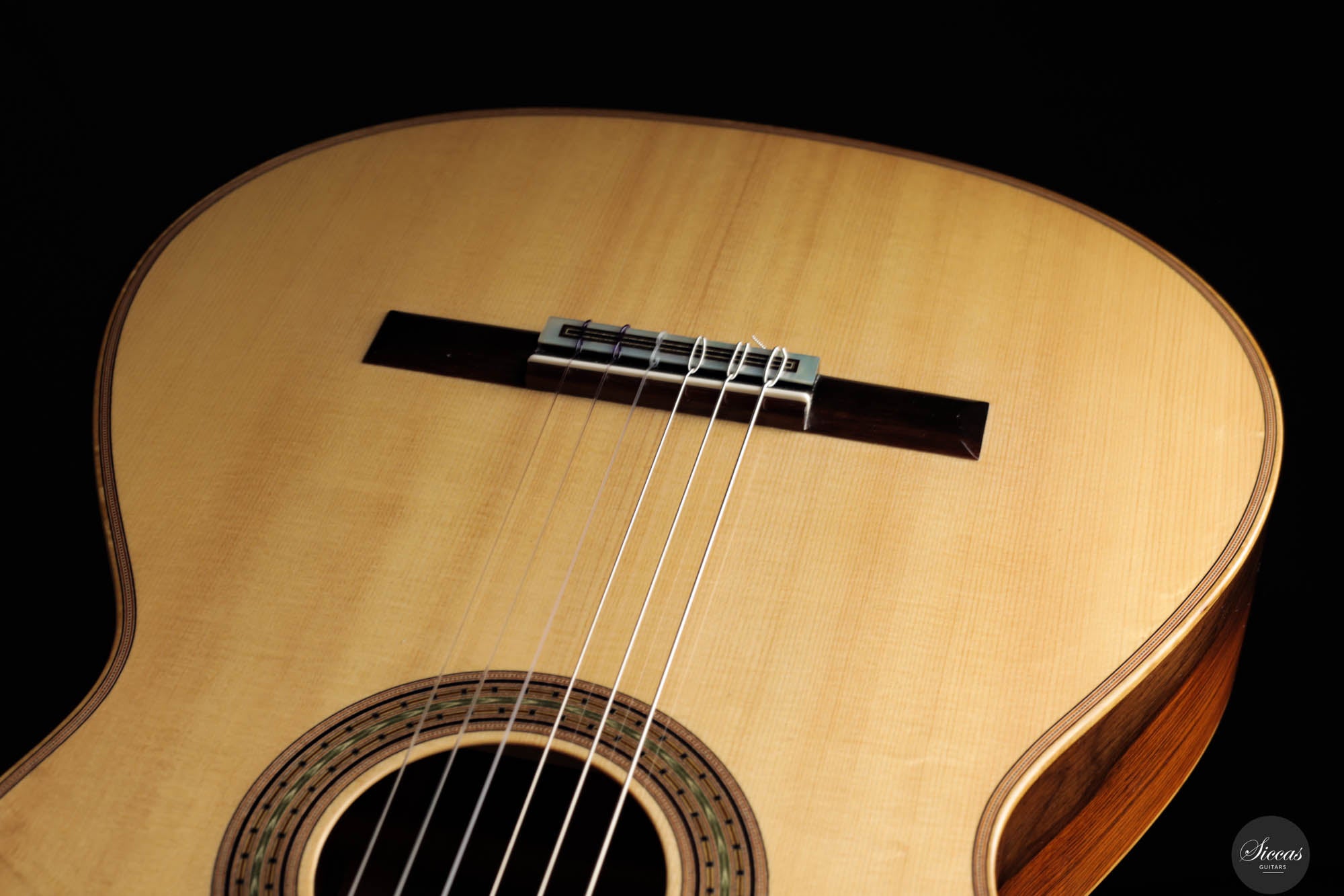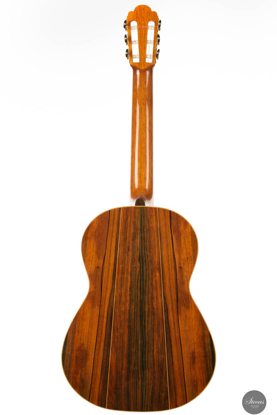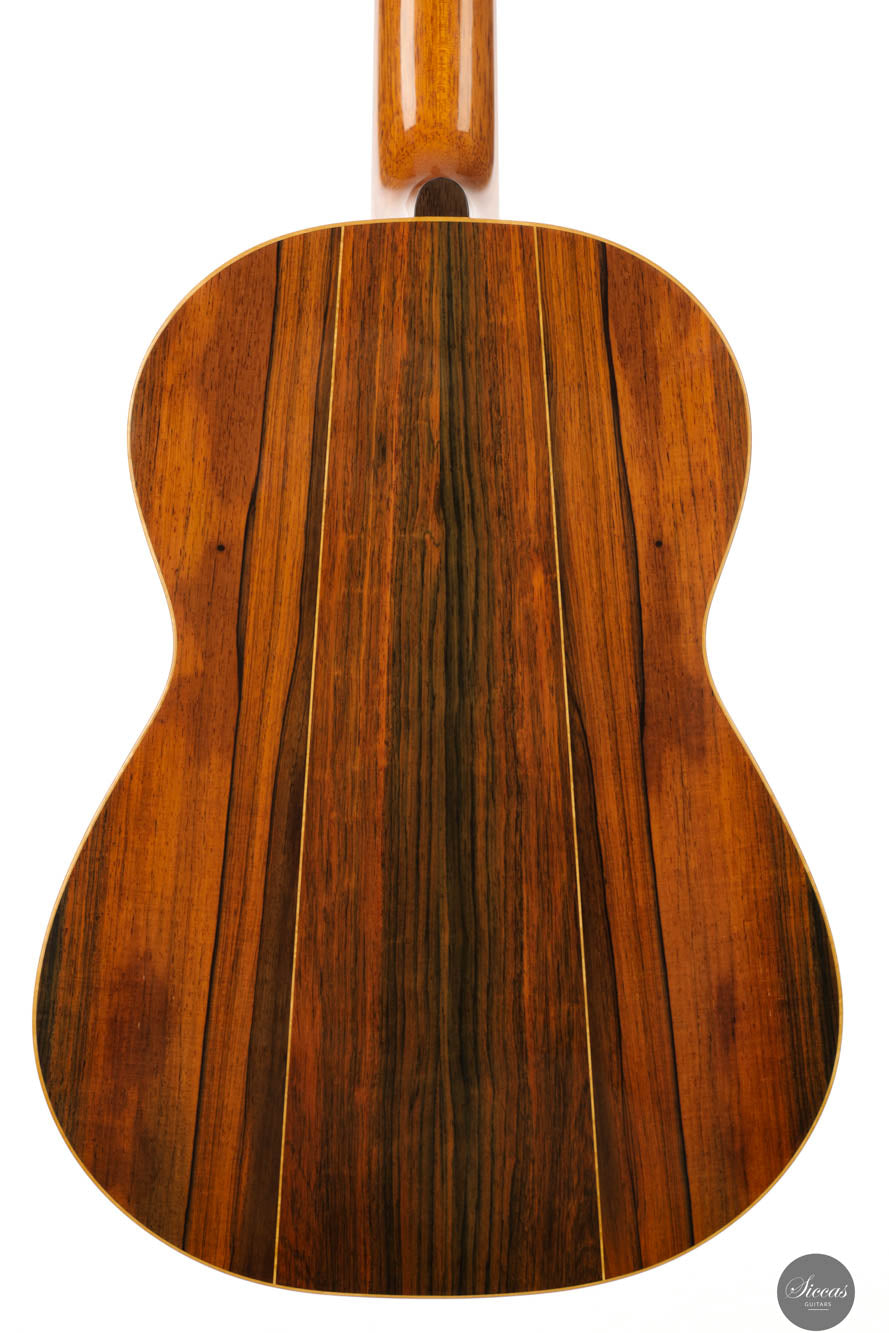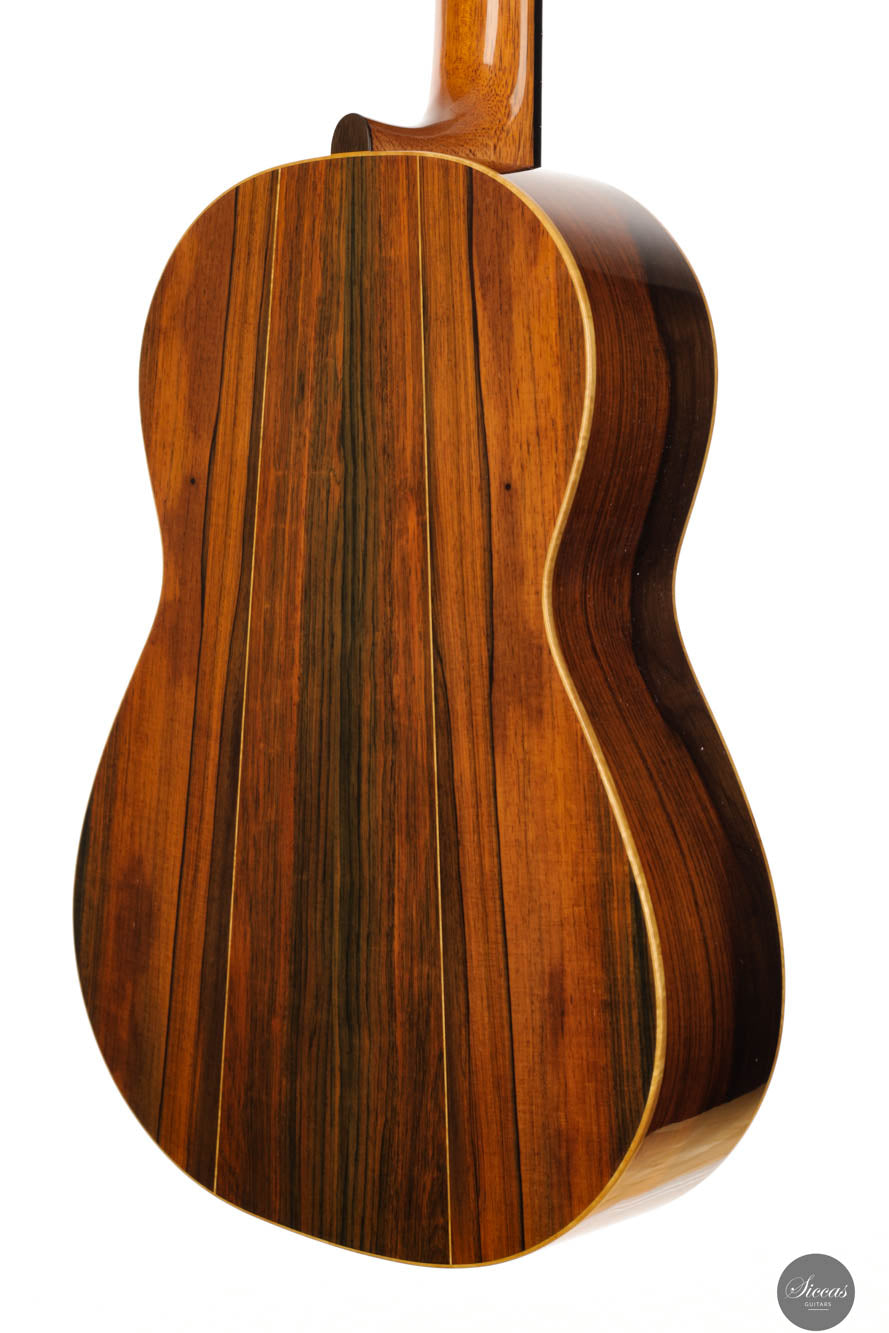 Diese Gitarre, inspiriert von den legendären Antonio de Torres, steht als Zeugnis für die zeitlose Schönheit und außergewöhnliche Klangqualität der spanischen Handwerkskunst des frühen 20. Jahrhunderts. Mit akribischer Aufmerksamkeit fürs Detail gefertigt, zeichnet sie sich durch elegantes, geradliniges Rio-Palisanderholz aus, das für Authentizität und Nachhaltigkeit CITES-zertifiziert ist, gepaart mit einer außerordentlich resonanten Fichtendecke. Vom Moment der ersten gespielten Noten an fesselt diese Gitarre sowohl den Spieler als auch den Zuhörer und transportiert sie zurück ins goldene Zeitalter der Gitarrenmusik mit ihrer enormen Ansprache und ihrem sofortigen Klang. Ihr runder Ton, eine Seltenheit unter zeitgenössischen Instrumenten, erreicht eine perfekte Balance aus Wärme und Klarheit, bereichert mit einem iberischen Charme, der zu einer nostalgischen Zeitreise einlädt. Die außergewöhnliche Projektion, Reinheit und Verfeinerung der Gitarre sind ein Indiz für das Können eines Meisterluthiers und bieten immense Zufriedenheit und ein tief bereicherndes Spielerlebnis.