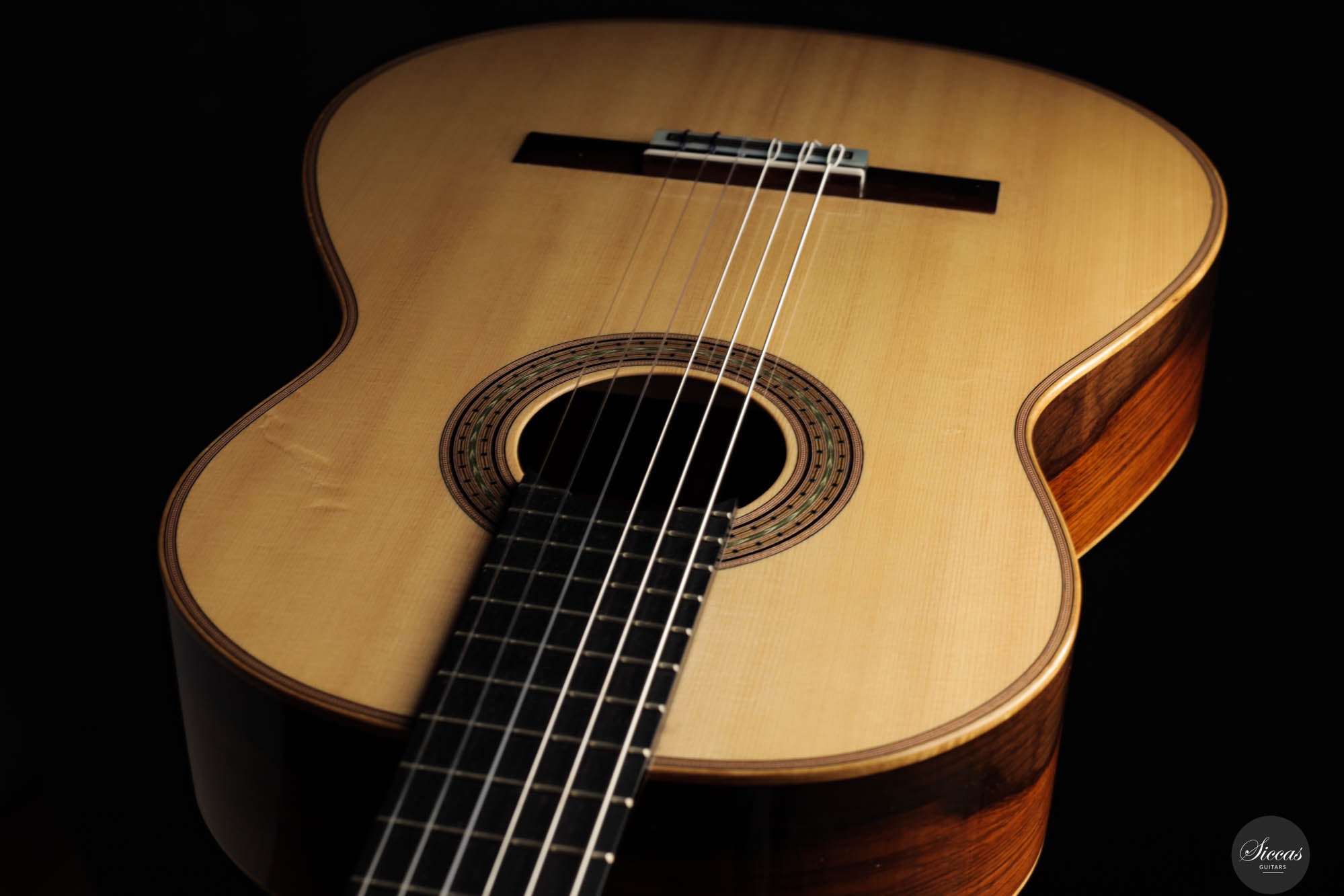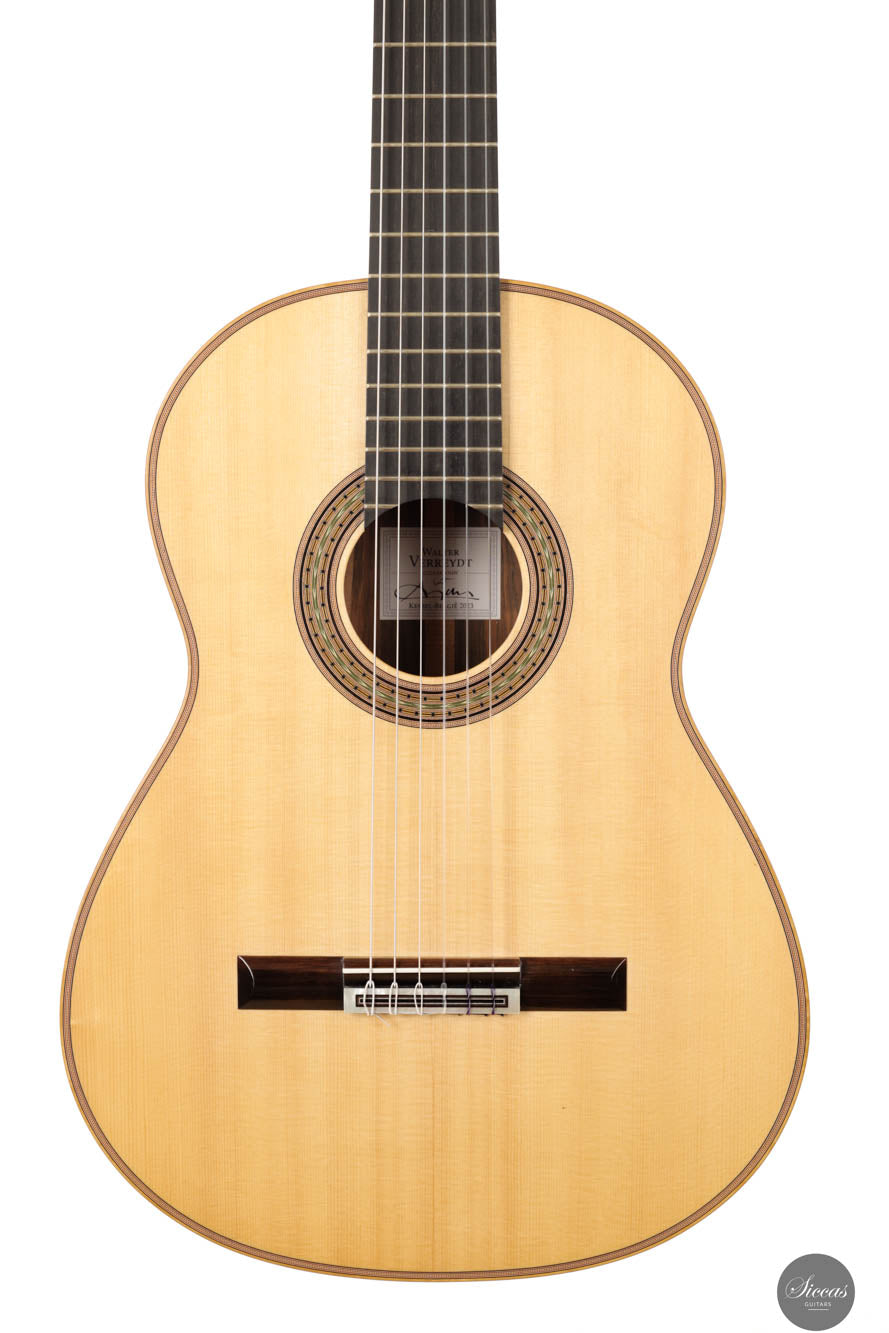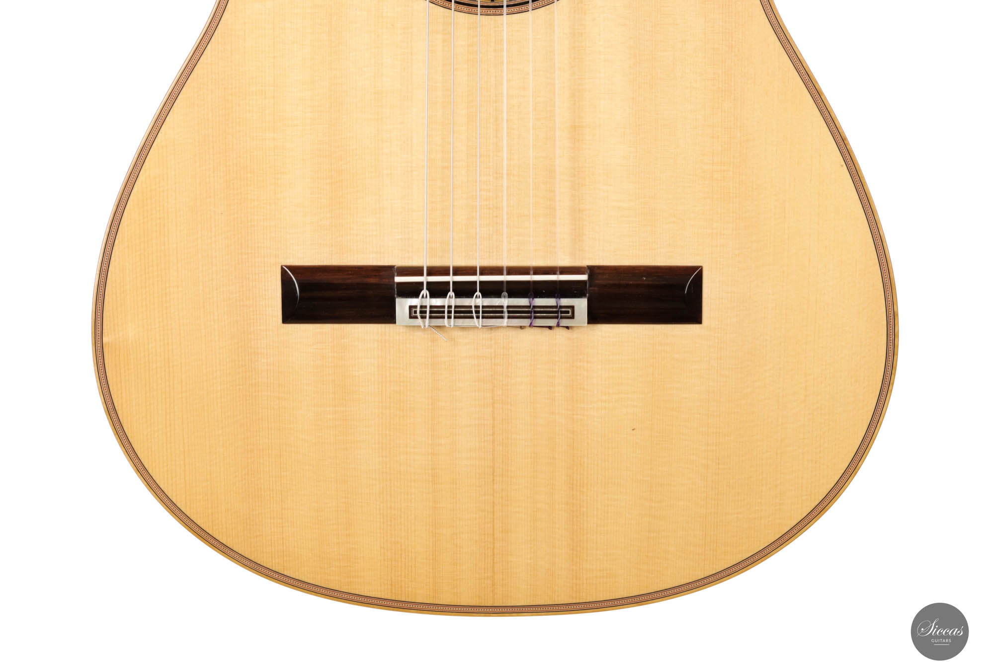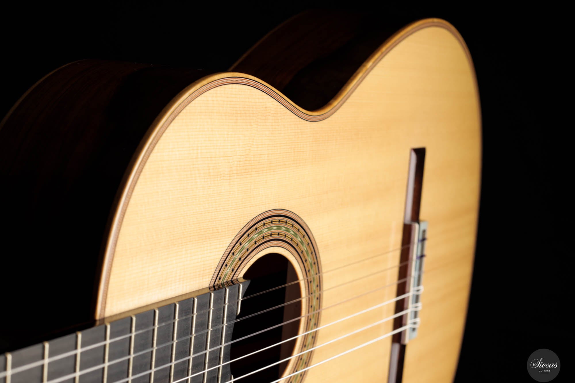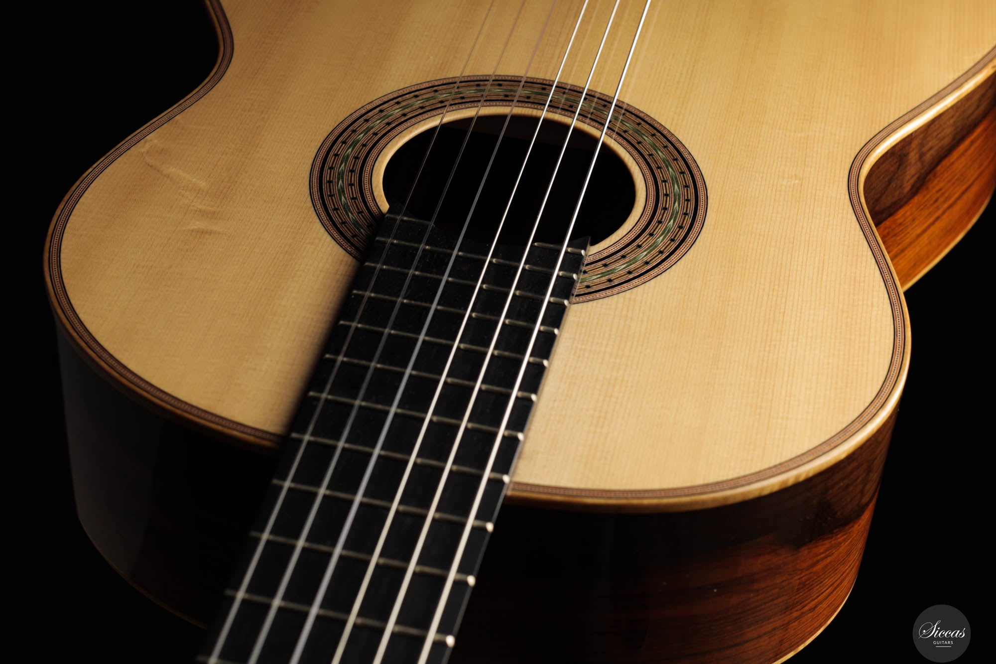Diese Gitarre, inspiriert von den legendären Antonio de Torres, steht als Zeugnis für die zeitlose Schönheit und außergewöhnliche Klangqualität der spanischen Handwerkskunst des frühen 20. Jahrhunderts. Mit akribischer Aufmerksamkeit fürs Detail gefertigt, zeichnet sie sich durch elegantes, geradliniges Rio-Palisanderholz aus, das für Authentizität und Nachhaltigkeit CITES-zertifiziert ist, gepaart mit einer außerordentlich resonanten Fichtendecke. Vom Moment der ersten gespielten Noten an fesselt diese Gitarre sowohl den Spieler als auch den Zuhörer und transportiert sie zurück ins goldene Zeitalter der Gitarrenmusik mit ihrer enormen Ansprache und ihrem sofortigen Klang. Ihr runder Ton, eine Seltenheit unter zeitgenössischen Instrumenten, erreicht eine perfekte Balance aus Wärme und Klarheit, bereichert mit einem iberischen Charme, der zu einer nostalgischen Zeitreise einlädt. Die außergewöhnliche Projektion, Reinheit und Verfeinerung der Gitarre sind ein Indiz für das Können eines Meisterluthiers und bieten immense Zufriedenheit und ein tief bereicherndes Spielerlebnis.