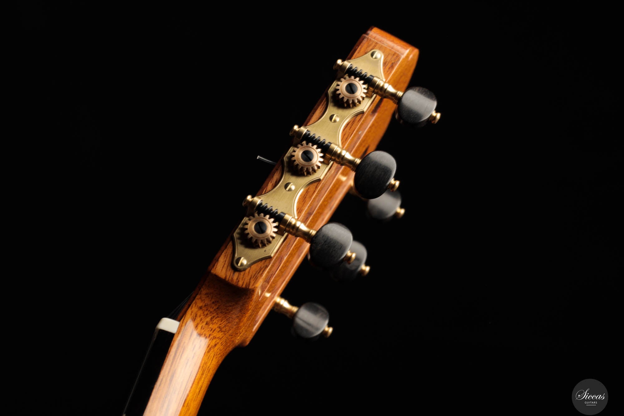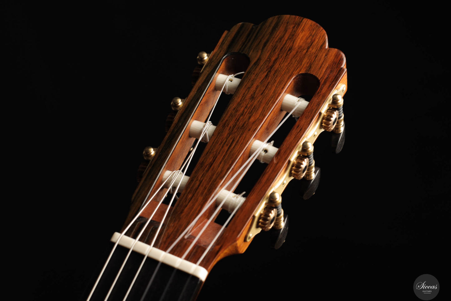 Die Schaffung dieser Gitarre war eine Liebesarbeit für den Luthier, gebaut zwischen geplanten Aufträgen in einer Periode intensiver Inspiration und ohne die Einschränkungen von Kundenspezifikationen. Sie repräsentiert nicht eine echte Replik einer Torres-Gitarre, sondern eine persönliche Interpretation, durchdrungen von der eigenen künstlerischen Vision und Leidenschaft des Luthiers für das Handwerk. Die Verwendung von sehr altem Rio-Palisander für den Korpus und Satinholz für die Einlage fügt Schichten visueller und akustischer Komplexität hinzu, was dieses Instrument nicht nur zu einem Vergnügen zum Spielen macht, sondern auch zu einem atemberaubenden Kunstwerk zum Betrachten. Diese Gitarre, die zweite ihrer Art, die vom Luthier produziert wurde, folgt den Spuren ihres Vorgängers, der vom geschätzten mexikanischen Gitarristen Pablo Garibay gespielt wird, und zementiert so ihren Status als bemerkenswertes Instrument, das sowohl seinem Schöpfer als auch denen, die das Glück haben, seinen unvergleichlichen Klang zu erleben, weiterhin große Zufriedenheit bereitet.