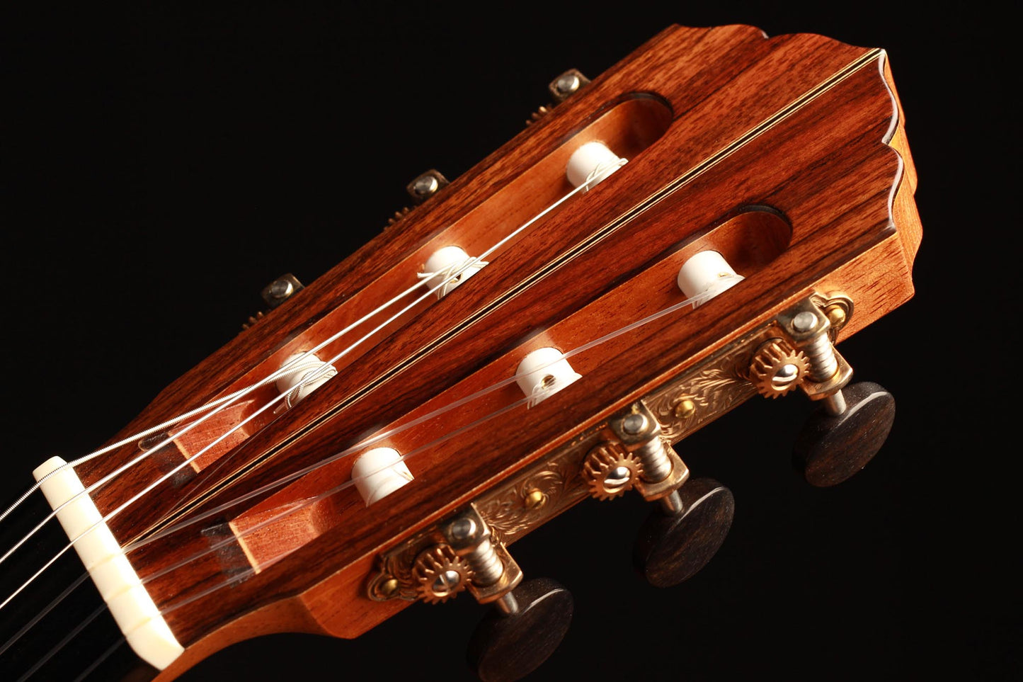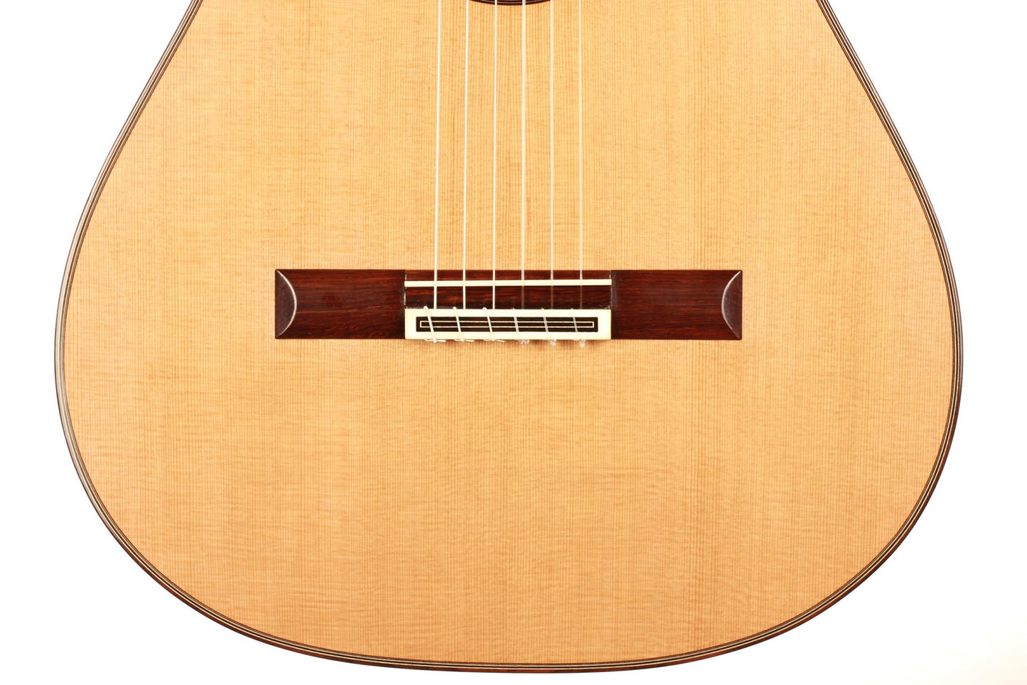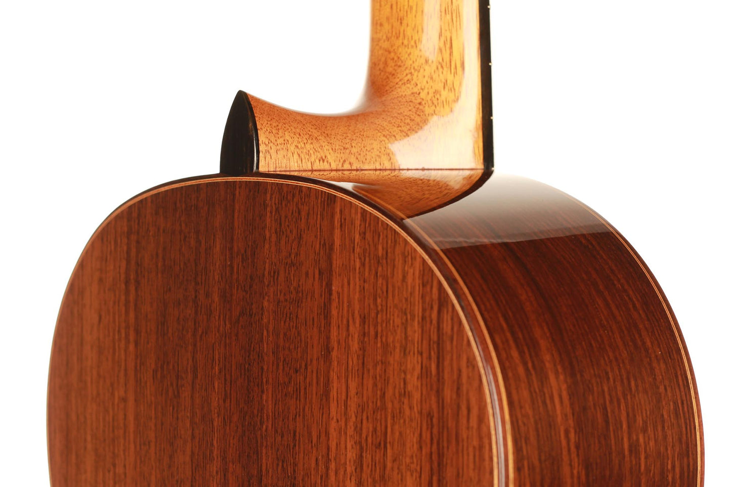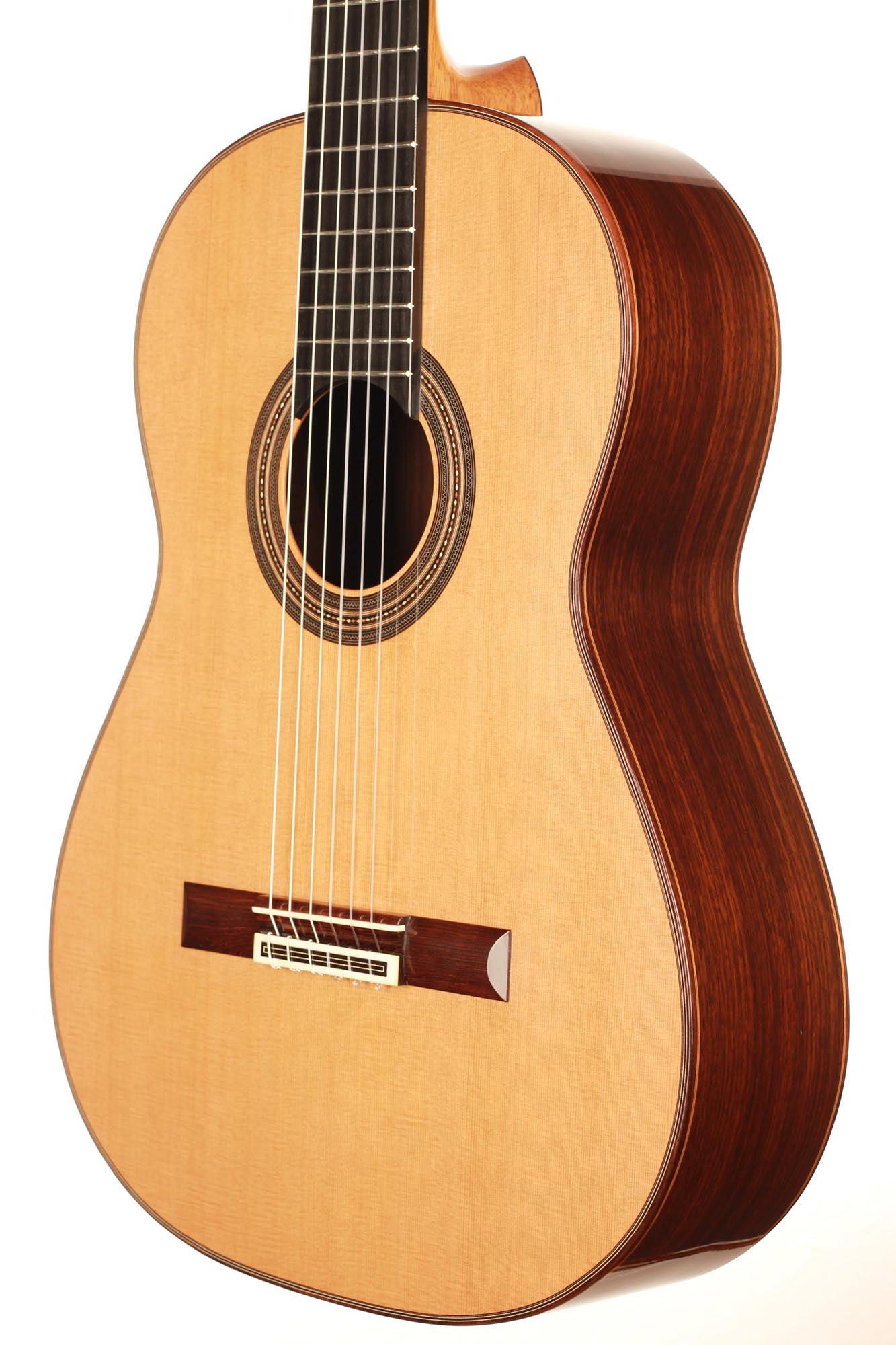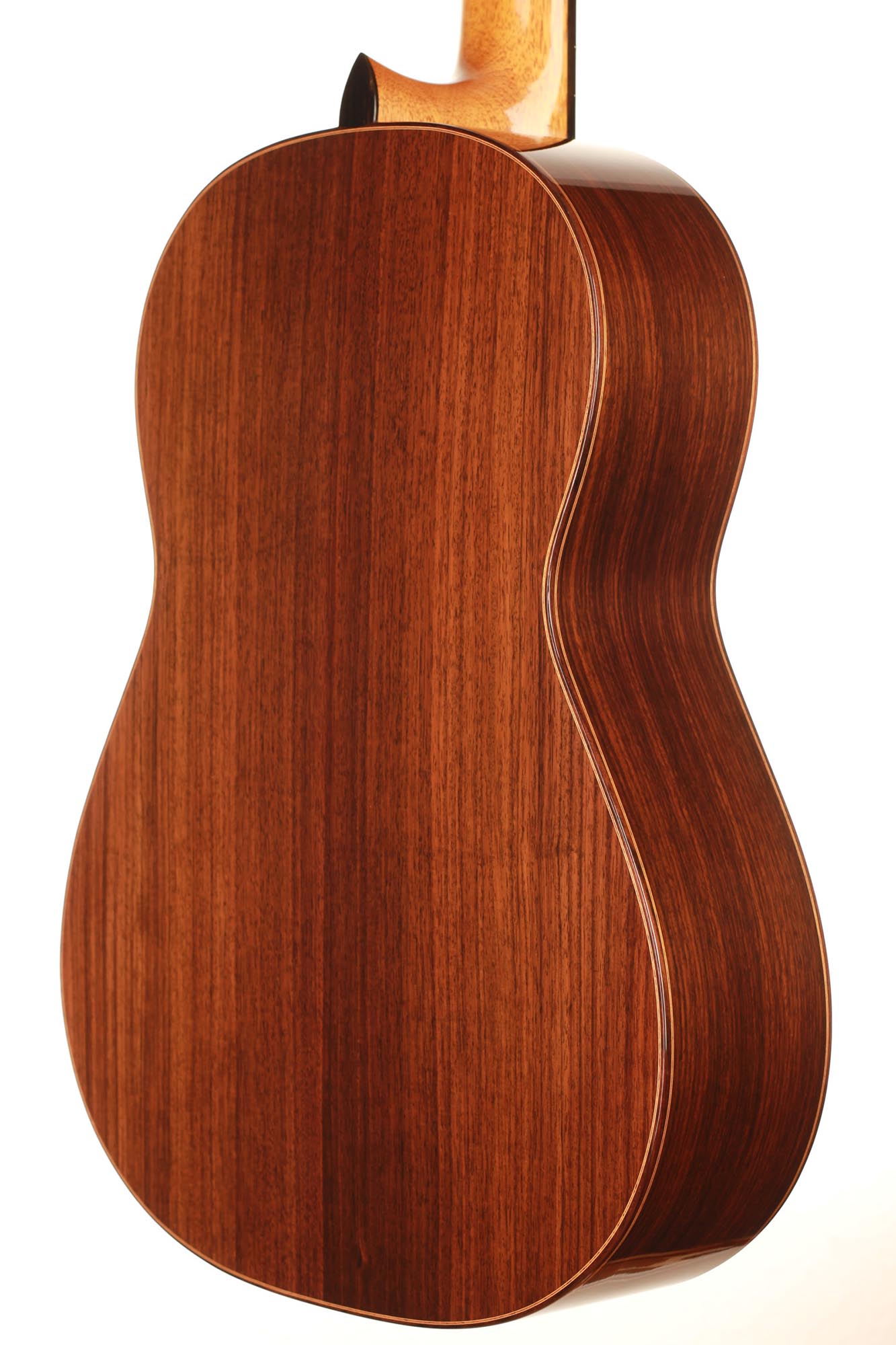 This beautiful new Lattice-cedar-top shows again the tremendous precision of Walter’s craftsmanship. The very fine marquetry as well as the perfect proportions of this instrument are outstanding. This guitar has a very warm and round tone, with wonderful singing trebles and a beautiful harmonic presence. The playability is marvellous and both right and left hand are pleased by the setup. It is a great master instrument and a fantastic concert guitar.