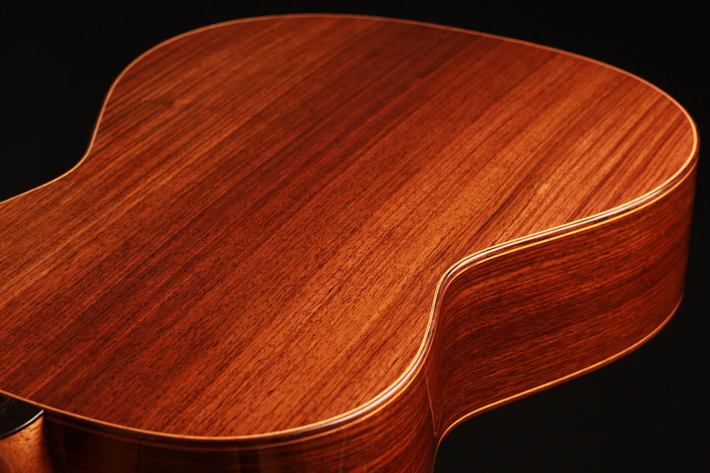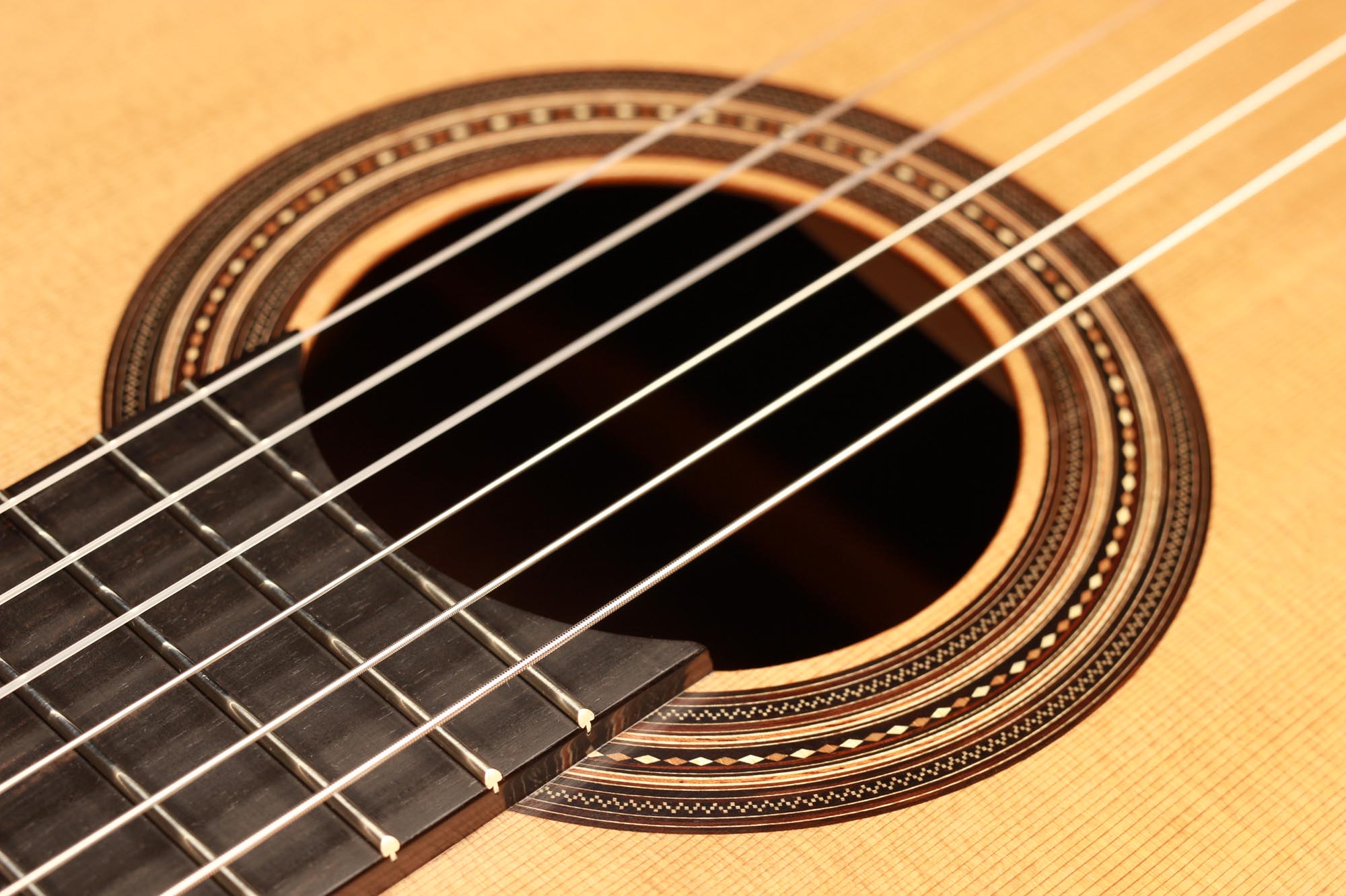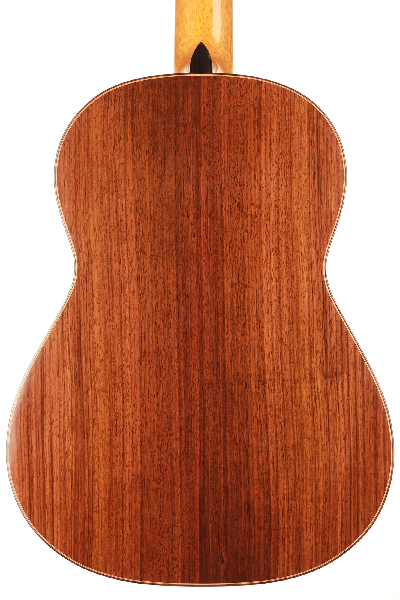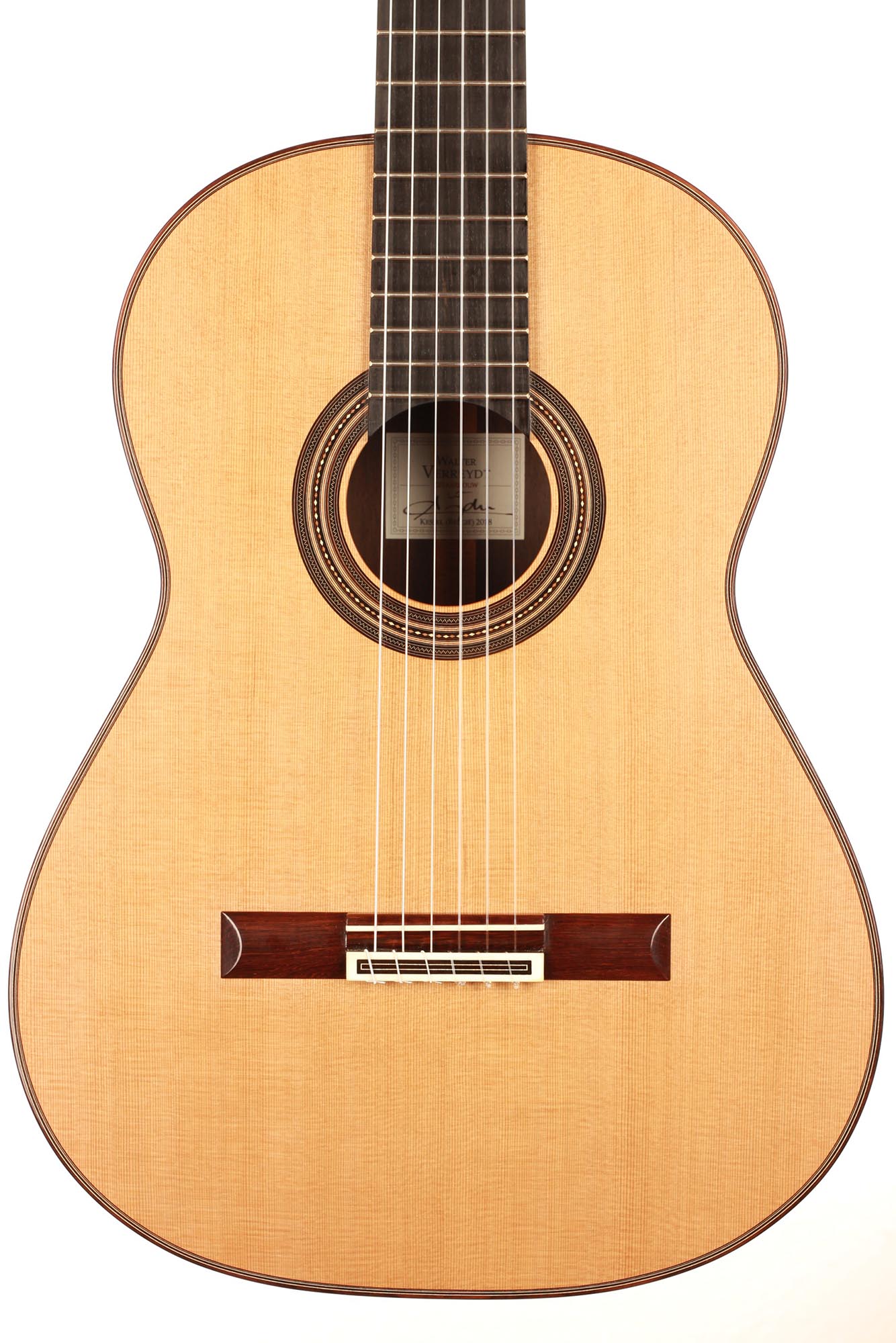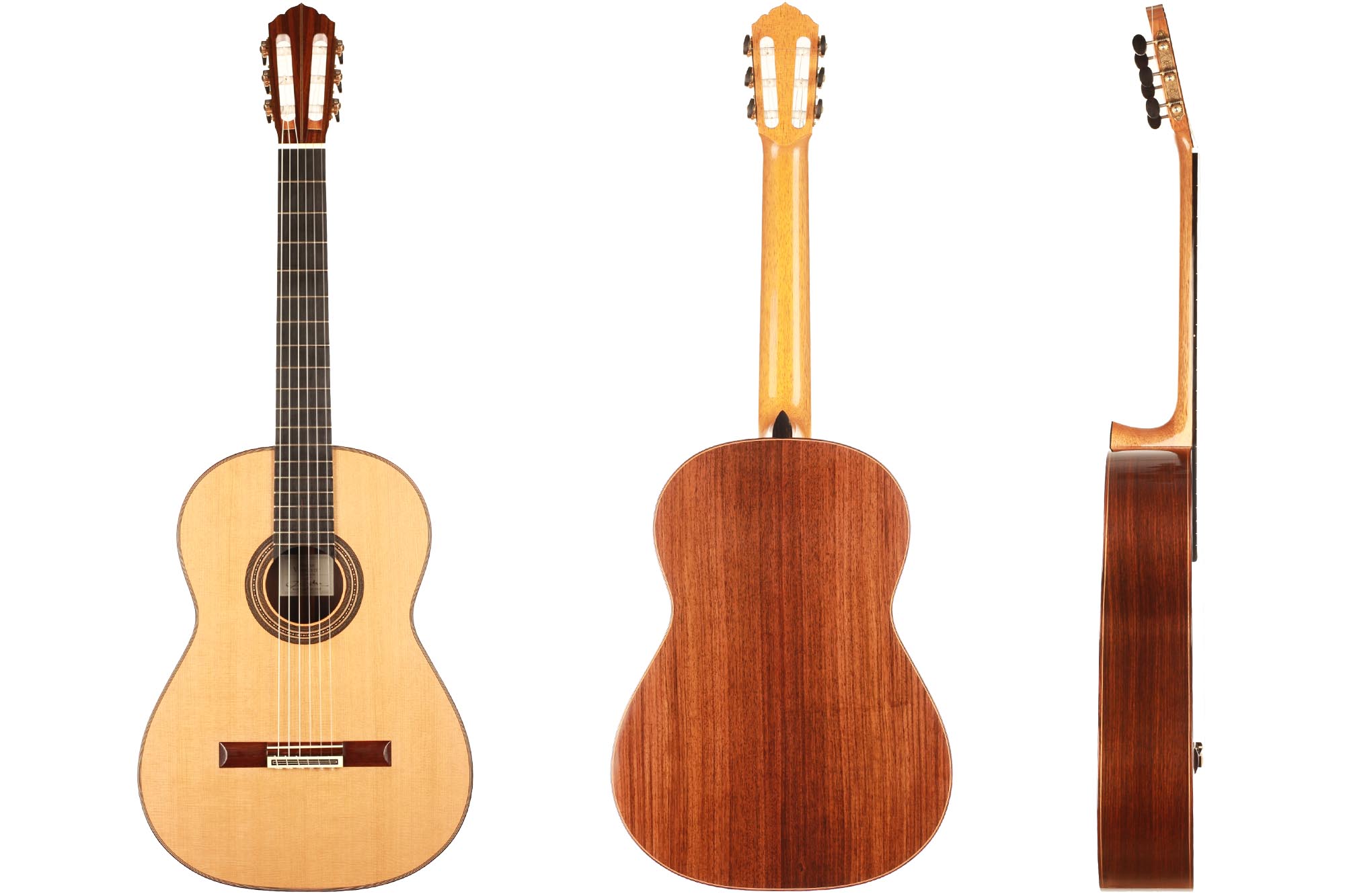 This beautiful new Lattice-cedar-top shows again the tremendous precision of Walter’s craftsmanship. The very fine marquetry as well as the perfect proportions of this instrument are outstanding. This guitar has a very warm and round tone, with wonderful singing trebles and a beautiful harmonic presence. The playability is marvellous and both right and left hand are pleased by the setup. It is a great master instrument and a fantastic concert guitar.
