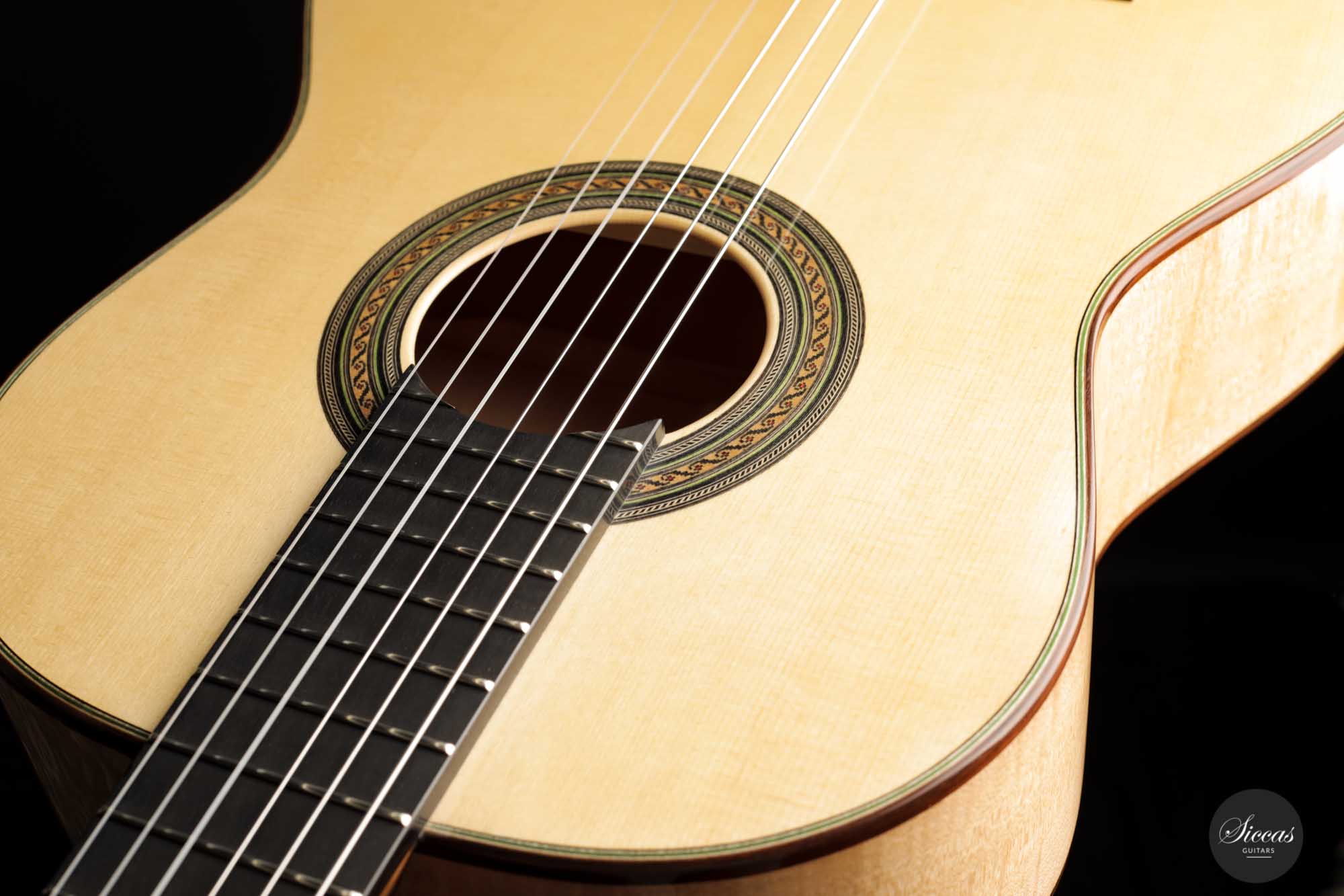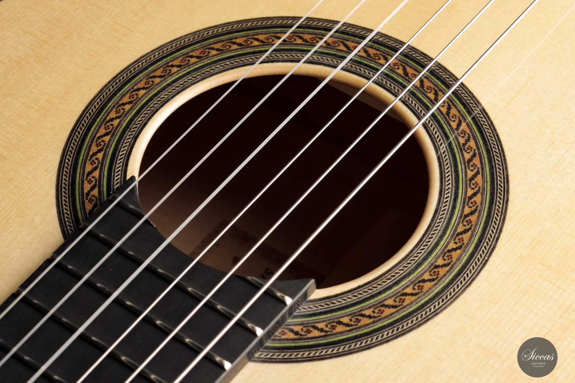 This impressive replica by Wolfgang Jellinghaus shows remarkable qualities. Inspired by the famous Manuel Ramirez guitar owned by Andrés Segovia from 1912, its design is faithful to the original, and its sound is also worth listening to. It develops an impressive volume of sound with a crisp and textured tonal character that supports the guitarist both in concert halls and on more intimate occasions. As is customary with Wolfgang Jellinghaus’ top-of-the-line models, this guitar is fully shellac polished and built with premium solid woods.