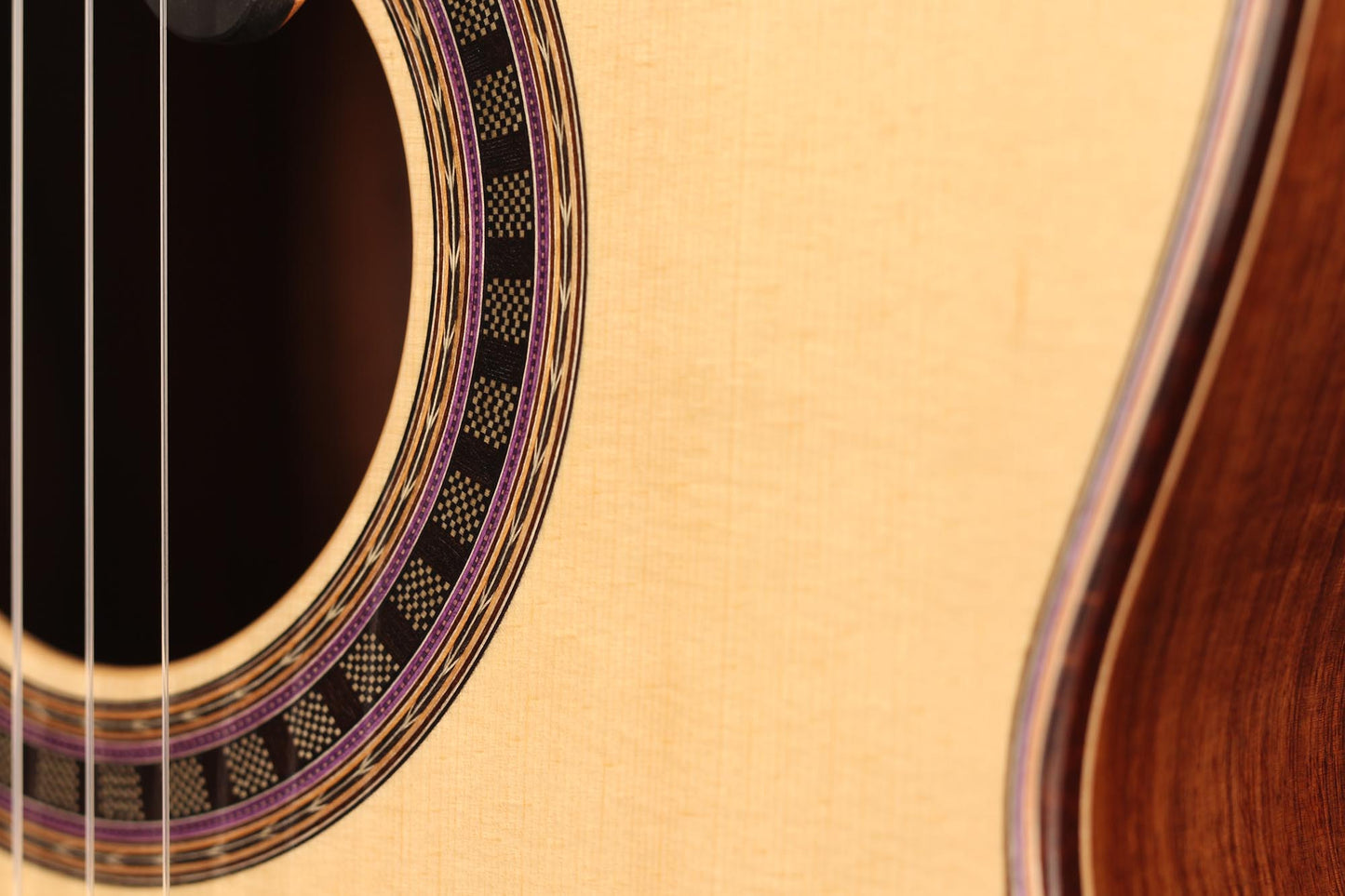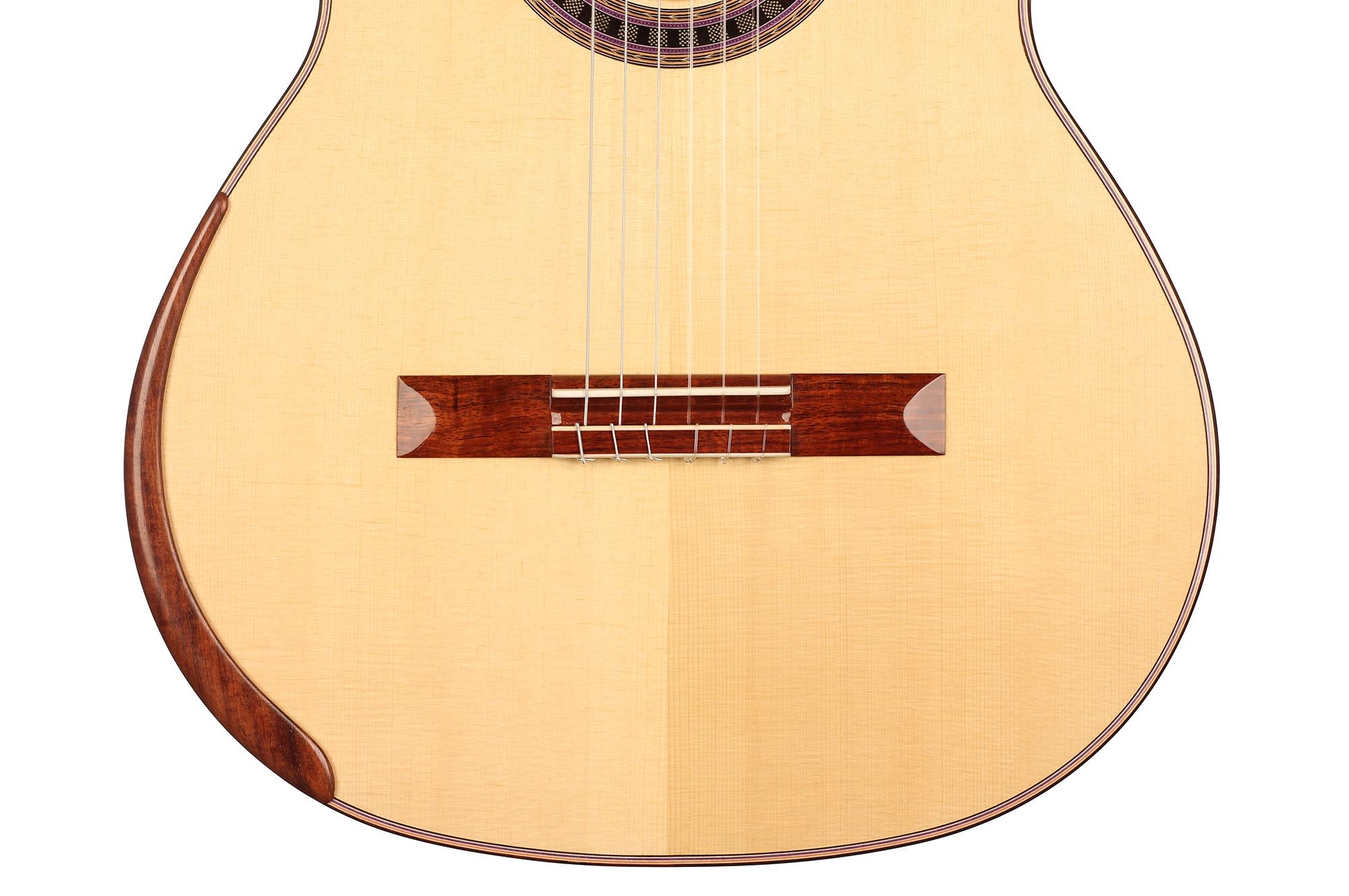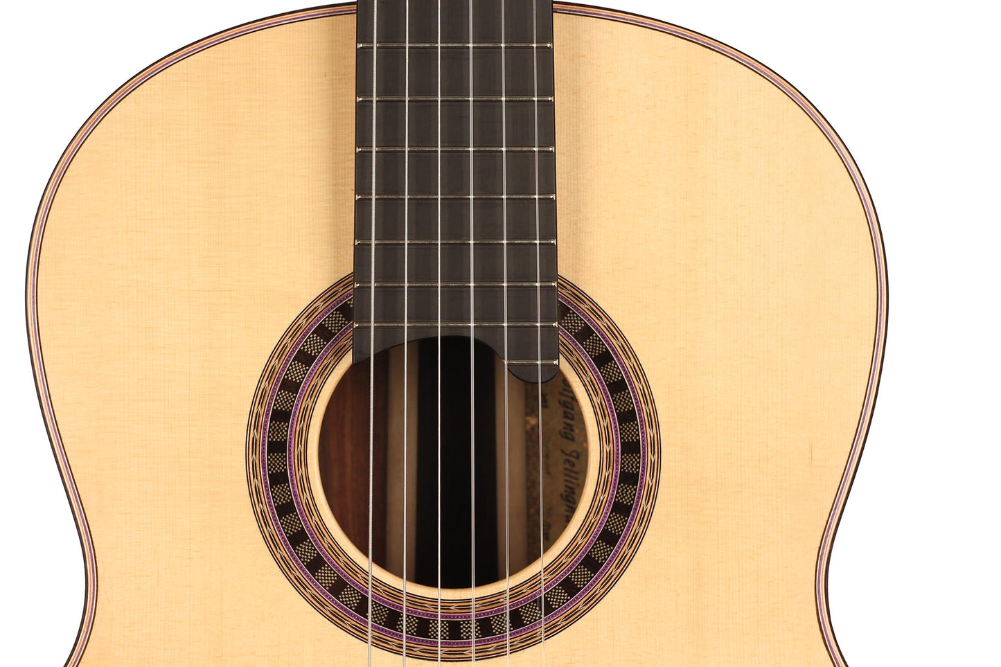 His latest series is the Wolfgang Jellinghaus Signature. This is a very modern guitar with some interesting features, such as the floating fingerboard, which is not fixed to the top, so this part of the top vibrates freely and contributes to the overall sound. The sound volume becomes very powerful, also thanks to the very light double-top construction. This makes it possible to produce a very full and room-filling tone with little effort of the right hand. Due to its 64cm scale, it is particularly easy to play, and the armrest also contributes to the overall comfort. The guitar is finished with shellac which completes the overall picture of this instrument very nicely. In this price category, the guitar is more than convincing.