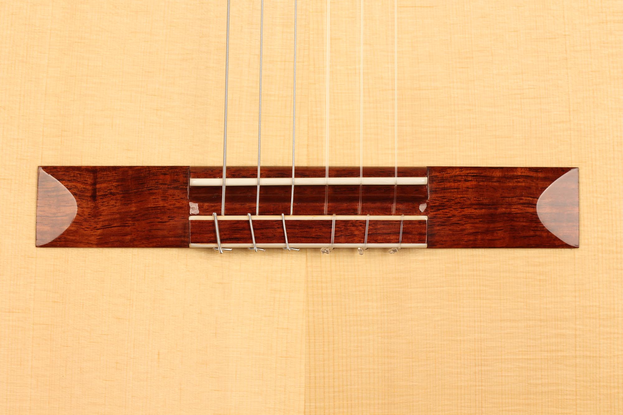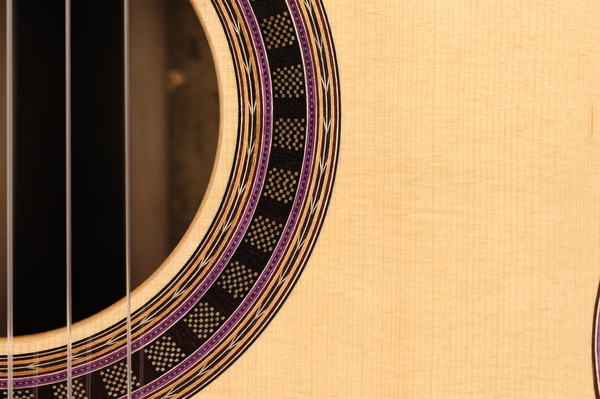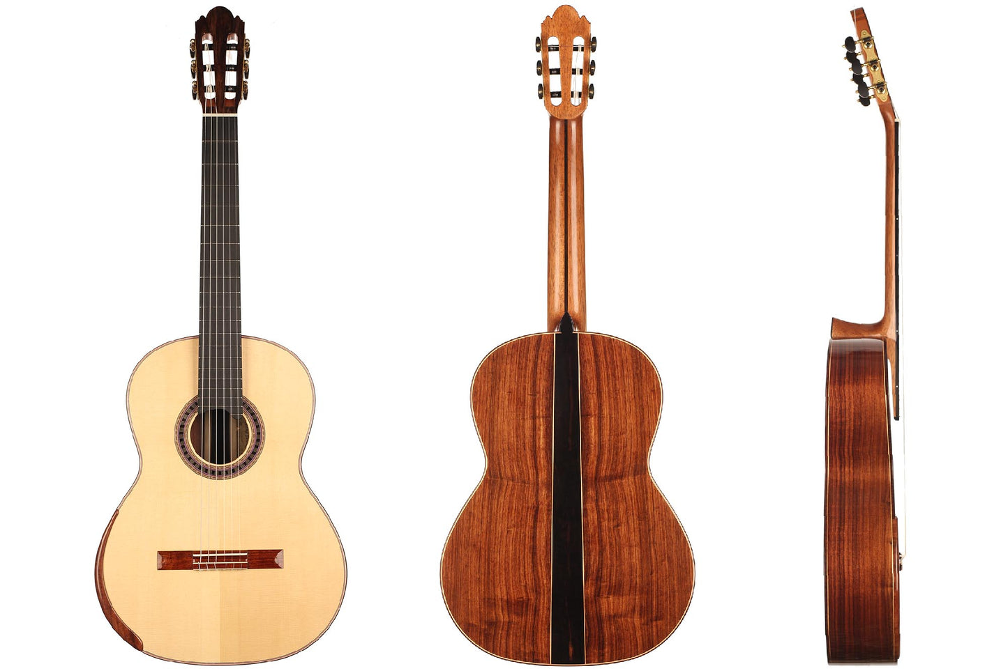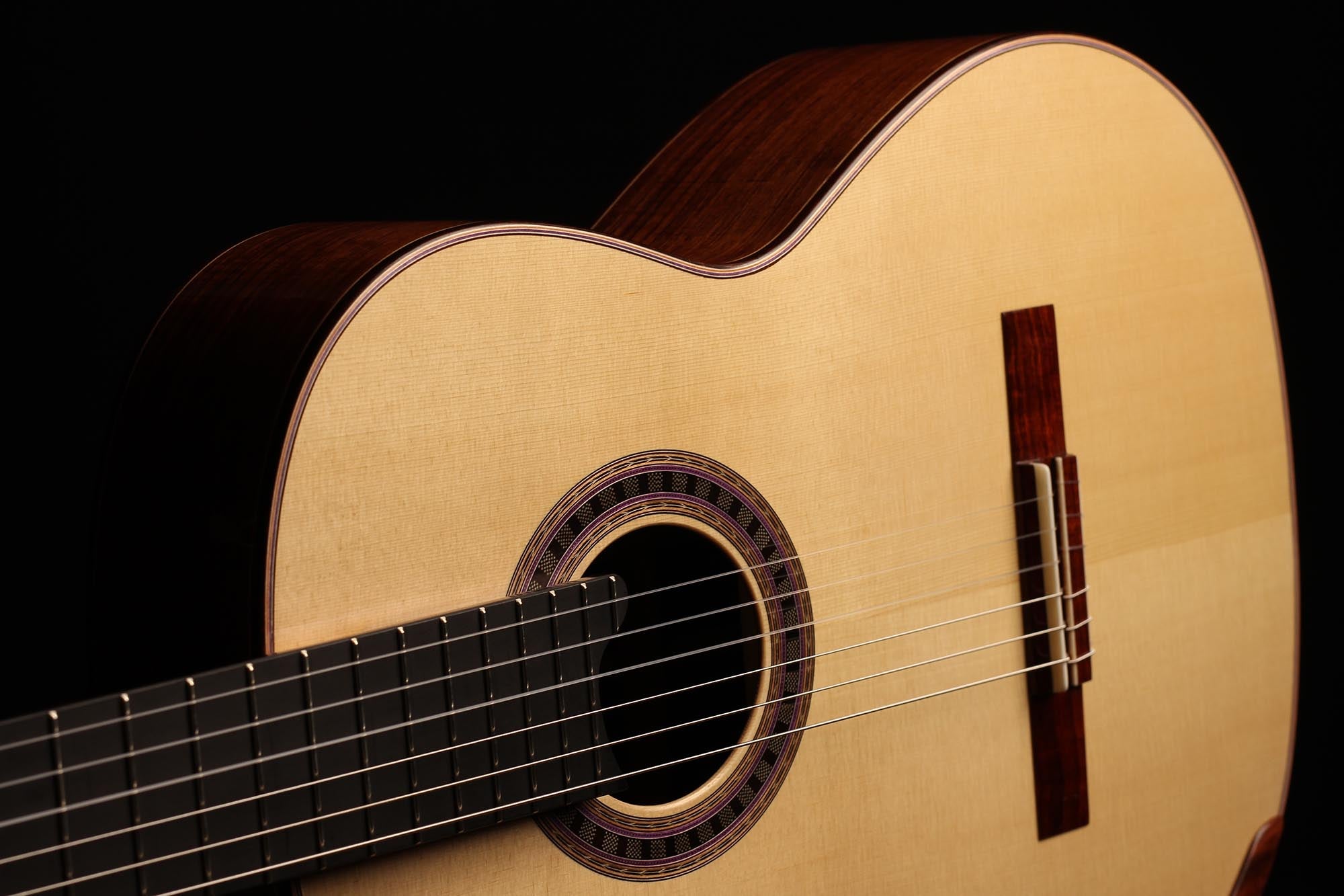 His latest series is the Wolfgang Jellinghaus Signature. This is a very modern guitar with some interesting features, such as the floating fingerboard, which is not fixed to the top, so this part of the top vibrates freely and contributes to the overall sound. The sound volume becomes very powerful, also thanks to the very light double-top construction. This makes it possible to produce a very full and room-filling tone with little effort of the right hand. Due to its 64cm scale, it is particularly easy to play, and the armrest also contributes to the overall comfort. The guitar is finished with shellac which completes the overall picture of this instrument very nicely. In this price category, the guitar is more than convincing.