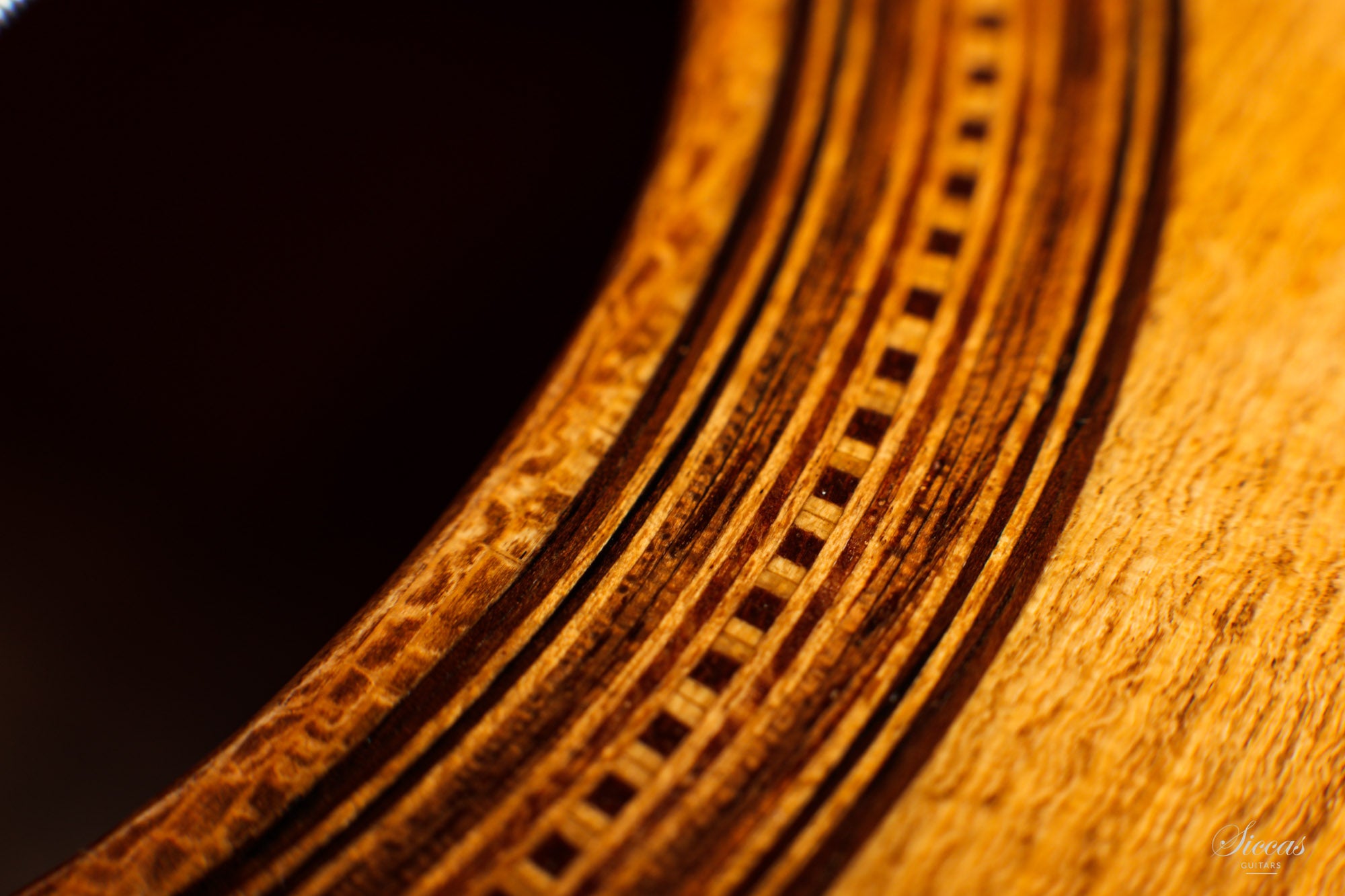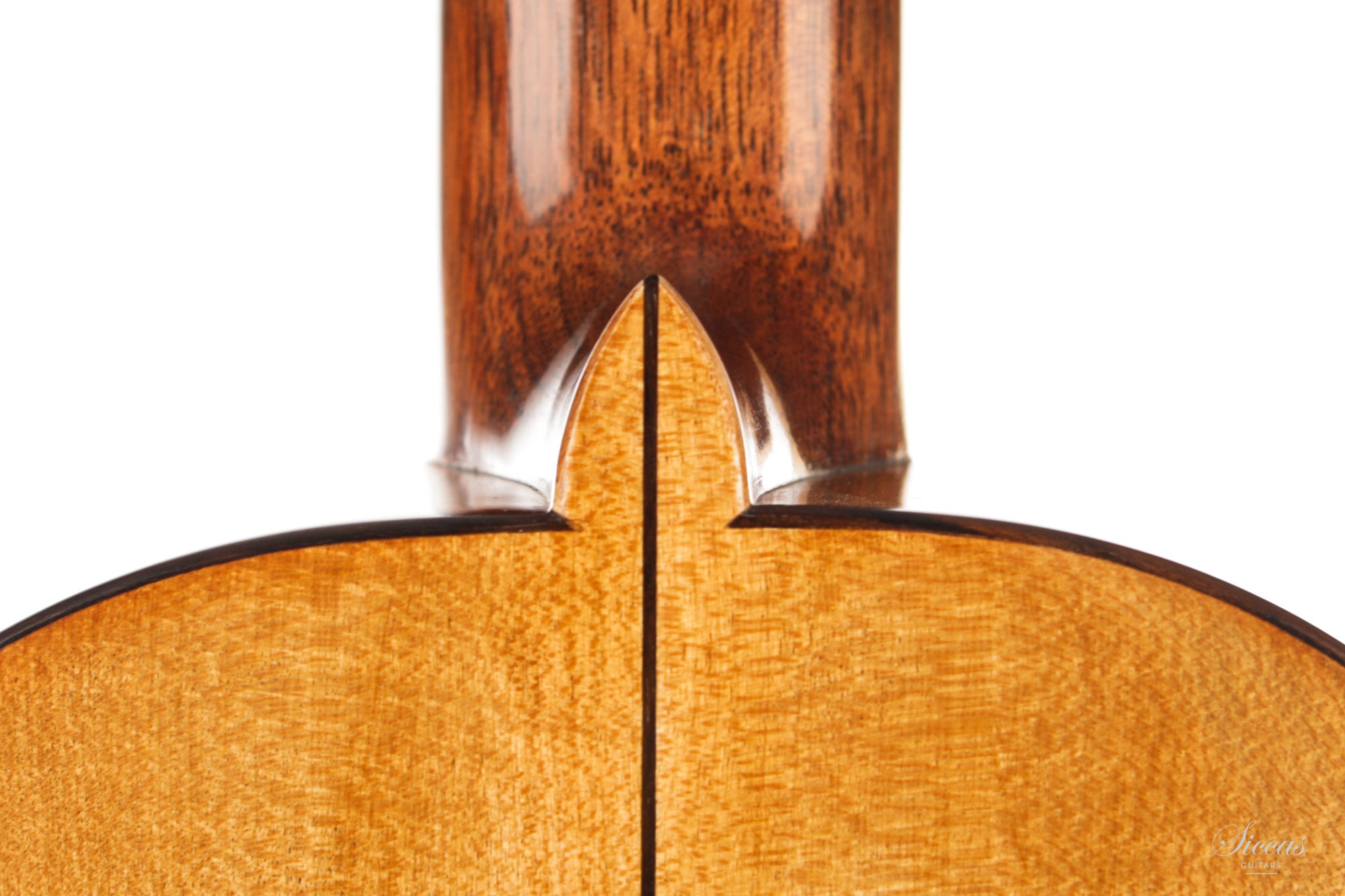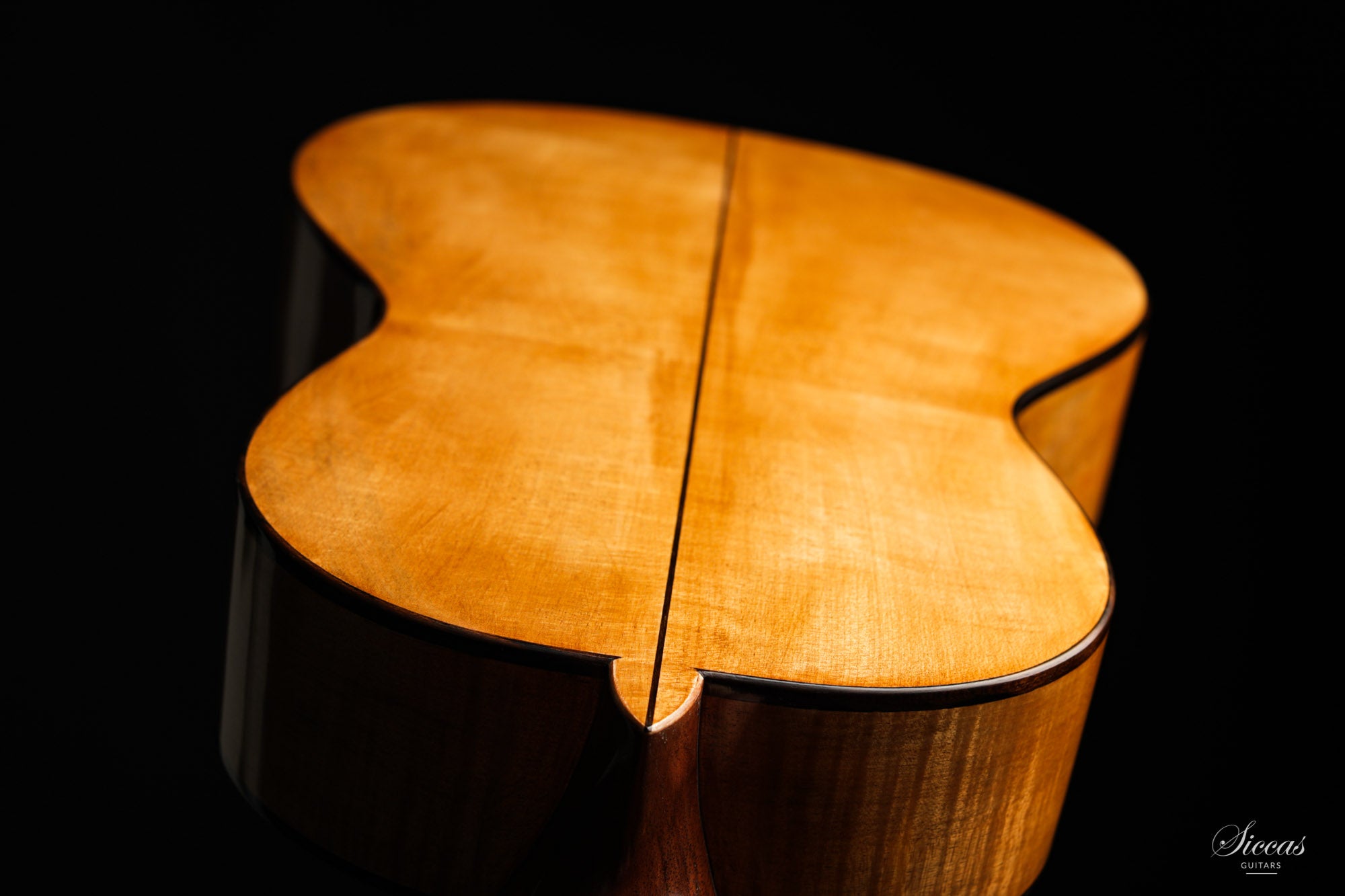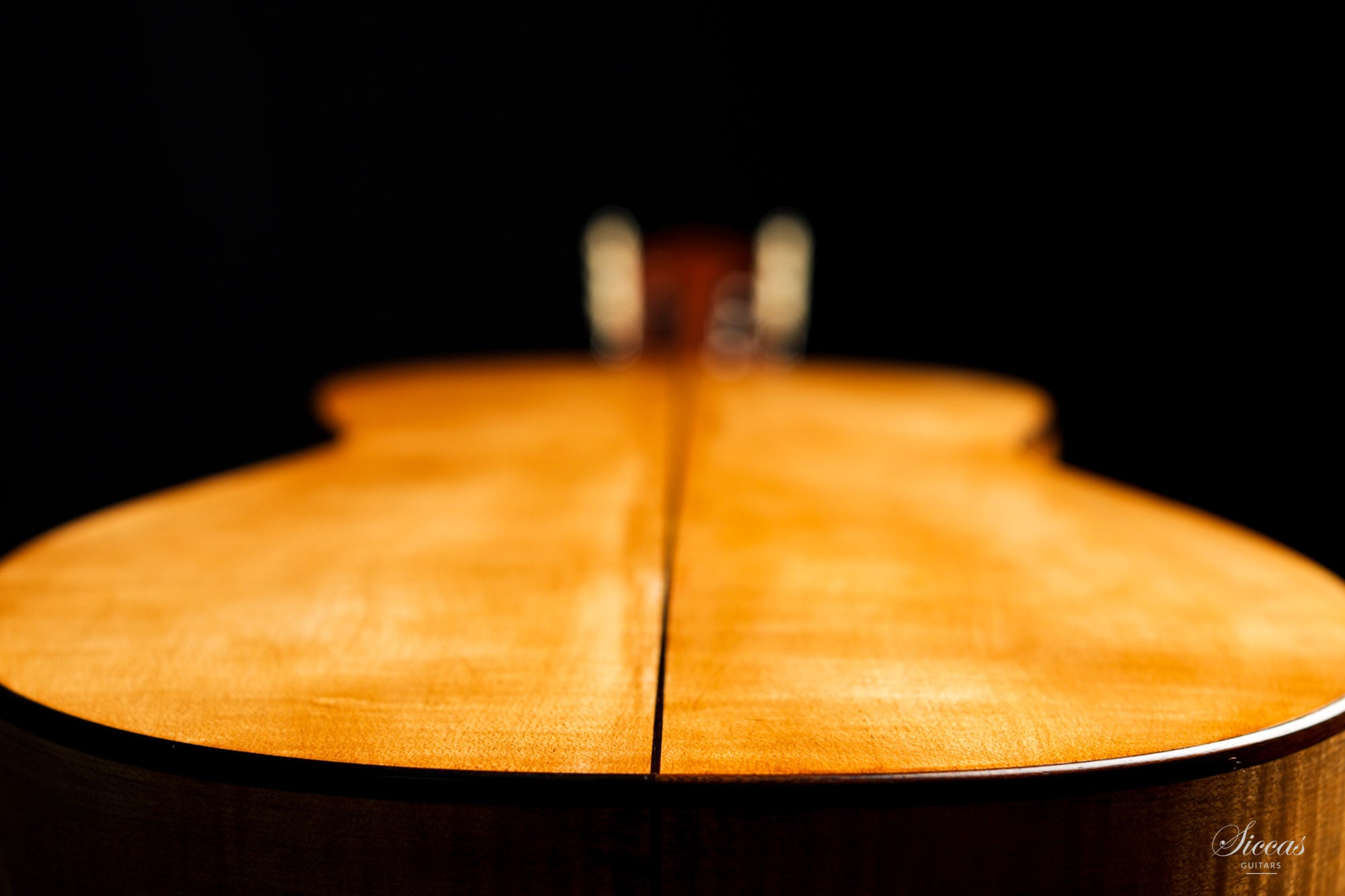 It is a real joy to play this guitar, what an exciting and inspiring instrument. When we took the guitar in our hands for the first time, we were all more than amazed about the full and appealing sound that emerges from a guitar with such a relatively small body. Crystal clear trebles with responsive basses produce a smooth, sweet sound with a reminiscence of historical instruments. Maple back and sides paired with an aesthetically aged top make for a responsive instrument where the player can actually sense the feedback. This magnificent Torres model is equipped with modern machine heads instead of pegs, which makes it much easier to tune, but still fits into the overall picture.