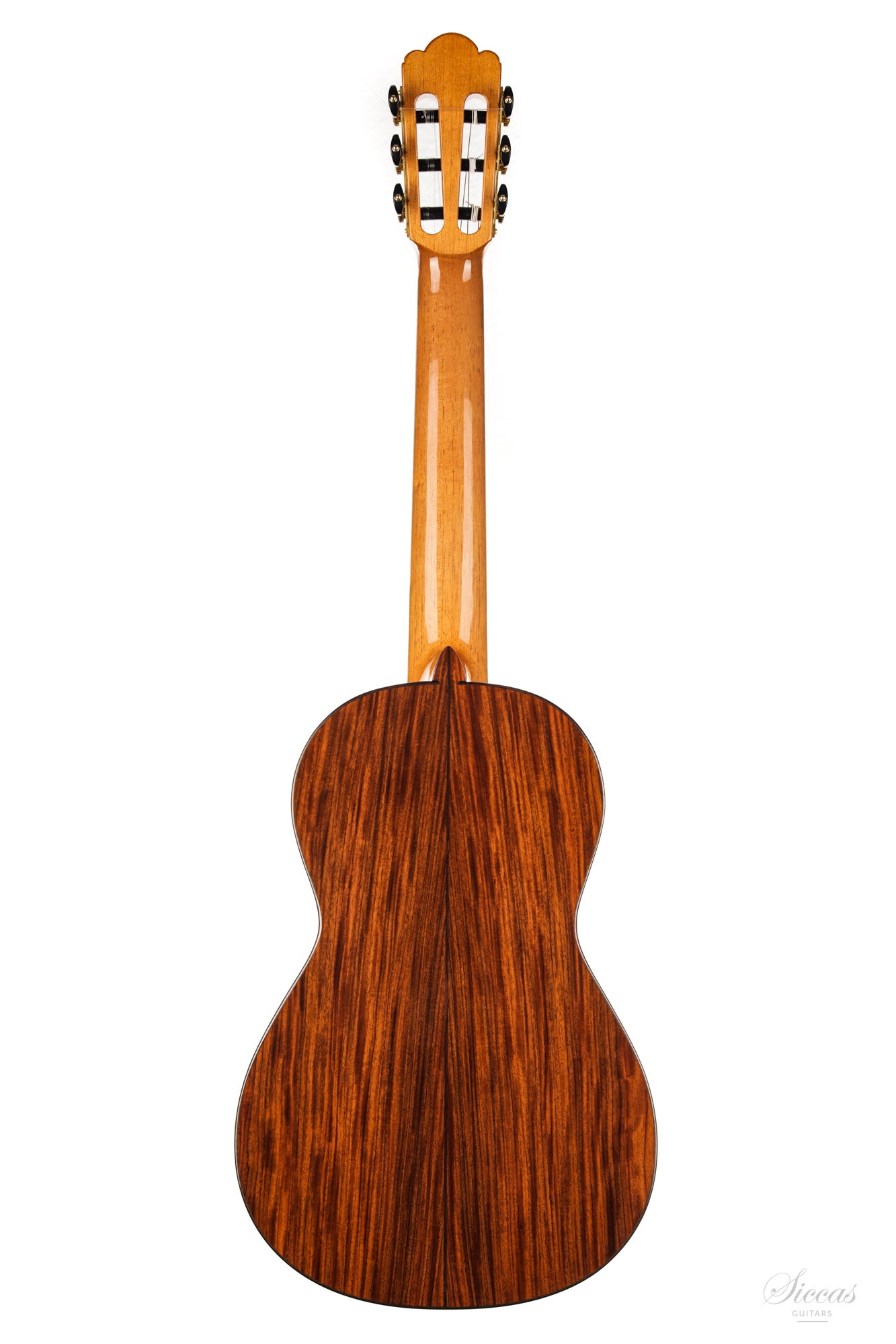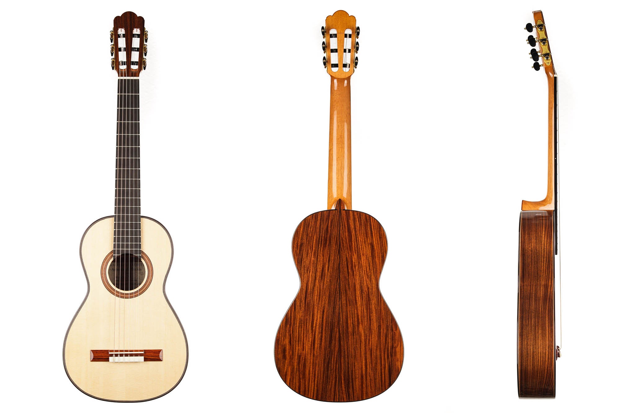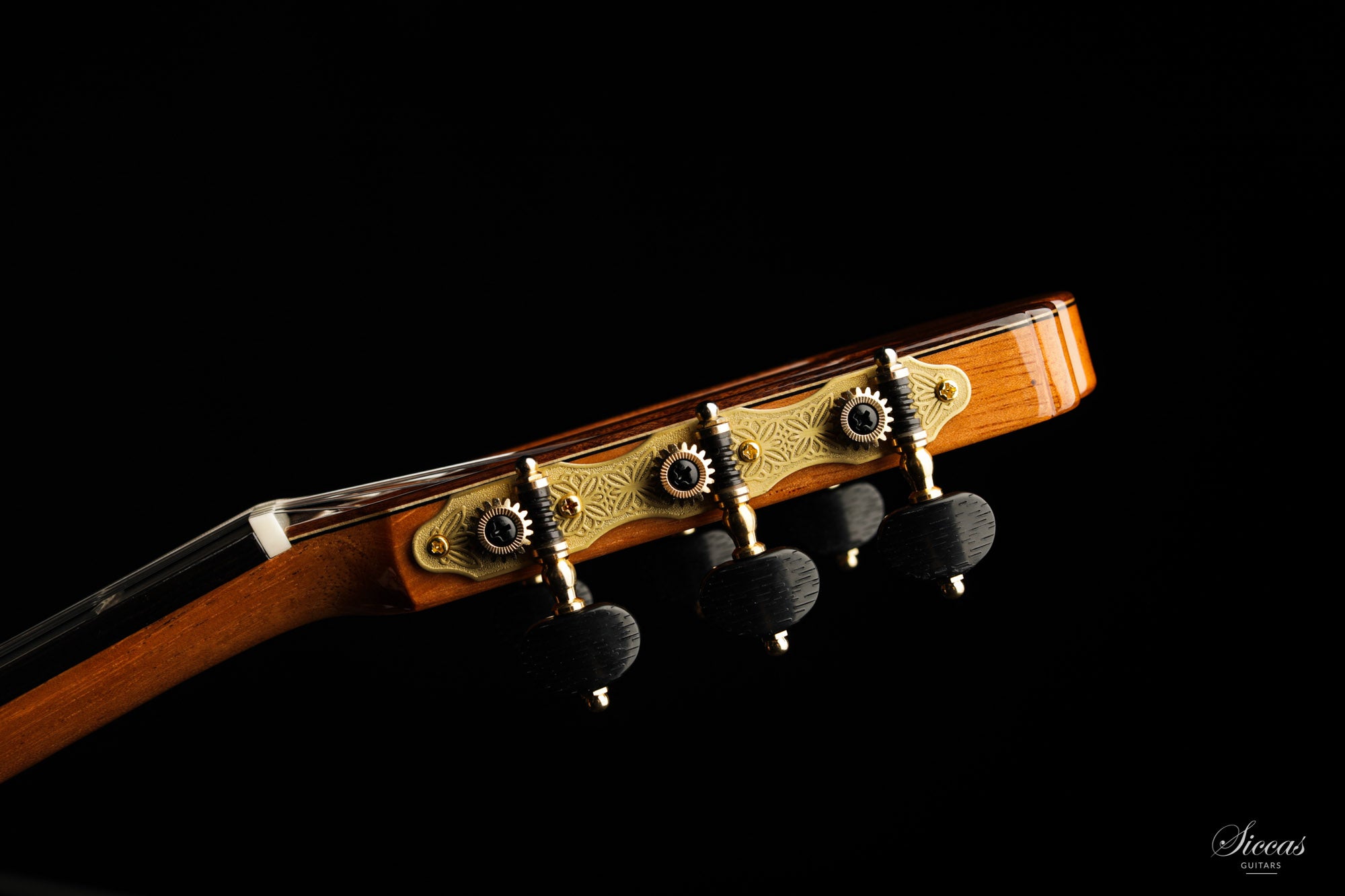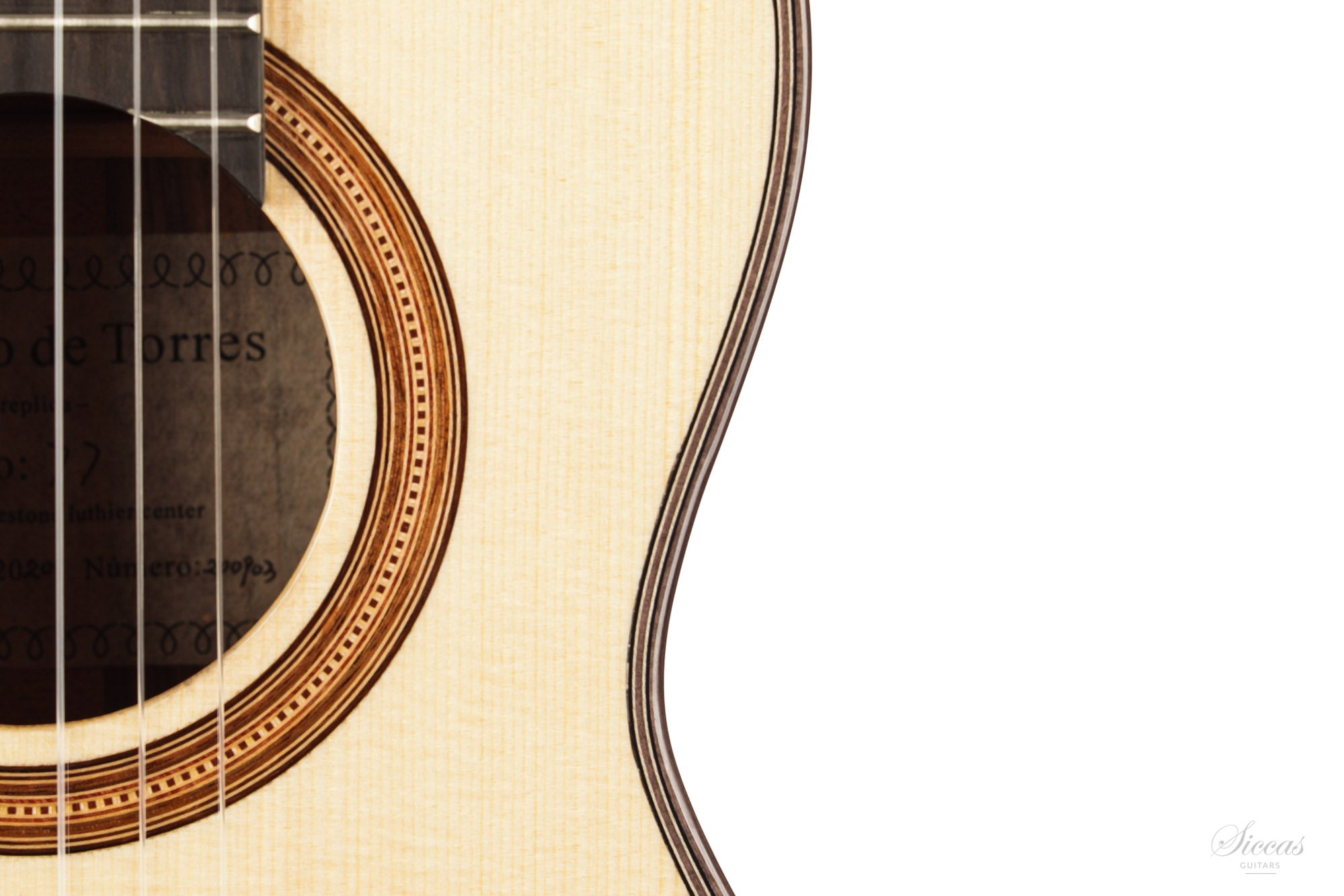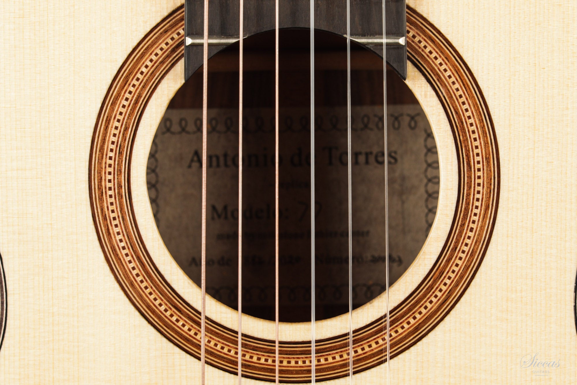 Es ist eine wahre Freude diese schöne „Torres 77“ zu spielen. Dieses Modell hat einen kleineren Korpus und bietet ein einzigartiges Spielerlebnis. Sie ist leicht, reaktionsschnell und hat ein überraschend großes Klangvolumen. Für dieses handgefertigte „Torres 77“-Opus wurden Boden und Zargen aus Grandillo und ein Hochglanz-PU-Finish gewählt. Außerdem ist die Fichtendecke von hervorragender Qualität und hat eine sehr schöne gehaselte Maserung.