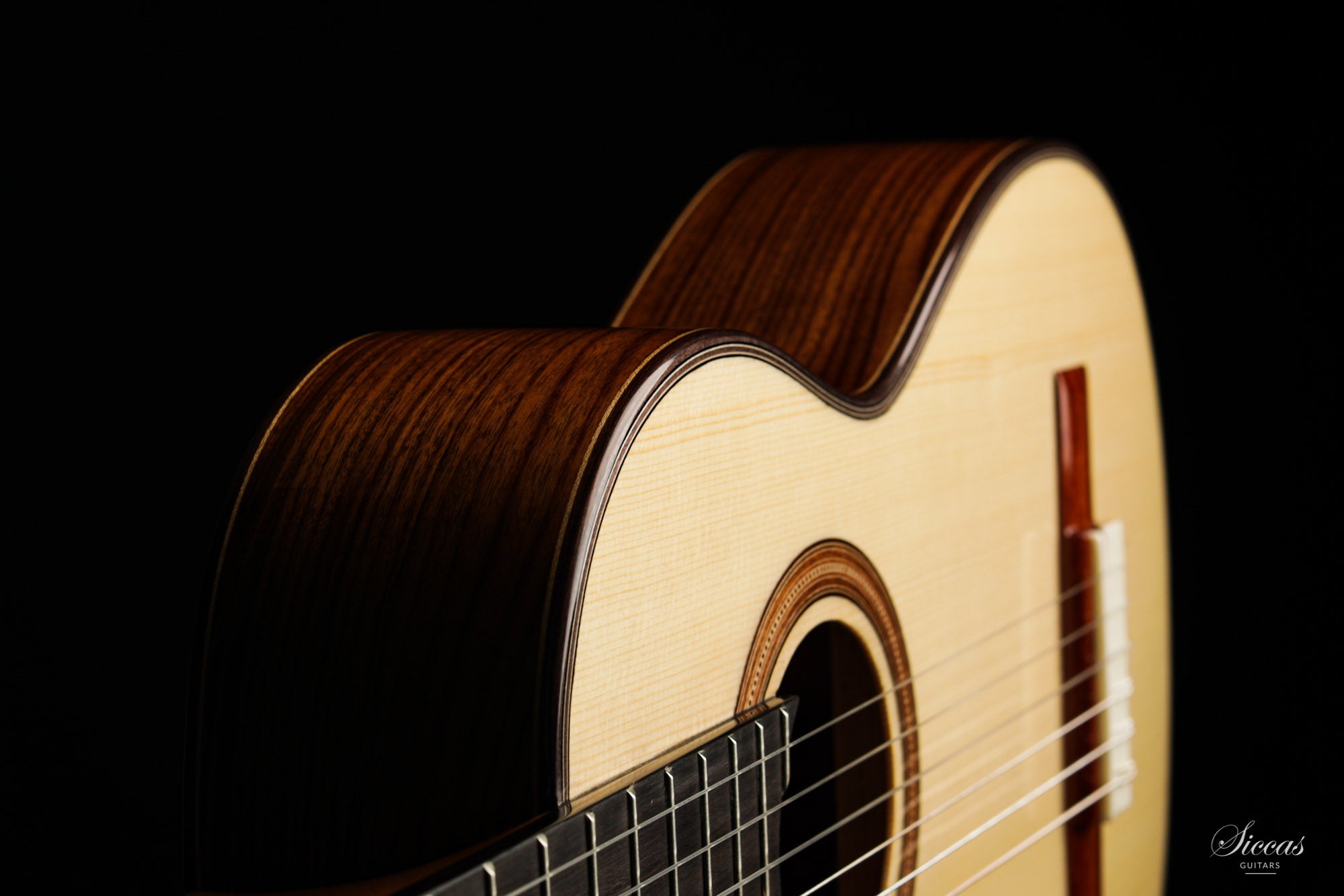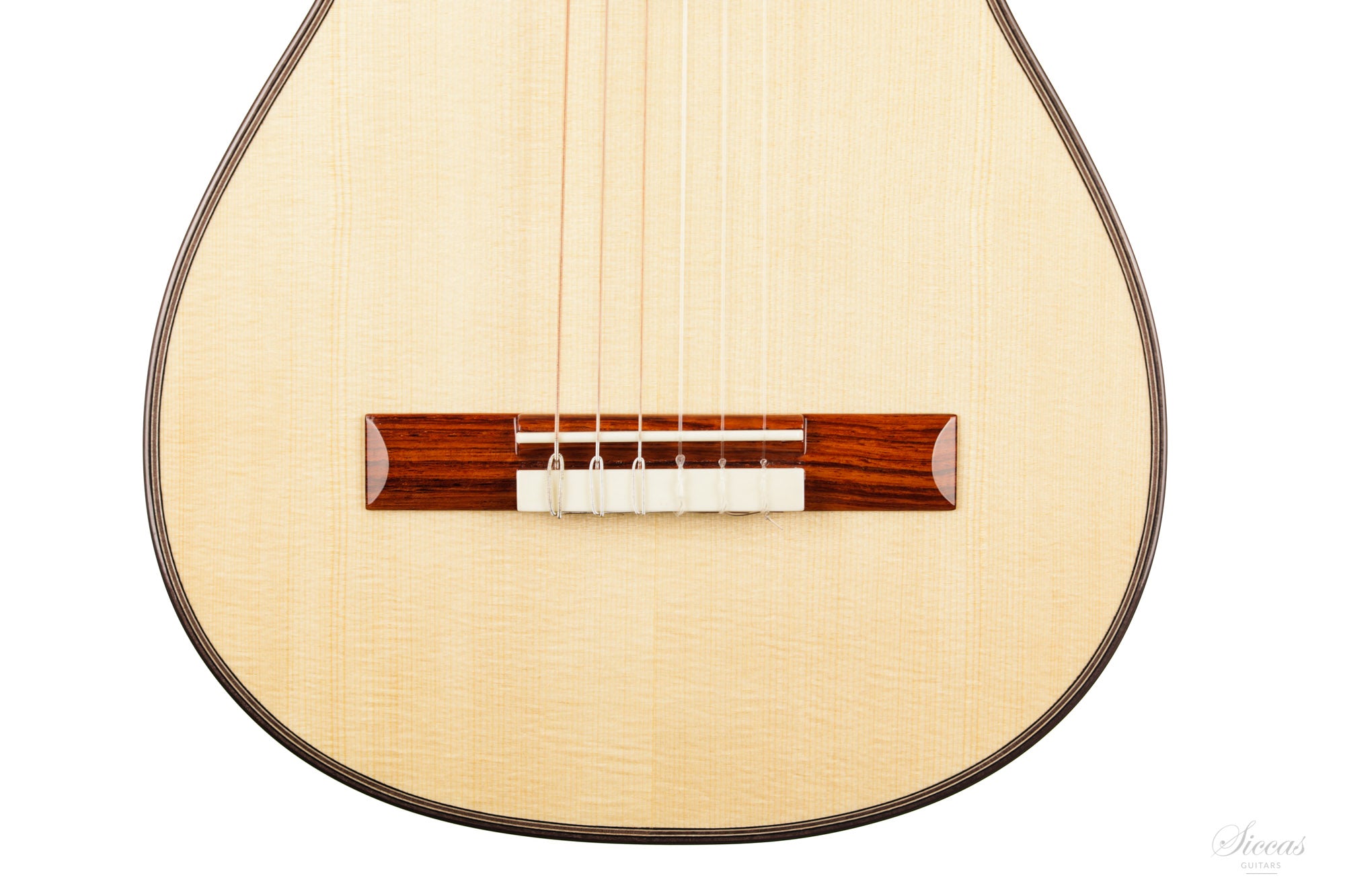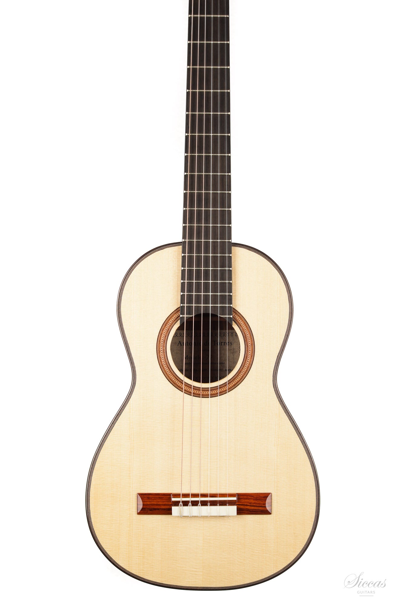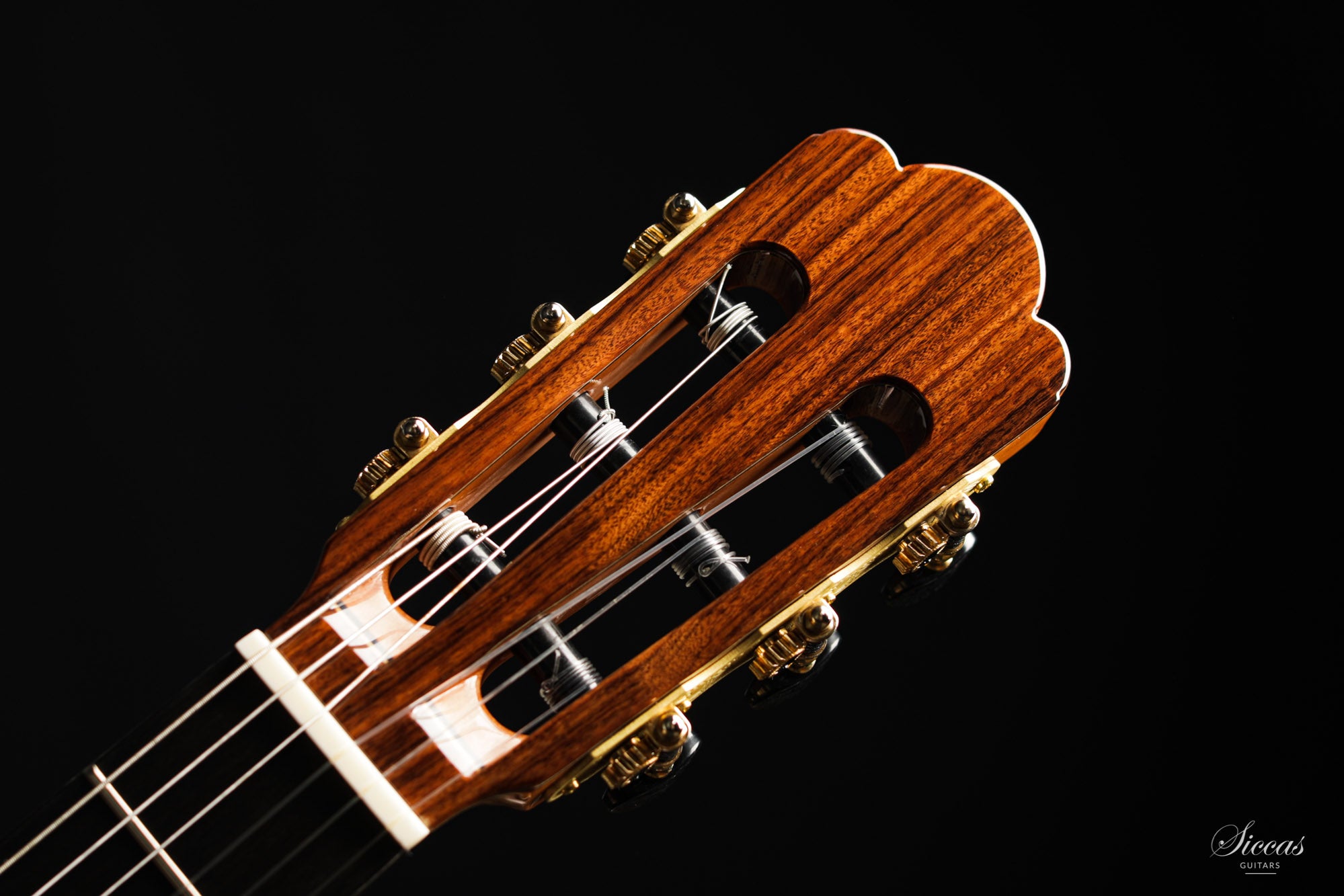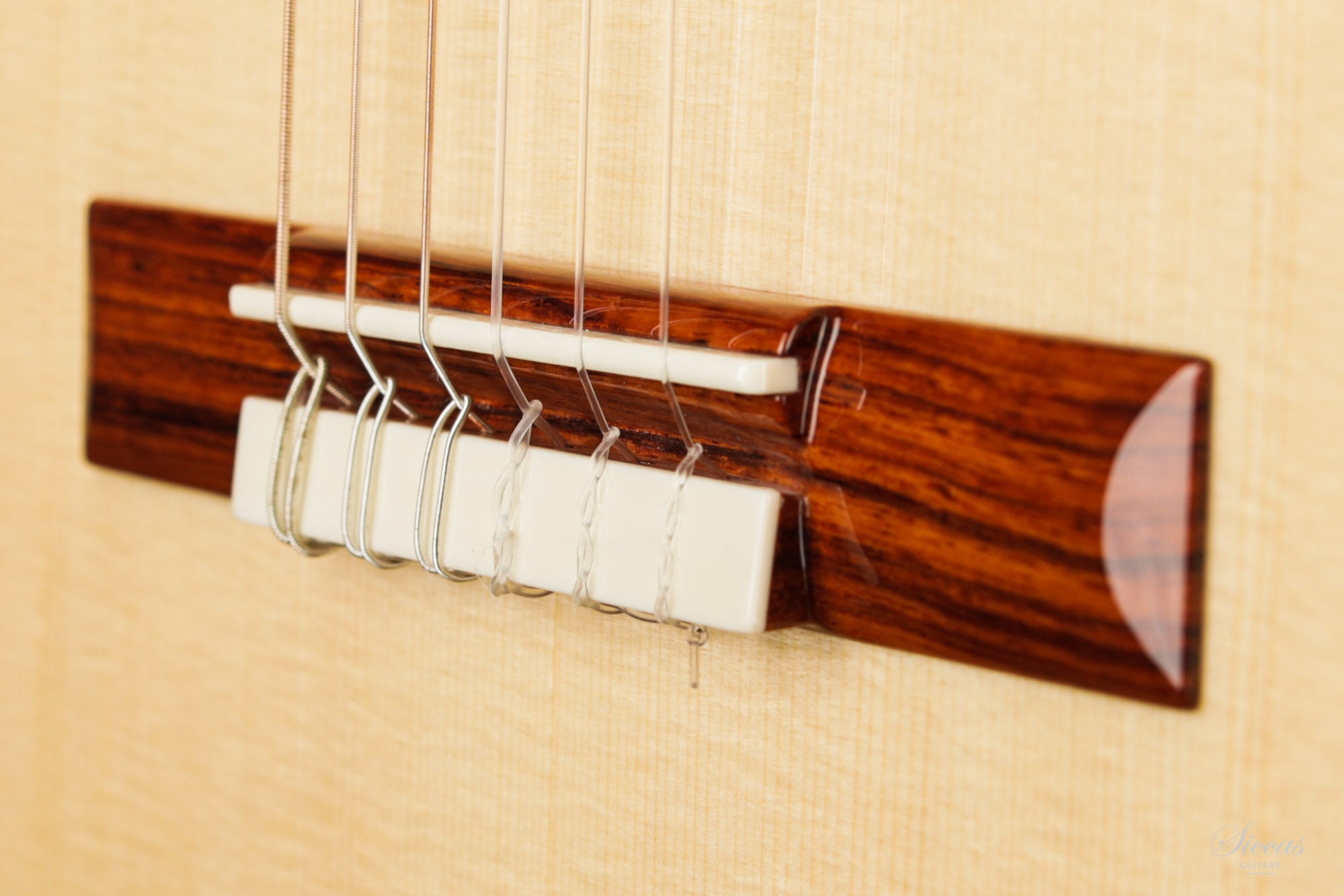 Es ist eine wahre Freude diese schöne „Torres 77“ zu spielen. Dieses Modell hat einen kleineren Korpus und bietet ein einzigartiges Spielerlebnis. Sie ist leicht, reaktionsschnell und hat ein überraschend großes Klangvolumen. Für dieses handgefertigte „Torres 77“-Opus wurden Boden und Zargen aus Grandillo und ein Hochglanz-PU-Finish gewählt. Außerdem ist die Fichtendecke von hervorragender Qualität und hat eine sehr schöne gehaselte Maserung.