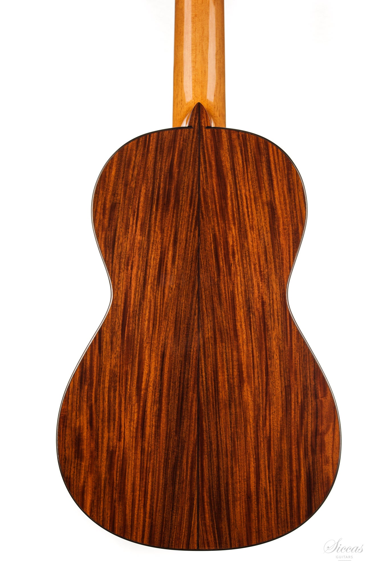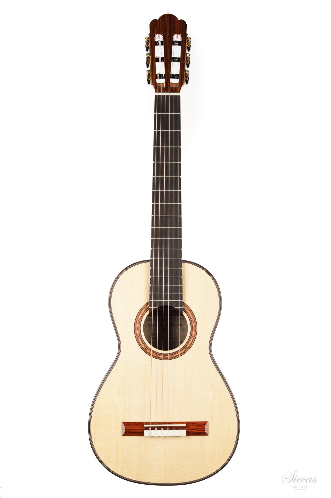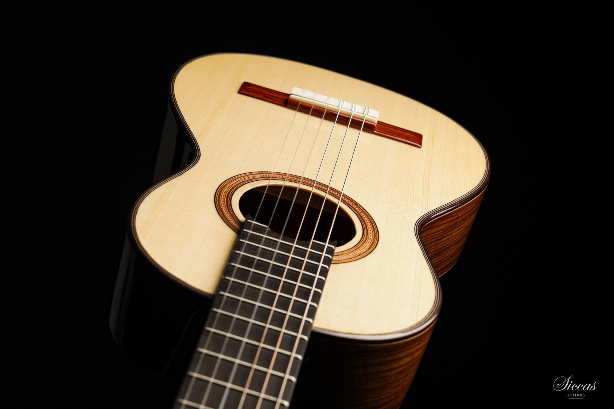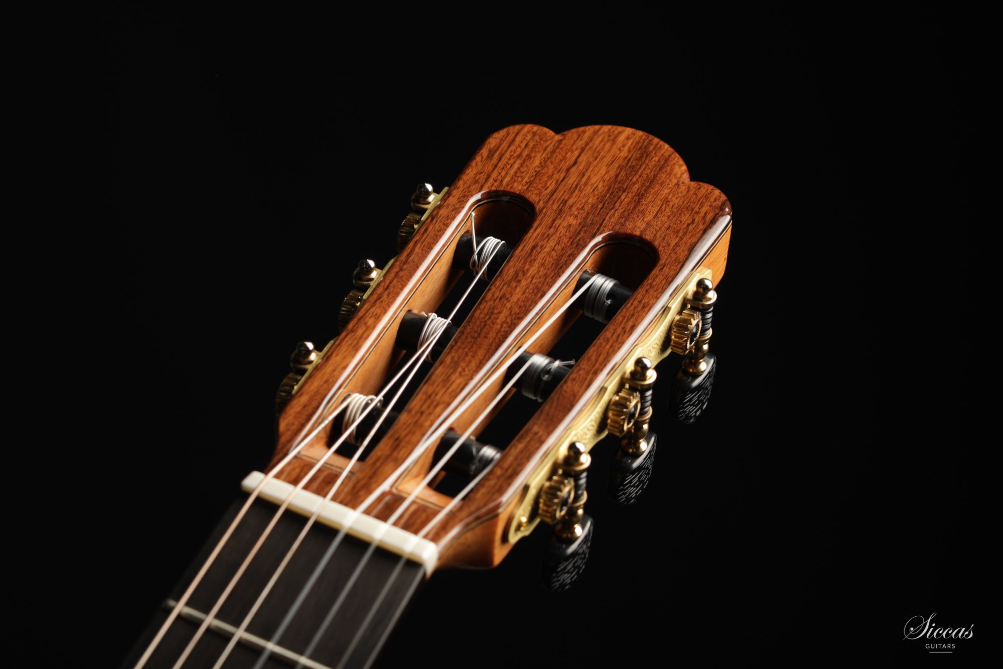 Es ist eine wahre Freude diese schöne „Torres 77“ zu spielen. Dieses Modell hat einen kleineren Korpus und bietet ein einzigartiges Spielerlebnis. Sie ist leicht, reaktionsschnell und hat ein überraschend großes Klangvolumen. Für dieses handgefertigte „Torres 77“-Opus wurden Boden und Zargen aus Grandillo und ein Hochglanz-PU-Finish gewählt. Außerdem ist die Fichtendecke von hervorragender Qualität und hat eine sehr schöne gehaselte Maserung.