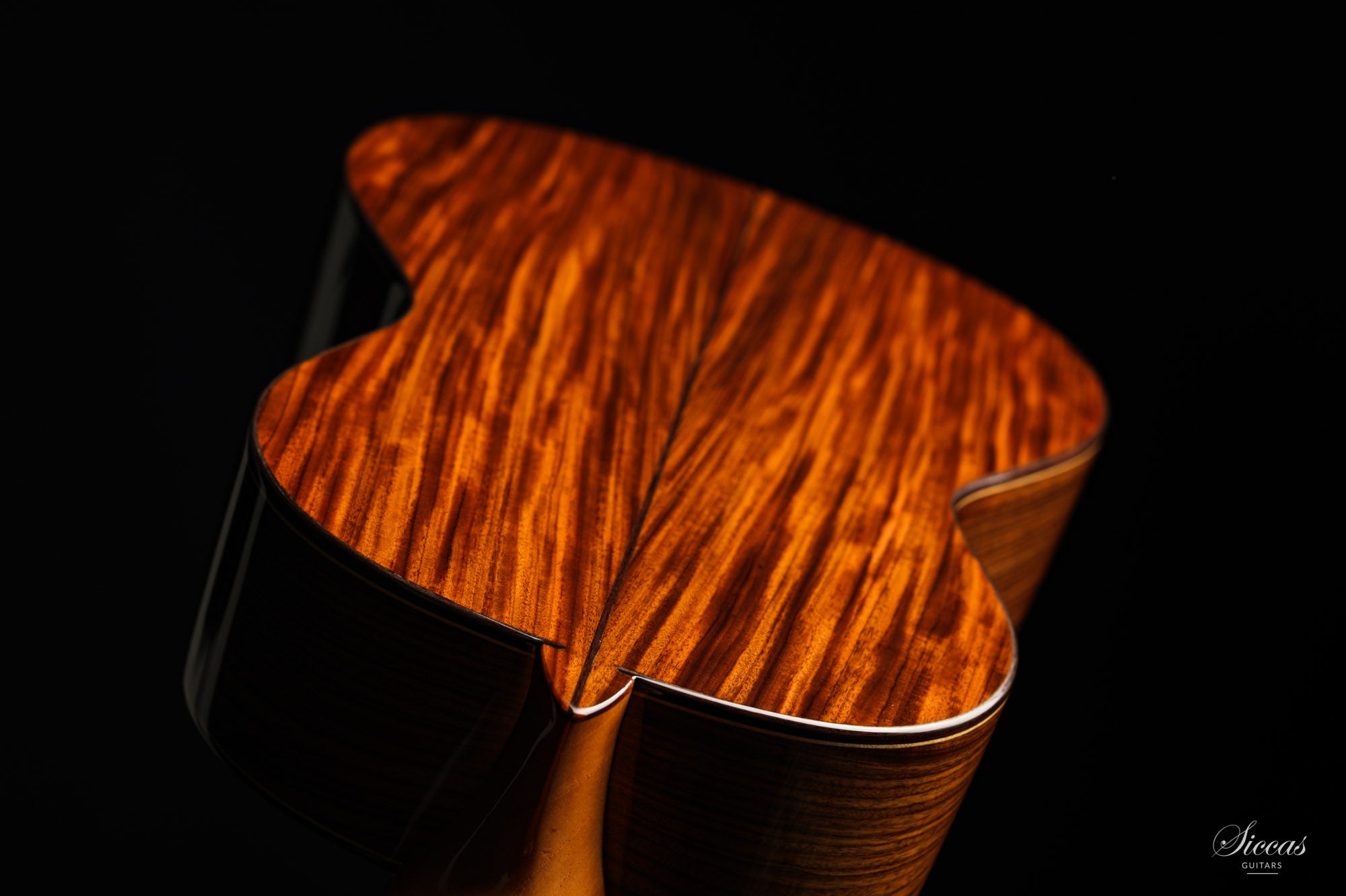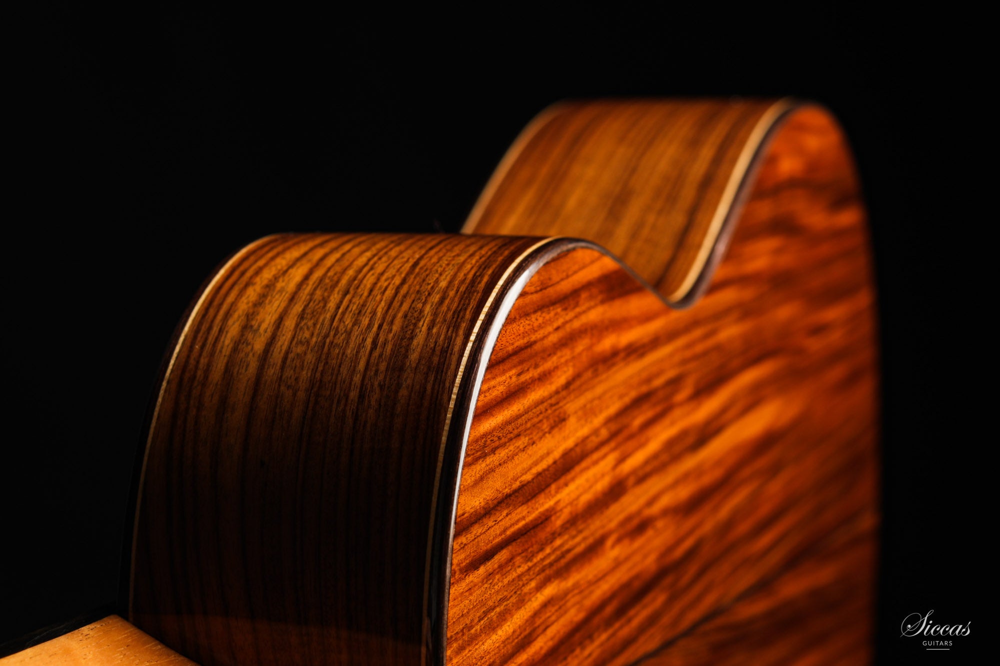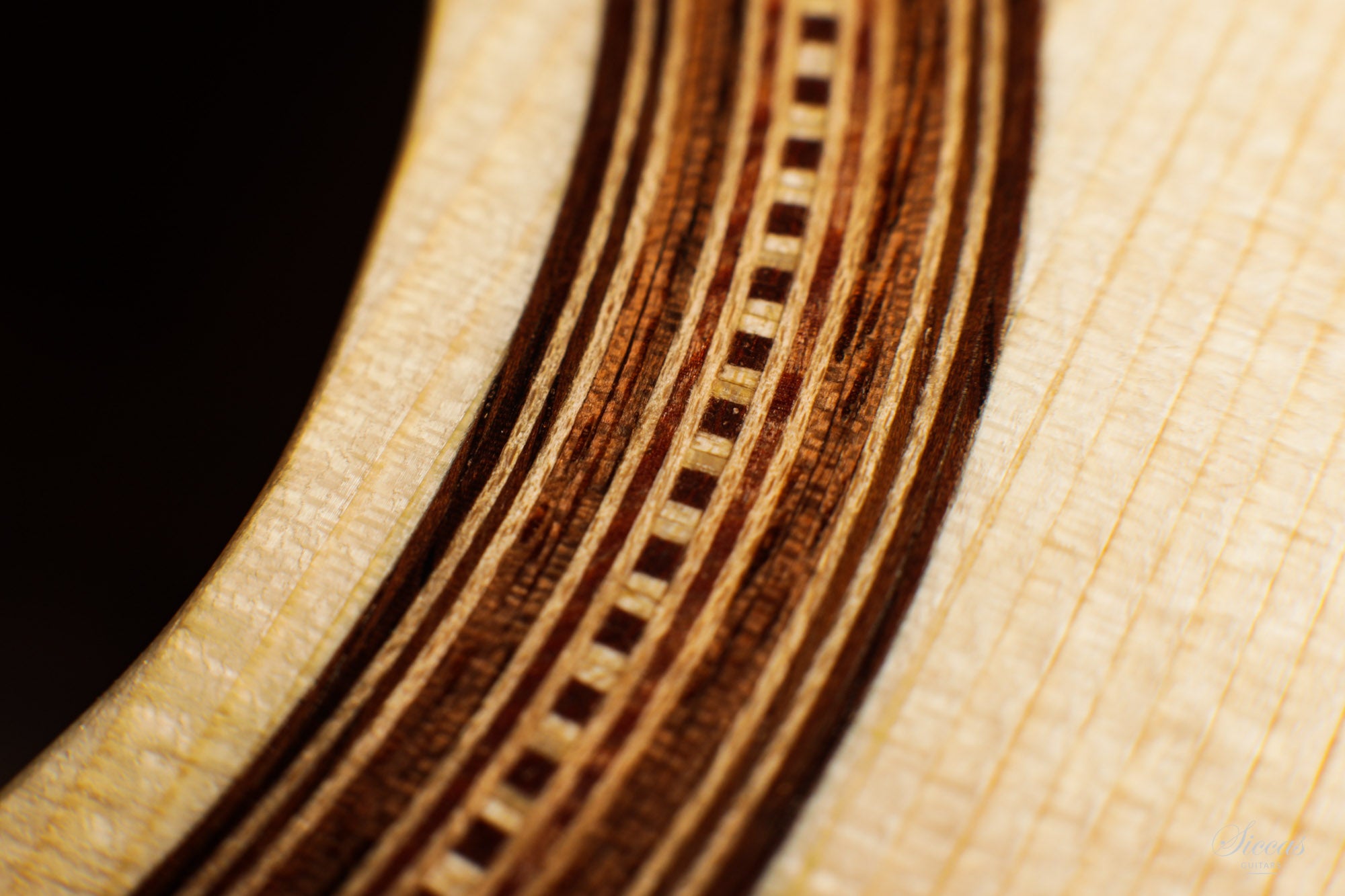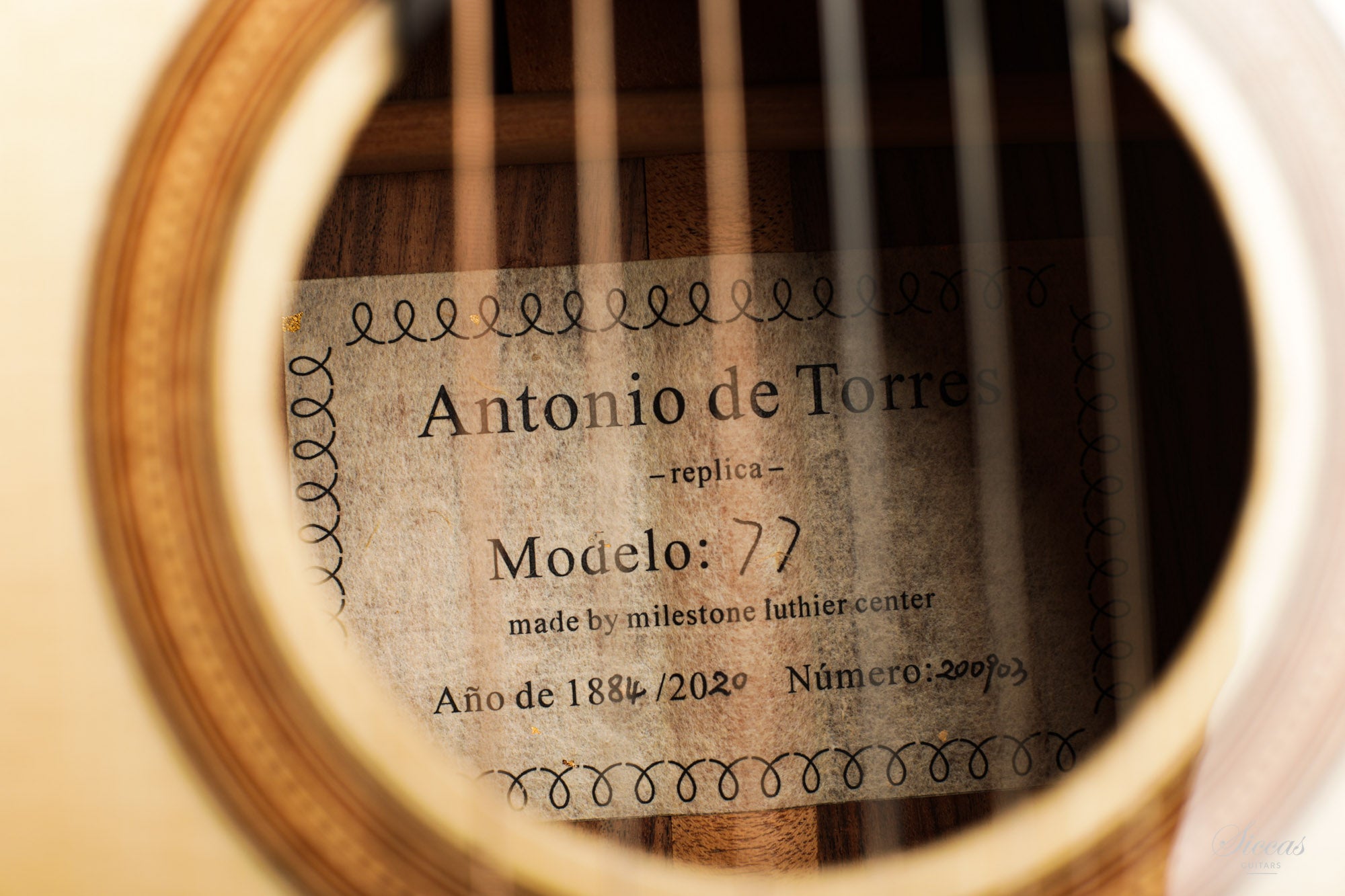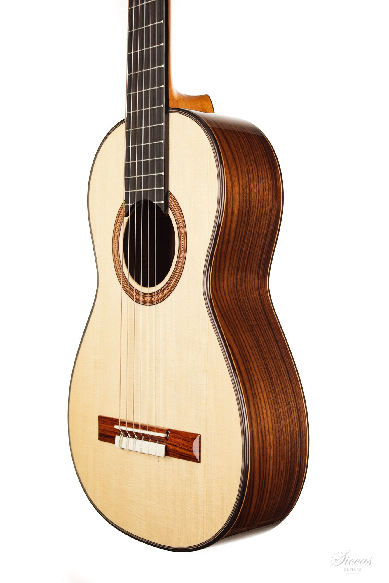 Es ist eine wahre Freude diese schöne „Torres 77“ zu spielen. Dieses Modell hat einen kleineren Korpus und bietet ein einzigartiges Spielerlebnis. Sie ist leicht, reaktionsschnell und hat ein überraschend großes Klangvolumen. Für dieses handgefertigte „Torres 77“-Opus wurden Boden und Zargen aus Grandillo und ein Hochglanz-PU-Finish gewählt. Außerdem ist die Fichtendecke von hervorragender Qualität und hat eine sehr schöne gehaselte Maserung.