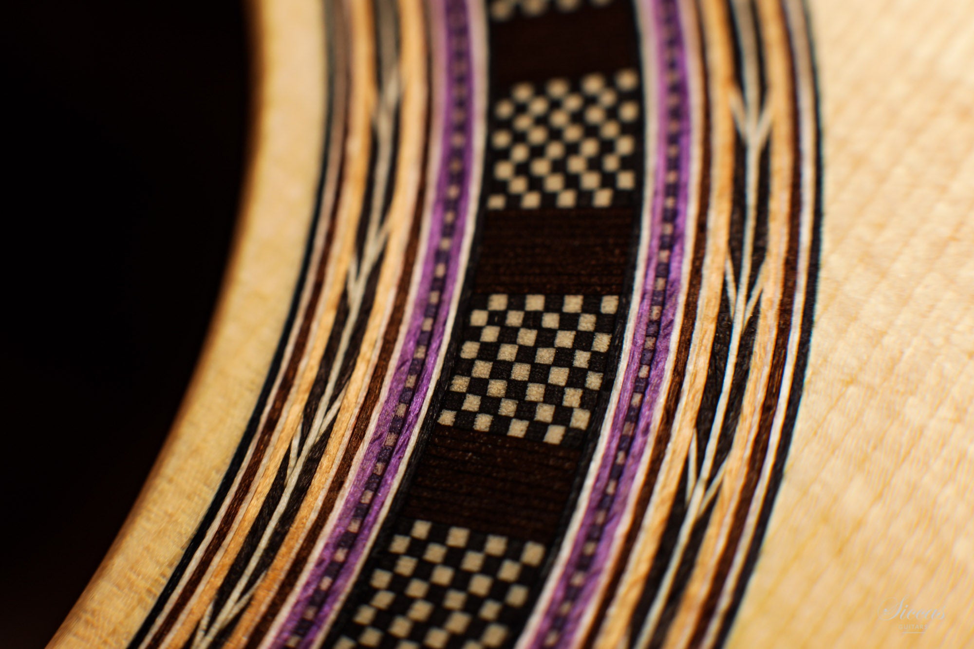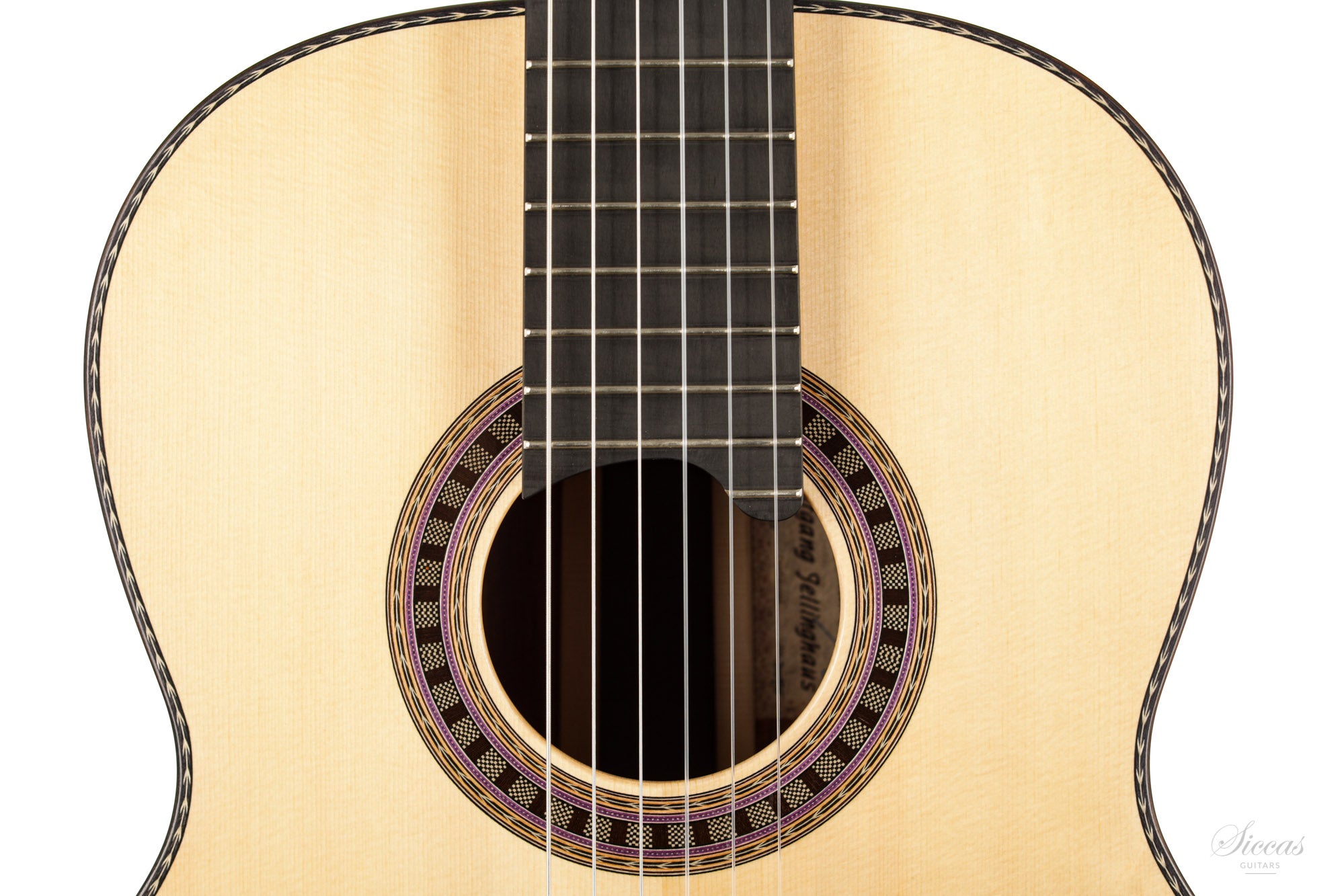 His latest series is the Wolfgang Jellinghaus Signature. This is a very modern guitar with some interesting features, such as the floating fingerboard, which is not fixed to the top, so this part of the top vibrates freely and contributes to the overall sound. The sound volume becomes very powerful, also thanks to the very light double-top construction. This makes it possible to produce a very full and room-filling tone with little effort of the right hand, which is very pleasant for the right hand. The armrest also contributes to the overall comfort. The guitar is finished with shellac which completes the overall picture of this instrument very nicely. Due to its 63 cm scale length, it is particularly easy to hold and provides a lot of playing pleasure. In this price segment, the guitar is more than convincing.