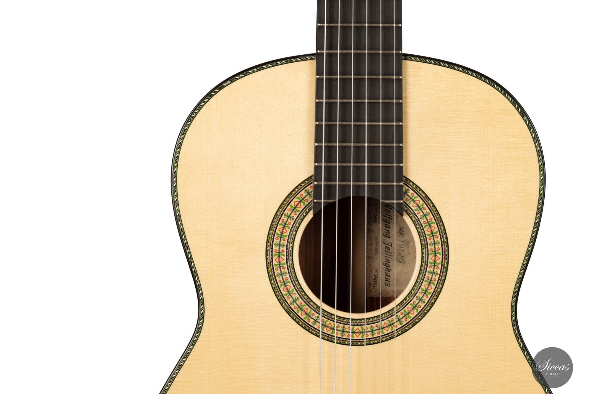 The guitar built by Wolfgang Jellinghaus is a stunning instrument modeled after the 1912 Manuel Ramirez guitar used by renowned classical guitarist Andres Segovia. Structurally, it is a replica of the original but with some modern touches. The soundboard is made from spruce, known for its rich, warm tone, and the back and sides are crafted from pau ferro, a wood known for its bright, clear sound. The French polished soundboard and lacquer back and sides add to the guitar's aesthetic appeal and contribute to its exceptional sound quality. Despite its cost-efficient price, this guitar has a powerful sound with warm tones and an array of beautiful colors. It is a truly remarkable instrument, crafted by a master guitar builder’s team with years of experience and passion for the craft.