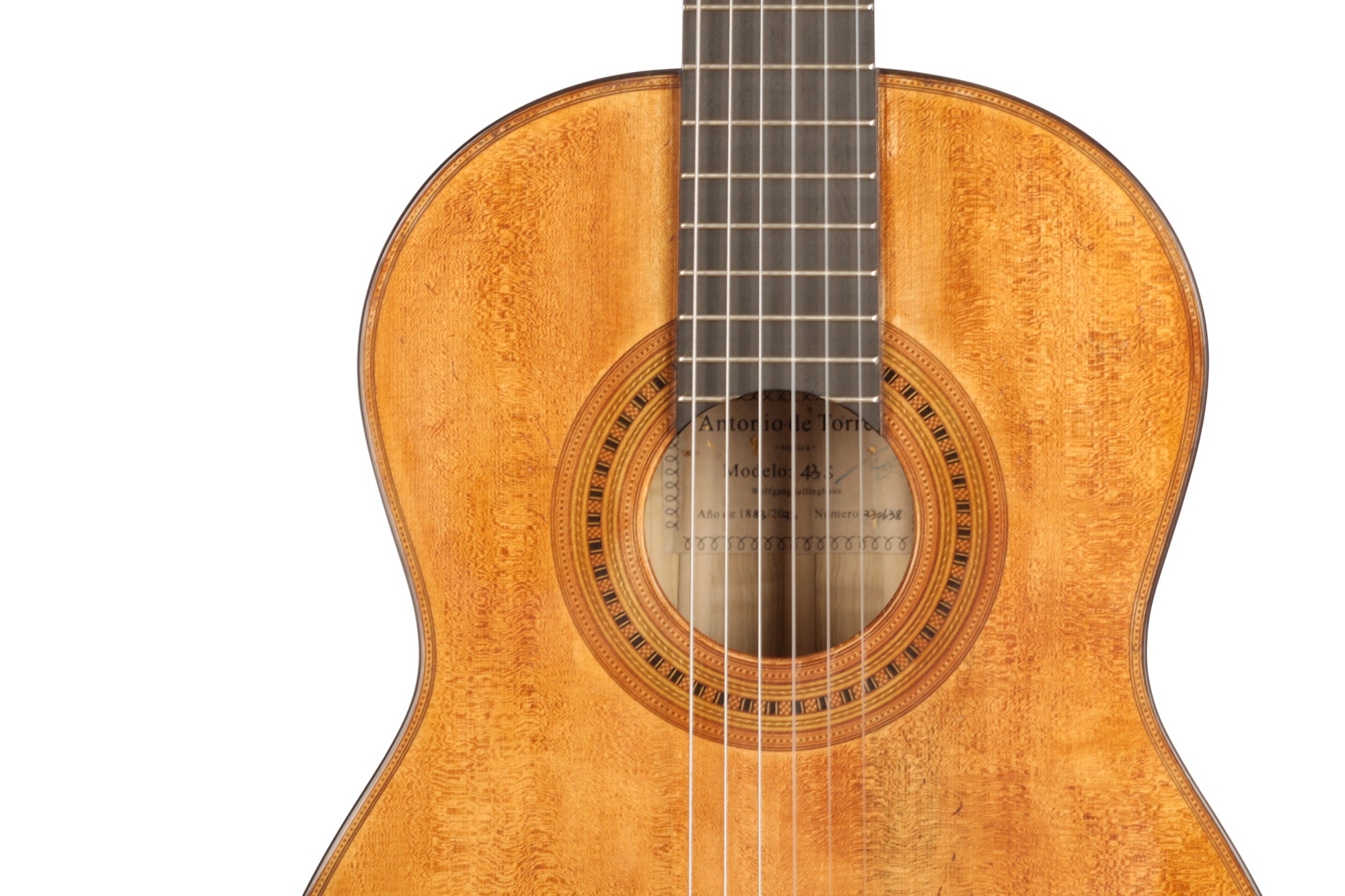This beautiful guitar is a replica of guitar number 43, which the great master Antonio de Torres built in 1883. It was built in Antonio de Torres' second era, also called Segunda epoca, and is a specially decorated instrument with a back made of stunning flamed maple. As always, a great deal of effort was put into building a faithful first quality copy in Wolfgang Jellinghaus' workshop, and the result is simply magnificent.