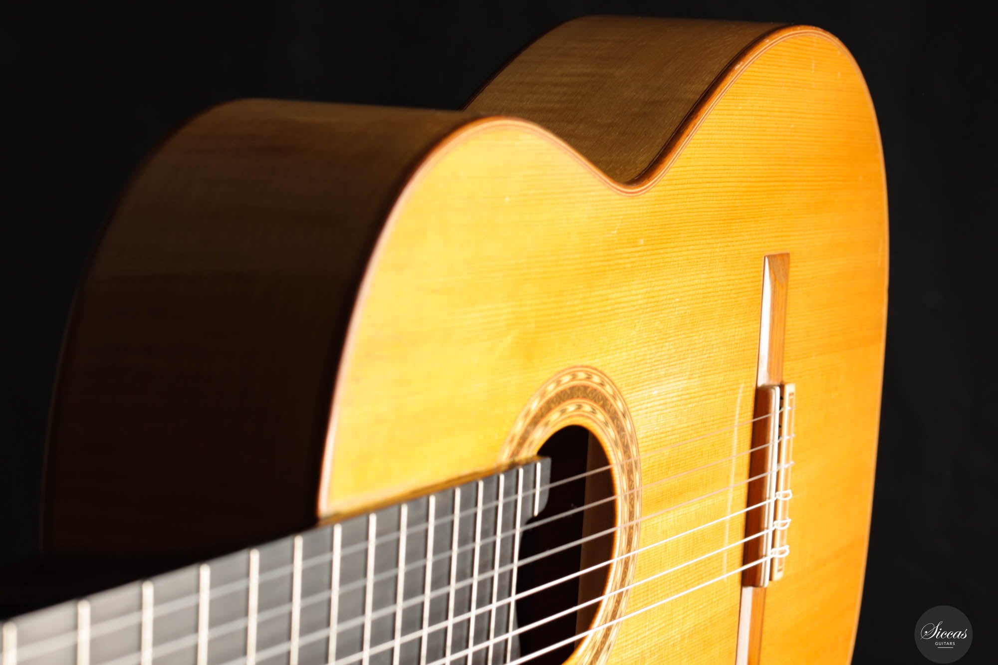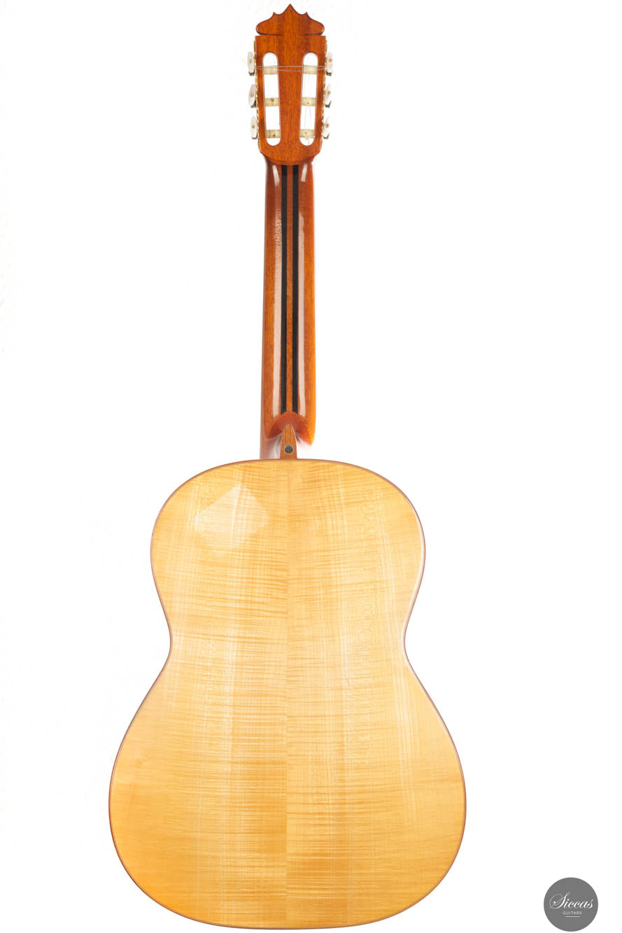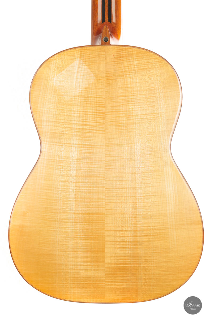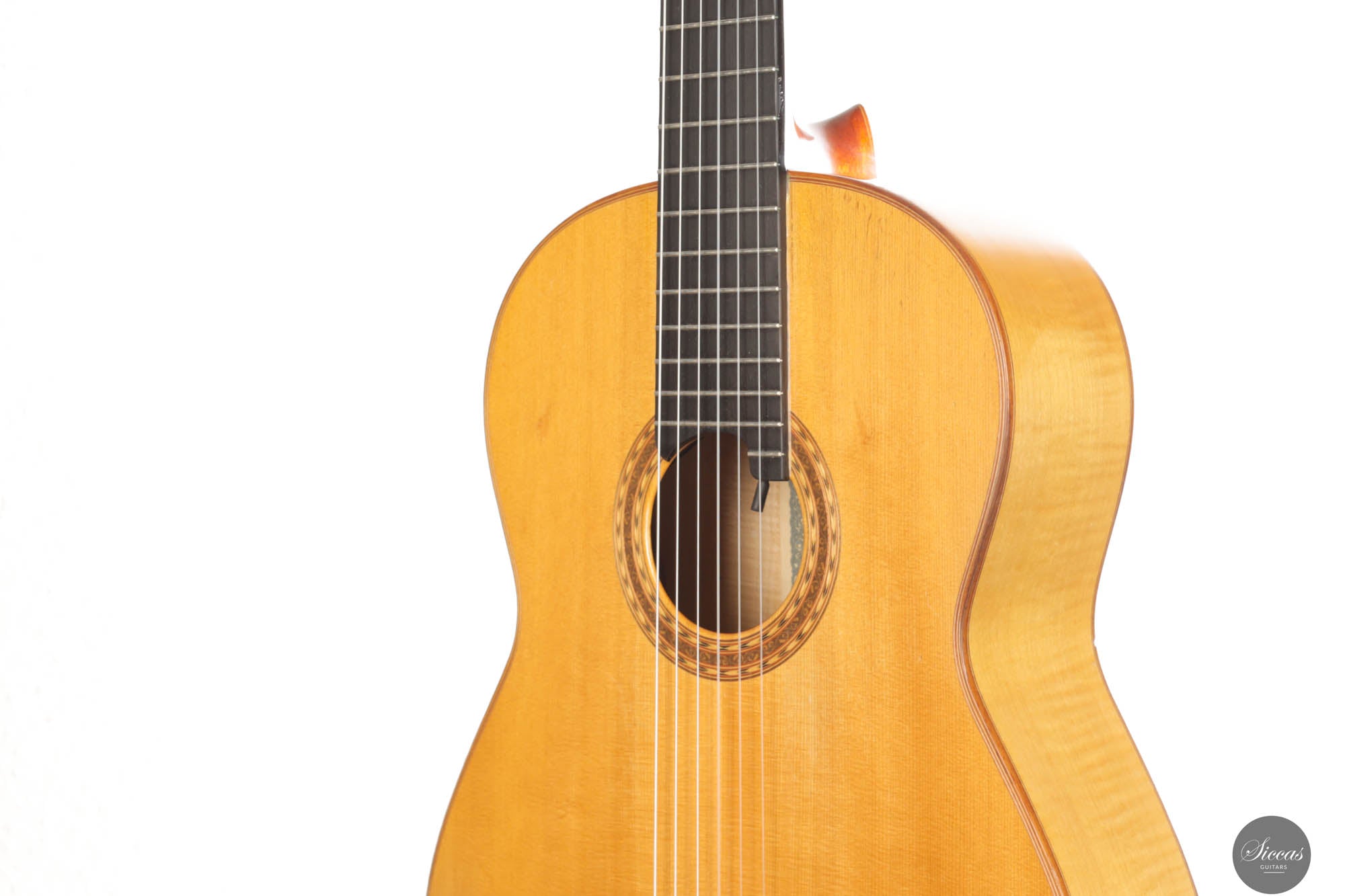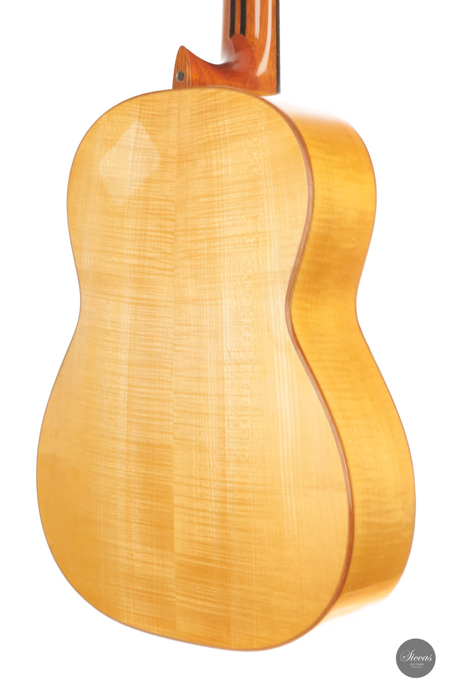Die Yuichi Imai Gitarre von 1992 zeigt die hohe Kunstfertigkeit eines der bedeutendsten japanischen Gitarrenbauer. Mit ihrem Boden und Zargen aus edlem Ahorn knüpft sie klanglich an die Tradition der Madrider Schule an und verbindet kraftvolle Projektion mit Wärme und lyrischer Ausstrahlung. Sie reagiert sensibel auf feinste Dynamik und erlaubt es, jede Nuance und Stimme klar hervorzuheben. Trotz ihres Alters befindet sie sich in ausgezeichnetem Zustand und weist nur leichte Gebrauchsspuren auf. Dank des integrierten elektronischen Systems eignet sie sich gleichermaßen für den Konzertsaal wie für flexible Bühnensituationen.