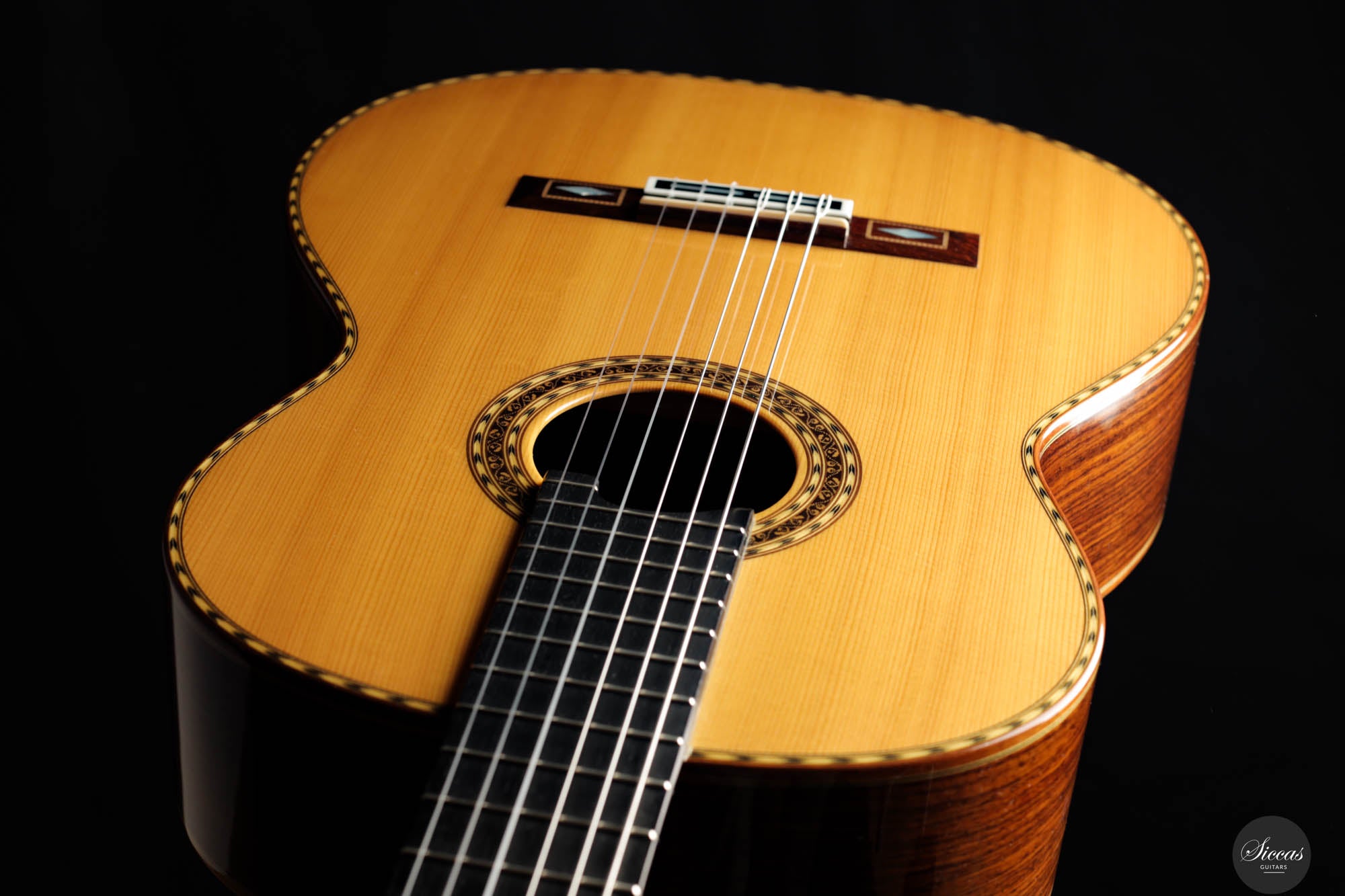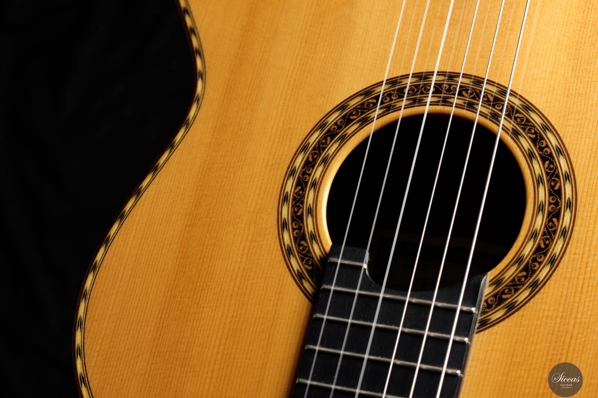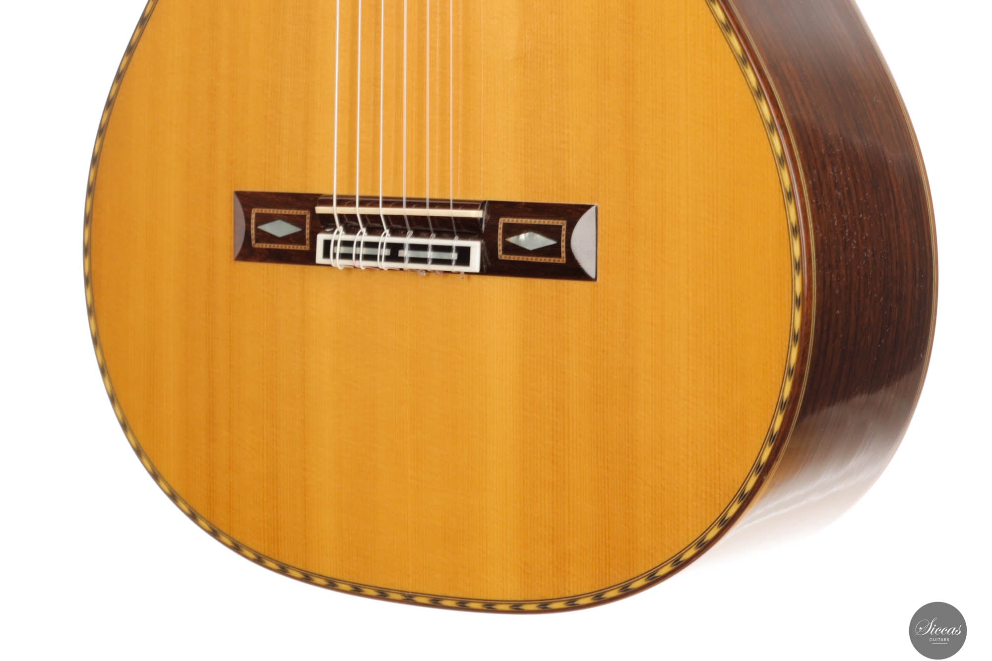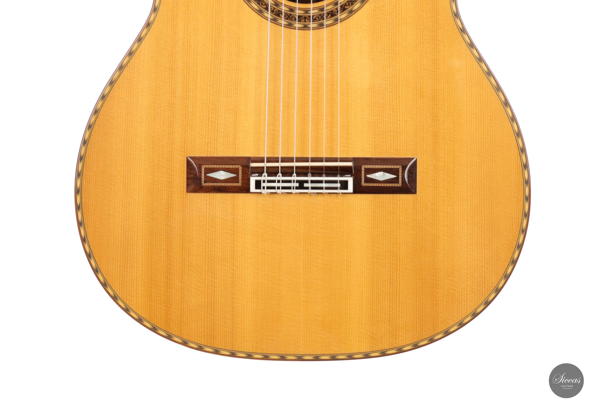 Dieses Instrument aus dem Jahr 2014 ist in jeder Hinsicht eine herausragende Konzertgitarre. Mit ihrem beeindruckenden Volumen, exzellenter Projektion, schneller Ansprache und eloquenter Stimmgebung ist sie die ideale vielseitige Gitarre für Bühnenauftritte, Studioaufnahmen oder kleinere Veranstaltungsorte. Das außergewöhnliche Handwerk von Imai zeigt sich in der aufwendig verzierten Fichtendecke, dem indischen Rosenholz für Boden und Zargen sowie der wunderschön geschnitzten Kopfplatte. Die Decke hat eine zarte honigfarbene Tönung, die durch ein sogenanntes „Cashew“-Finish erzielt wird. Sie befindet sich in ausgezeichnetem Zustand und hat einen gut entwickelten und gereiften Klang. Die festen Bässe und reichen Höhen, zusammen mit der hervorragenden Balance und der klaren Trennung der Töne, machen sie zu einem hochgradig anpassungsfähigen Instrument für jeden musikalischen Kontext. Insgesamt ist es eine Konzertgitarre auf professionellem Niveau von einem hoch angesehenen Gitarrenbauer zu einem großartigen Preis-Leistungs-Verhältnis.