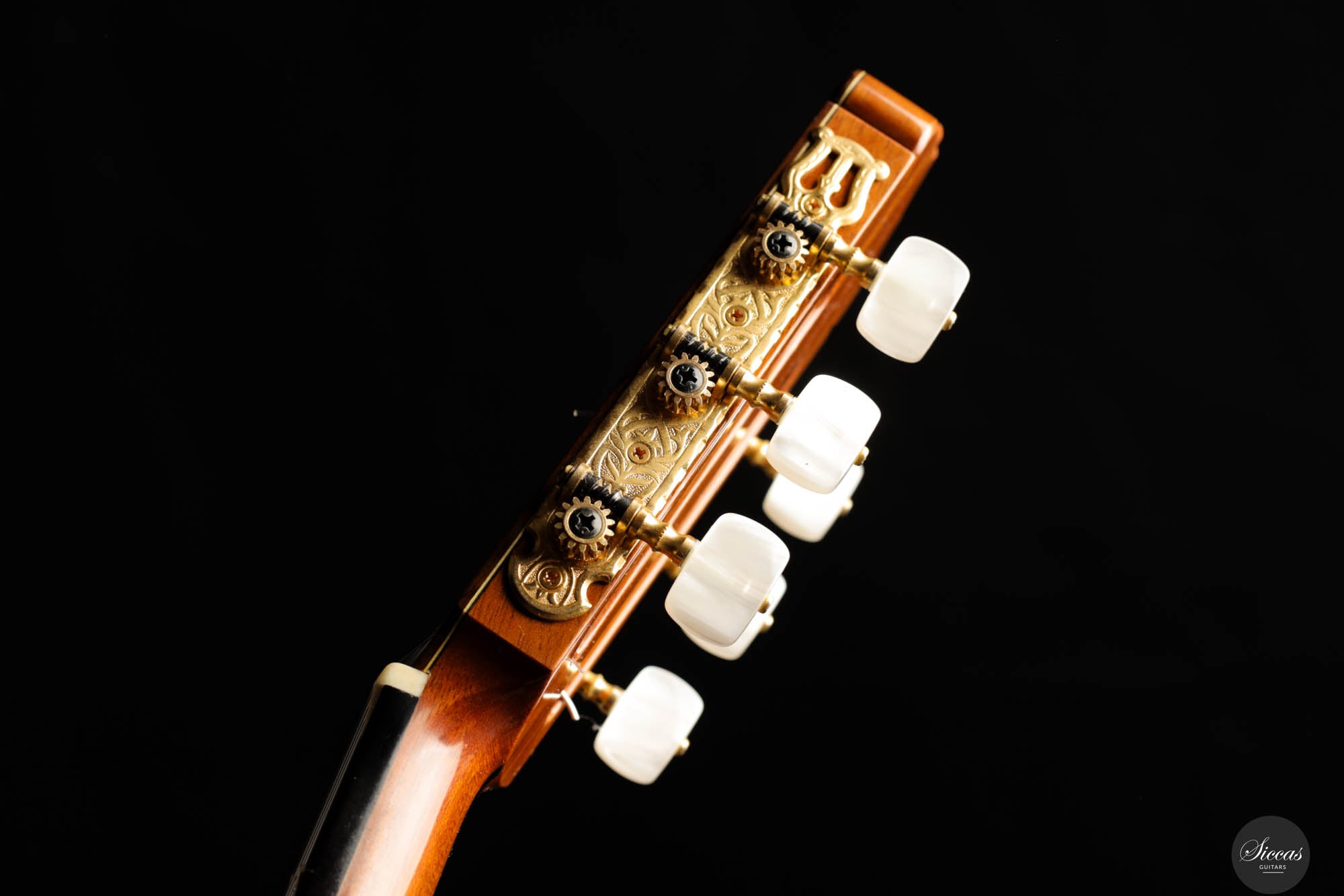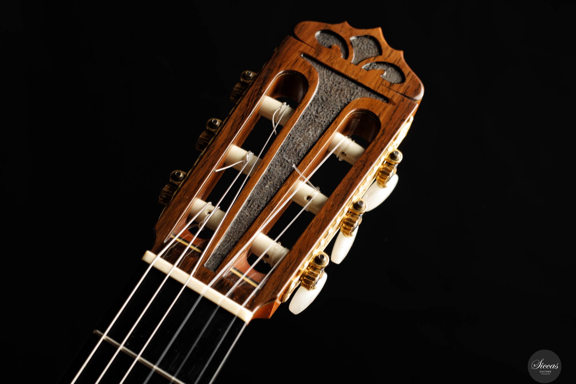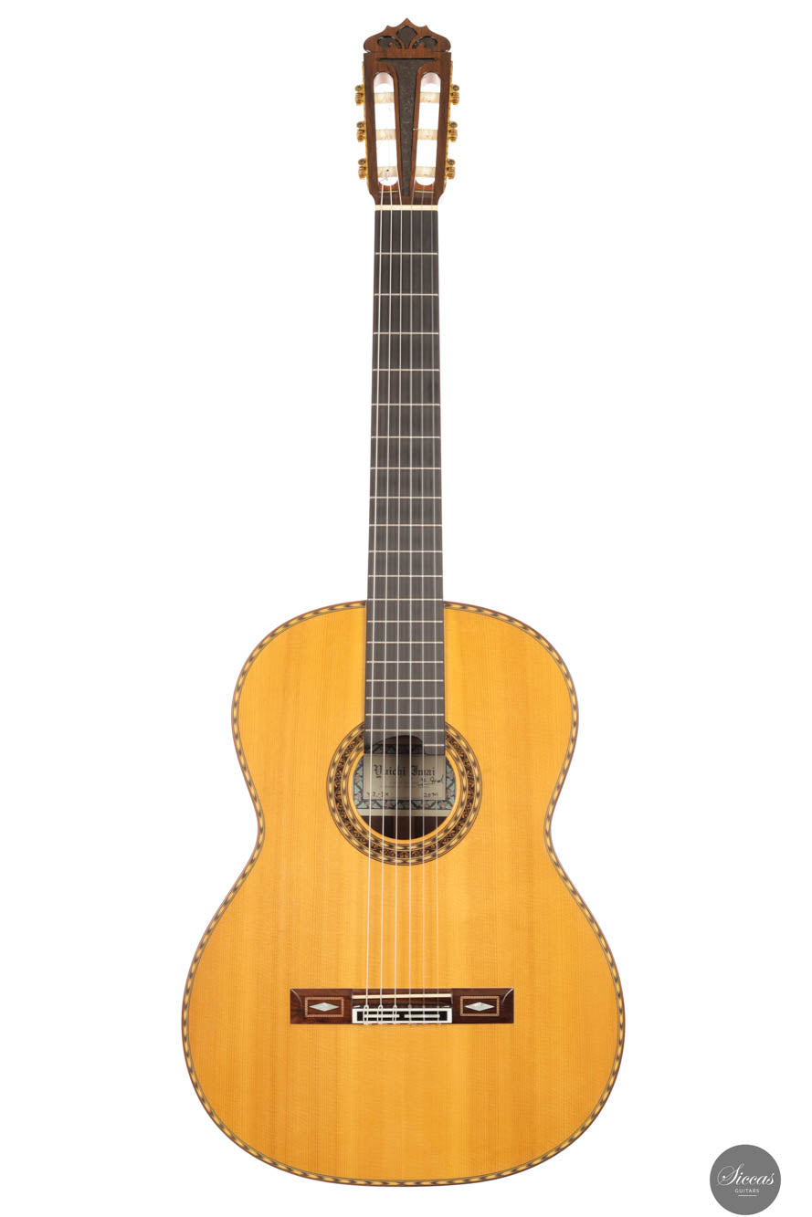 Dieses Instrument aus dem Jahr 2014 ist in jeder Hinsicht eine herausragende Konzertgitarre. Mit ihrem beeindruckenden Volumen, exzellenter Projektion, schneller Ansprache und eloquenter Stimmgebung ist sie die ideale vielseitige Gitarre für Bühnenauftritte, Studioaufnahmen oder kleinere Veranstaltungsorte. Das außergewöhnliche Handwerk von Imai zeigt sich in der aufwendig verzierten Fichtendecke, dem indischen Rosenholz für Boden und Zargen sowie der wunderschön geschnitzten Kopfplatte. Die Decke hat eine zarte honigfarbene Tönung, die durch ein sogenanntes „Cashew“-Finish erzielt wird. Sie befindet sich in ausgezeichnetem Zustand und hat einen gut entwickelten und gereiften Klang. Die festen Bässe und reichen Höhen, zusammen mit der hervorragenden Balance und der klaren Trennung der Töne, machen sie zu einem hochgradig anpassungsfähigen Instrument für jeden musikalischen Kontext. Insgesamt ist es eine Konzertgitarre auf professionellem Niveau von einem hoch angesehenen Gitarrenbauer zu einem großartigen Preis-Leistungs-Verhältnis.