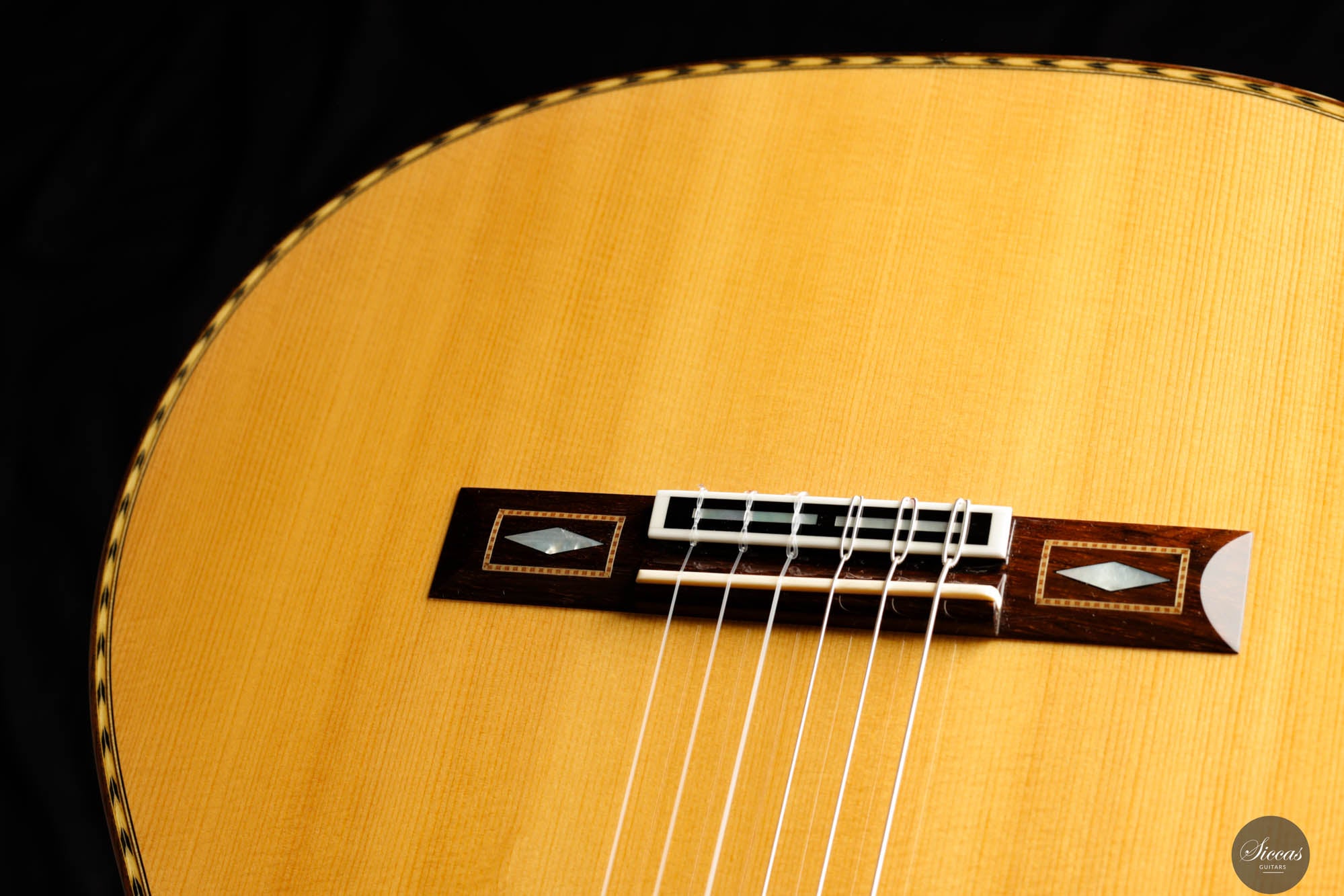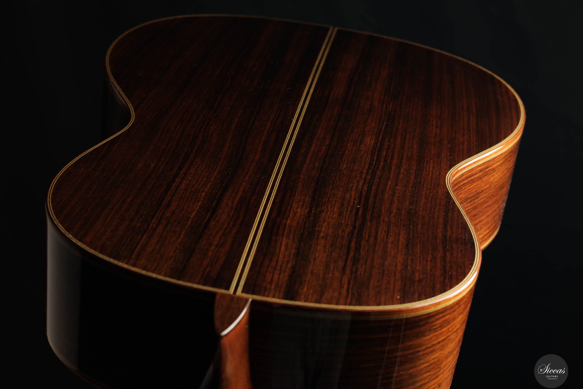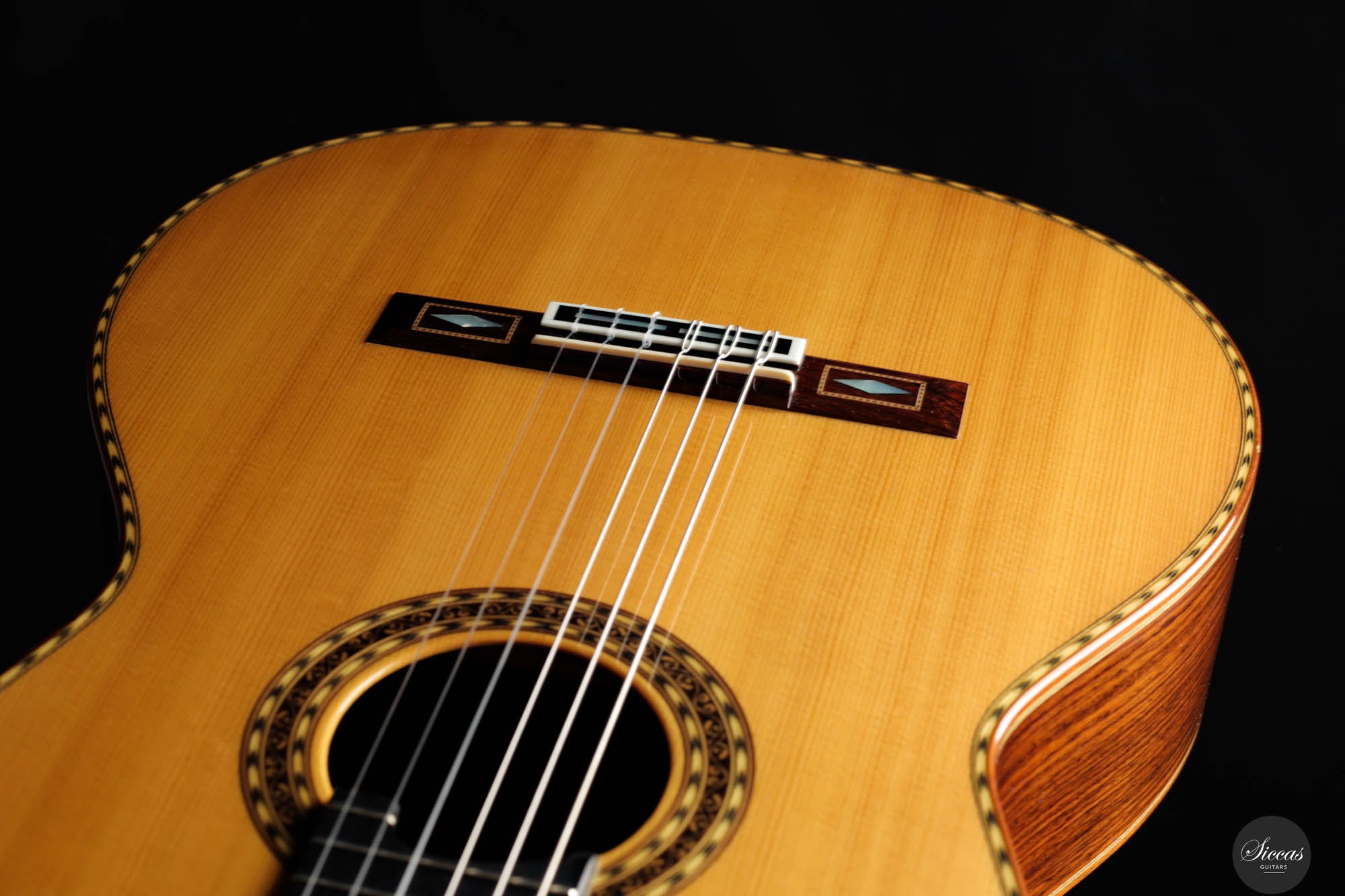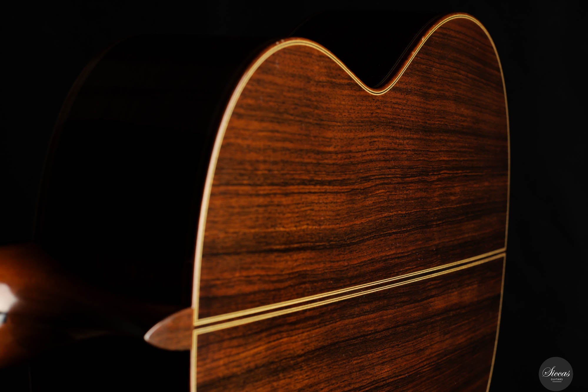 Dieses Instrument aus dem Jahr 2014 ist in jeder Hinsicht eine herausragende Konzertgitarre. Mit ihrem beeindruckenden Volumen, exzellenter Projektion, schneller Ansprache und eloquenter Stimmgebung ist sie die ideale vielseitige Gitarre für Bühnenauftritte, Studioaufnahmen oder kleinere Veranstaltungsorte. Das außergewöhnliche Handwerk von Imai zeigt sich in der aufwendig verzierten Fichtendecke, dem indischen Rosenholz für Boden und Zargen sowie der wunderschön geschnitzten Kopfplatte. Die Decke hat eine zarte honigfarbene Tönung, die durch ein sogenanntes „Cashew“-Finish erzielt wird. Sie befindet sich in ausgezeichnetem Zustand und hat einen gut entwickelten und gereiften Klang. Die festen Bässe und reichen Höhen, zusammen mit der hervorragenden Balance und der klaren Trennung der Töne, machen sie zu einem hochgradig anpassungsfähigen Instrument für jeden musikalischen Kontext. Insgesamt ist es eine Konzertgitarre auf professionellem Niveau von einem hoch angesehenen Gitarrenbauer zu einem großartigen Preis-Leistungs-Verhältnis.