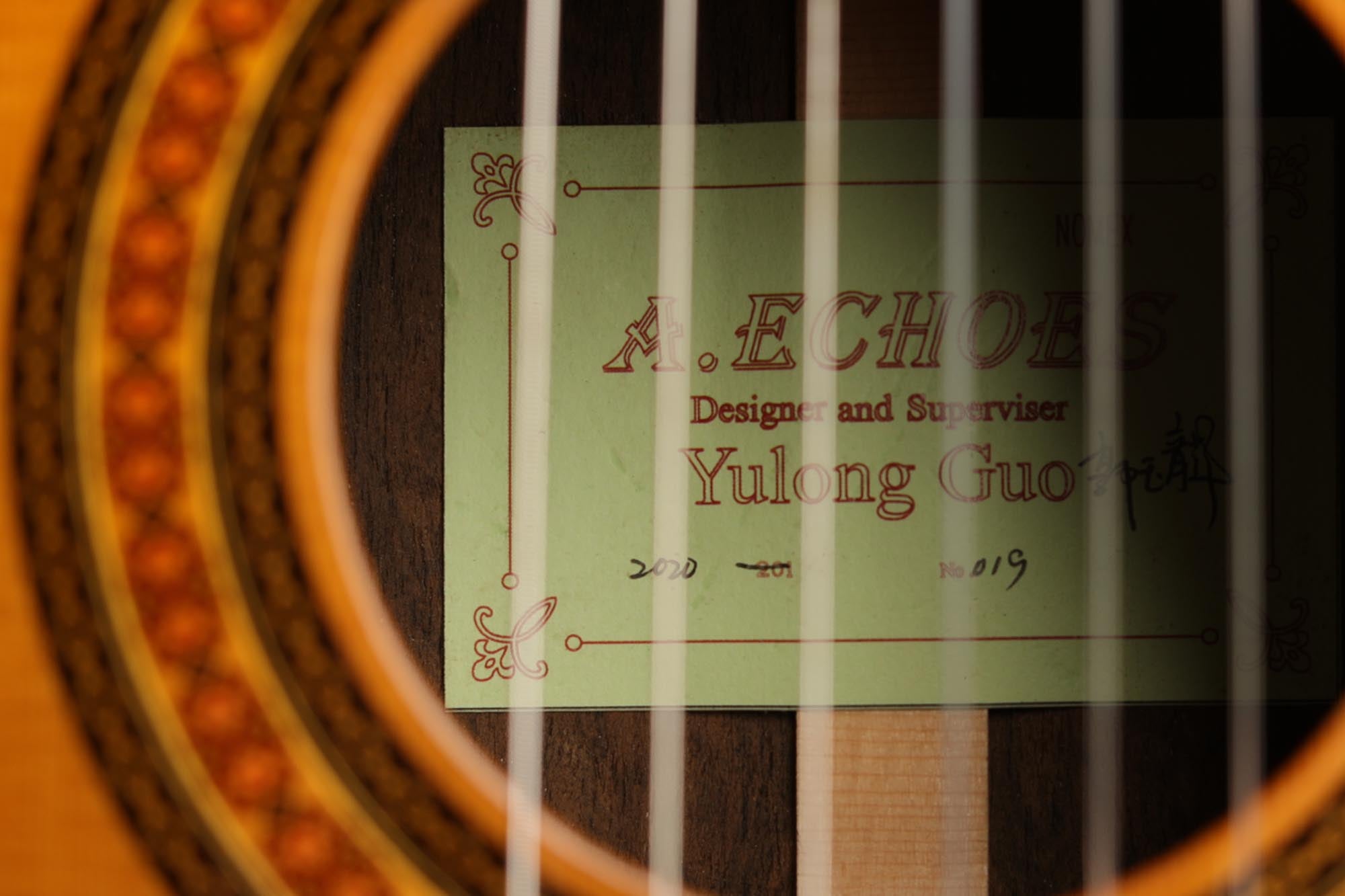 Das Modell Artist Echoes ist wirklich einzigartig und bietet eine Gitarre mit Double Top in einer sehr attraktiven Preisklasse. Dieses Modell wird in einer Werkstatt unter der Leitung von Yulong Guo gebaut, in der drei bis fünf erfahrene chinesische Geigenbauer beschäftigt sind. Die meisten dieser Gitarrenbauer werden von Yulong Guo ausgebildet und arbeiten seit vielen Jahren mit ihm zusammen. Diese Gitarre ist mit einem schlichten und präzisen Design gebaut, eher modern und sehr charakteristisch.