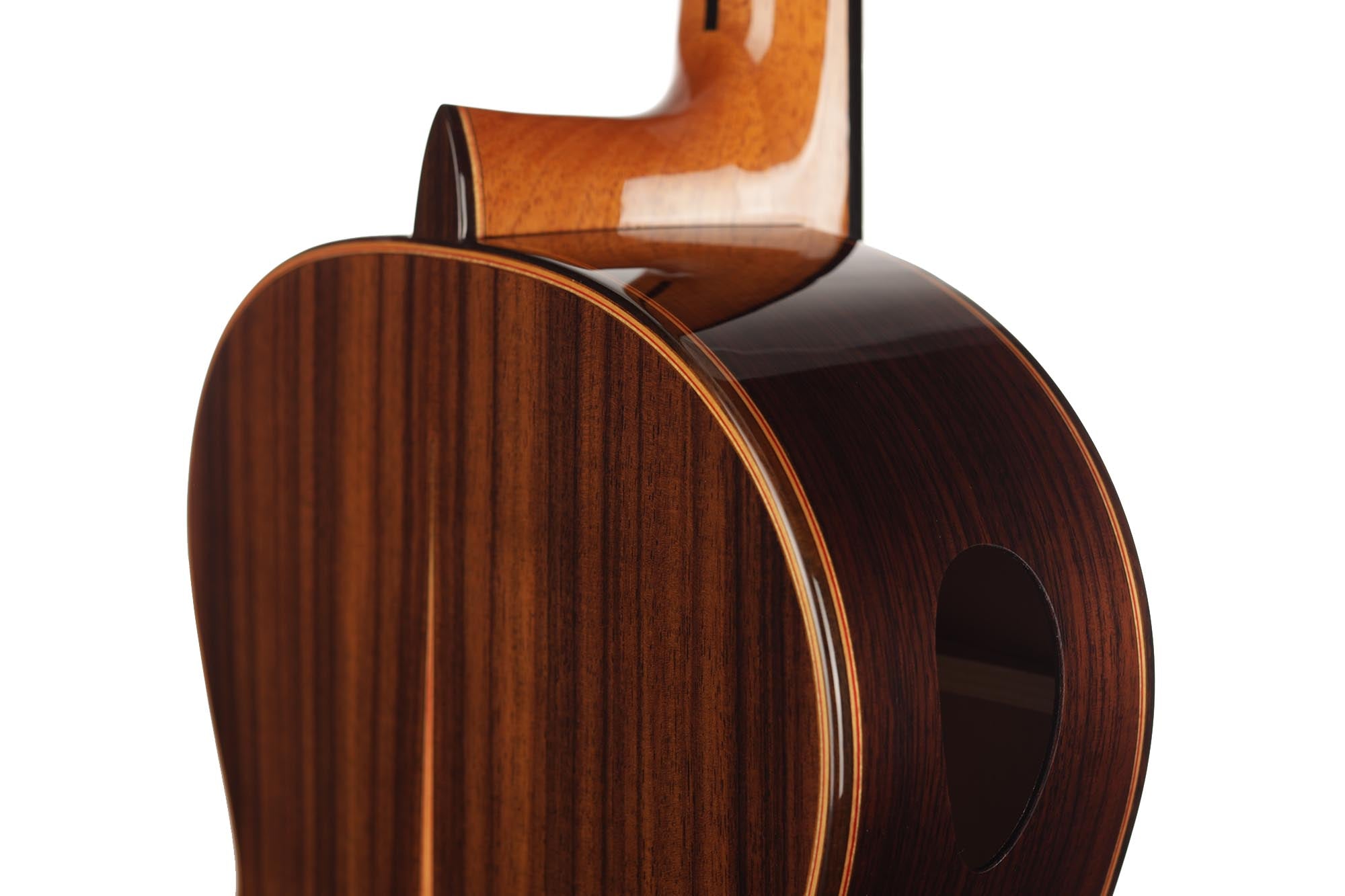 Eine Armauflage aus stabilisiertem Holz , besonders glatte Bünde zusammen mit einem zusätzlichen Zargen-Schallloch und einer tiefen Saitenlage machen das Chamber-Concert-Modell außergewöhnlich leicht und komfortabel spielbar.