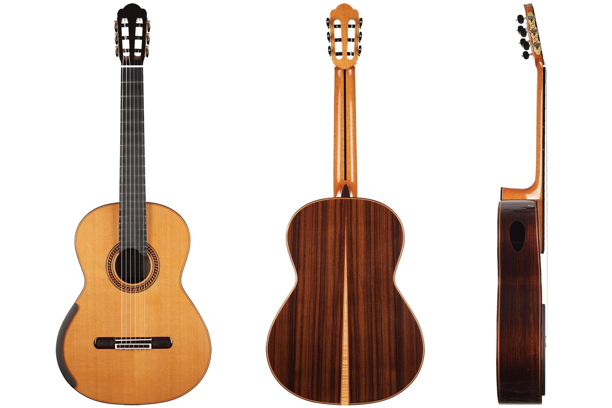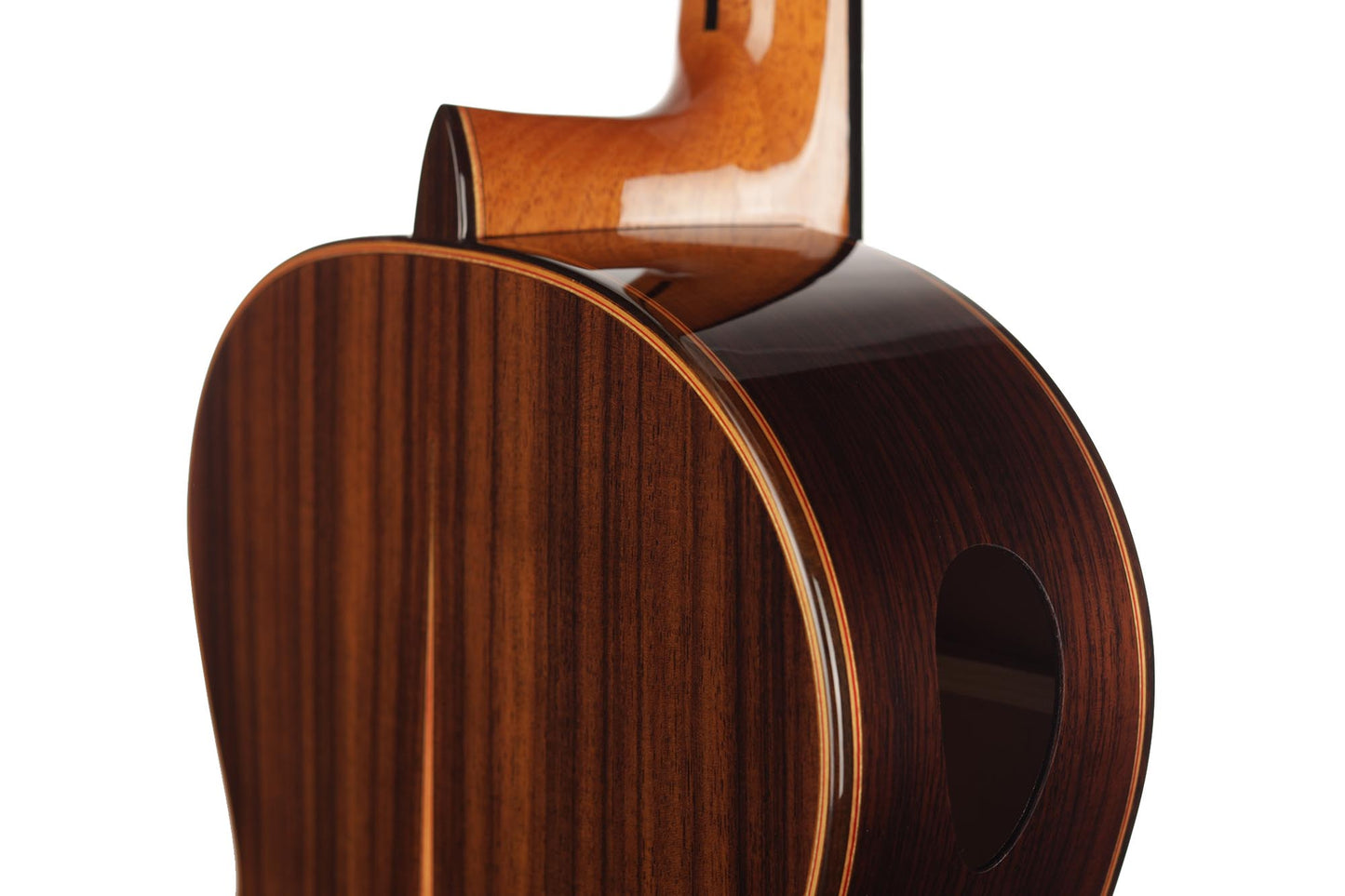 Für dieses Chamber-Concert-Modell wurde die neueste Gitarrenbautechnologie verwendet: eine Doppeldecke aus zwei ultradünnen Schichten von erstklassigem Zedernholz auf beiden Seiten einer Nomex-Schicht, um die für die Haltbarkeit der Decke erforderliche Festigkeit zu gewährleisten. Durch den Einsatz dieser Technik wird auch das Gewicht der Decke reduziert und damit das Klangvolumen und die Ansprache der Gitarre deutlich verbessert. Boden und Zargen sind aus indischen Palisanderholz gefertigt, gewölbt wie bei einer Geige. Diese Technik verleiht der Gitarre eine erstaunliche Klangprojektion und ein beeindruckendes Klangvolumen, was sie ideal für Konzertauftritte macht. Darüber hinaus ist der obere Teil des Korpus abgesenkt, um ein "erhöhtes Griffbrett" im Stil von Humphrey-Gitarren zu erhalten. Dank dieser leichten Anpassung der Höhe des Griffbretts wird die Bespielbarkeit in hohen Lagen stark verbessert.