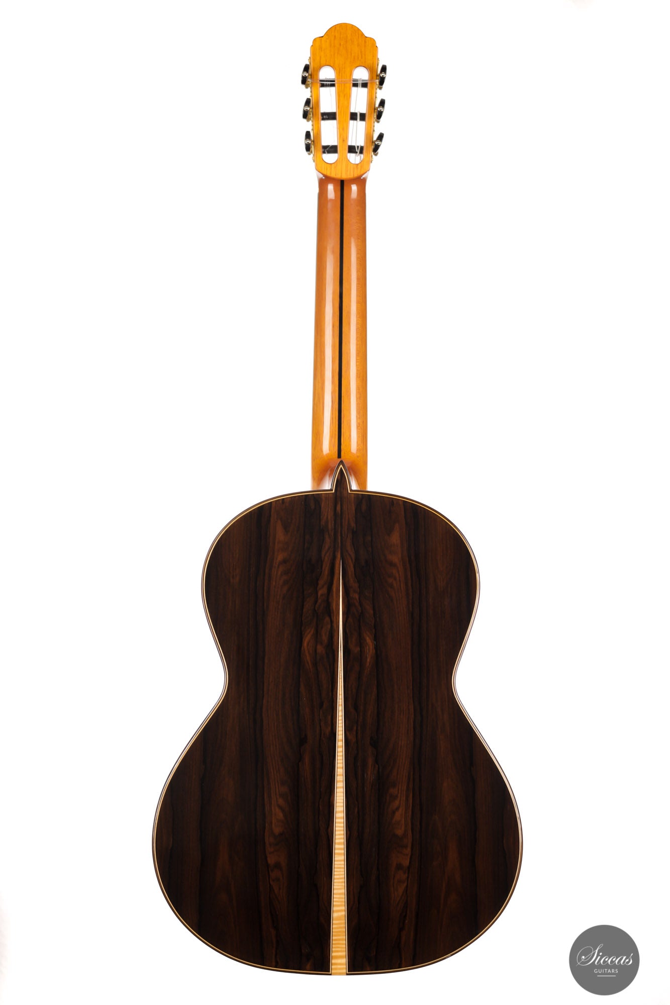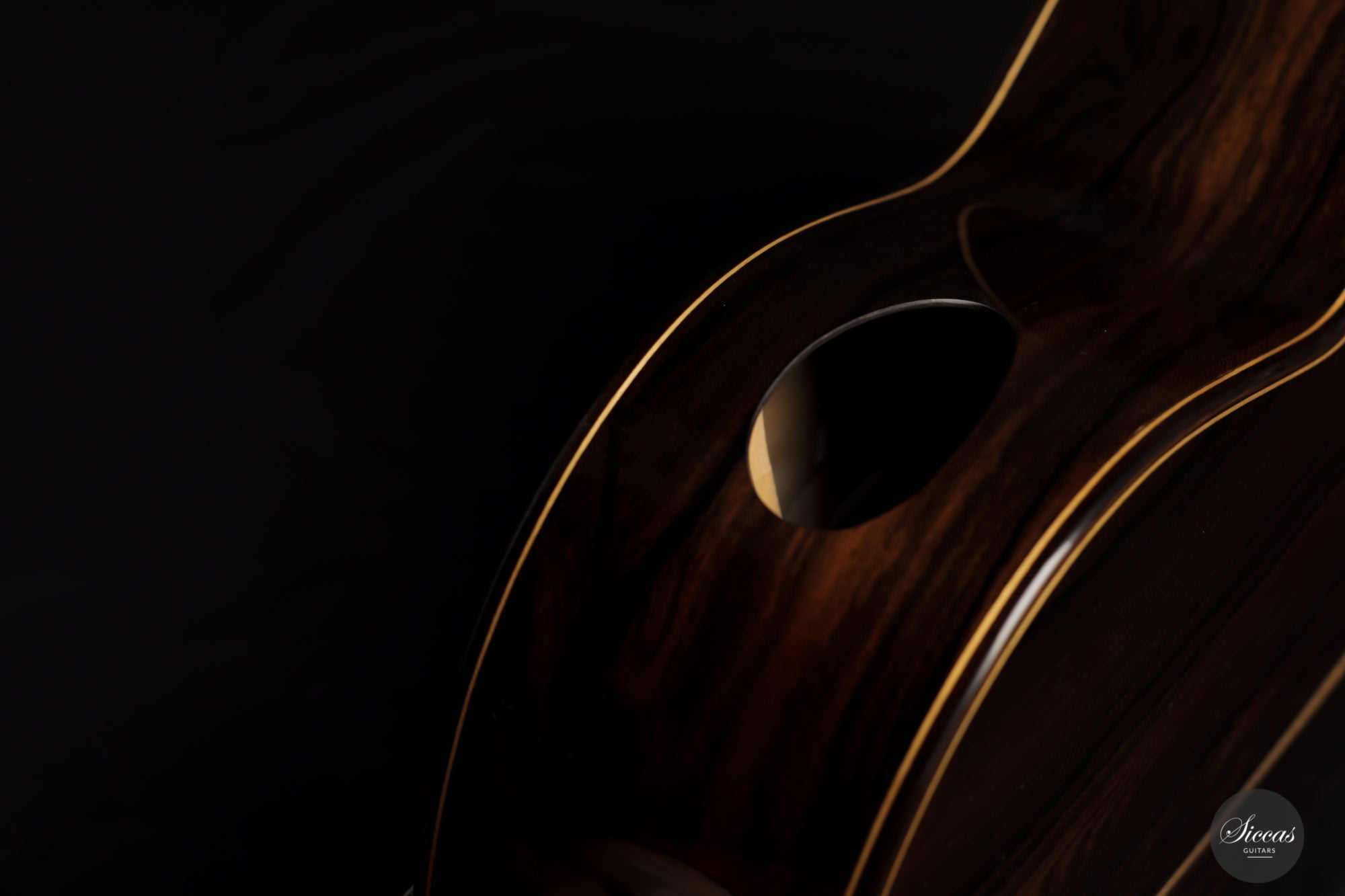This Concert model is a real upgrade from the Chamber Concert model, with a French polished top and a generally more elaborated construction. It is really designed to please the guitarist, particularly the one looking for a powerful tone, ideal playing comfort, and a reliable stage instrument. The elevated fingerboard, the additional sound port on the side, and the armrest combined with a lattice double top soundboard make for a first-class modern concert guitar