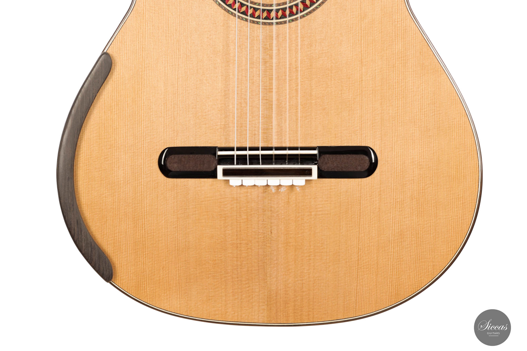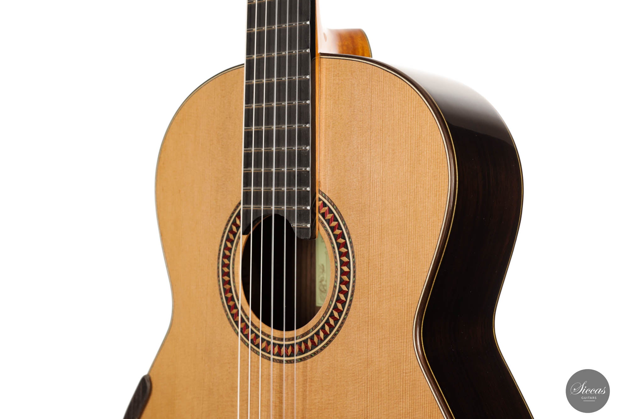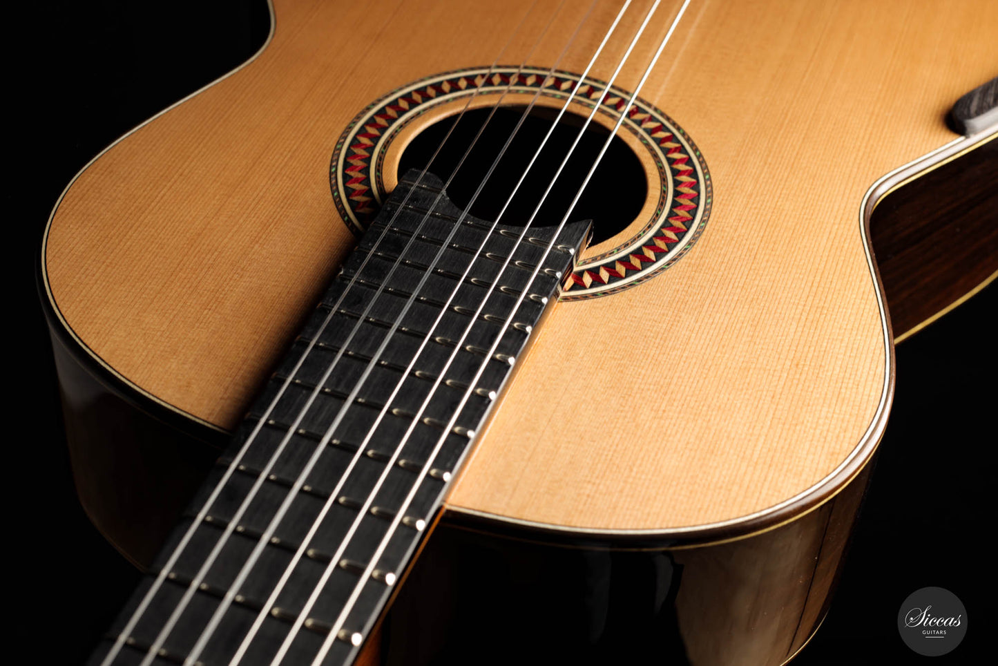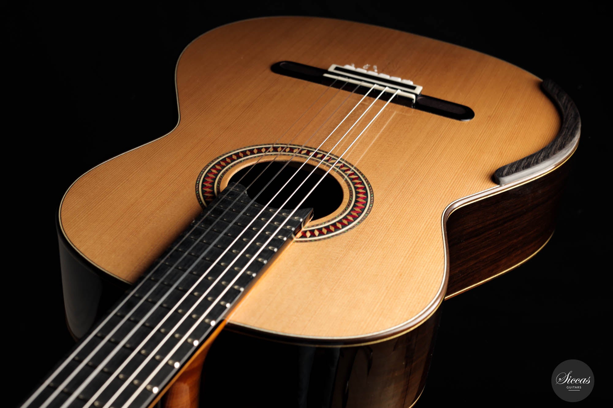 For this 40th Anniversary Chamber Concert model, the latest classical guitar technology was used: Double-top with two ultra-thin layers of first-class cedar on either side of a layer of Nomex to give the strength needed for the durability of the top. Using this technique also reduces the soundboard’s weight, and therefore enhances the guitar’s sound volume and responsiveness by far. Back and sides are made of Indian Rosewood, arched in the manner of the violin. This technique gives the guitar an amazing sound projection and volume, making it ideal for concert performances. Moreover, the upper bout of the body is sloped to provide a ‘raised fingerboard’ in the style of Humphrey guitars. Thanks to this slight change in the height of the fretboard, the playability of the trebles in high positions is greatly improved. A techwood armrest, ultra-smooth frets along with an extra sound port on the side, and a low string action make the Chamber Concert model exceptionally easy and comfortable to play.