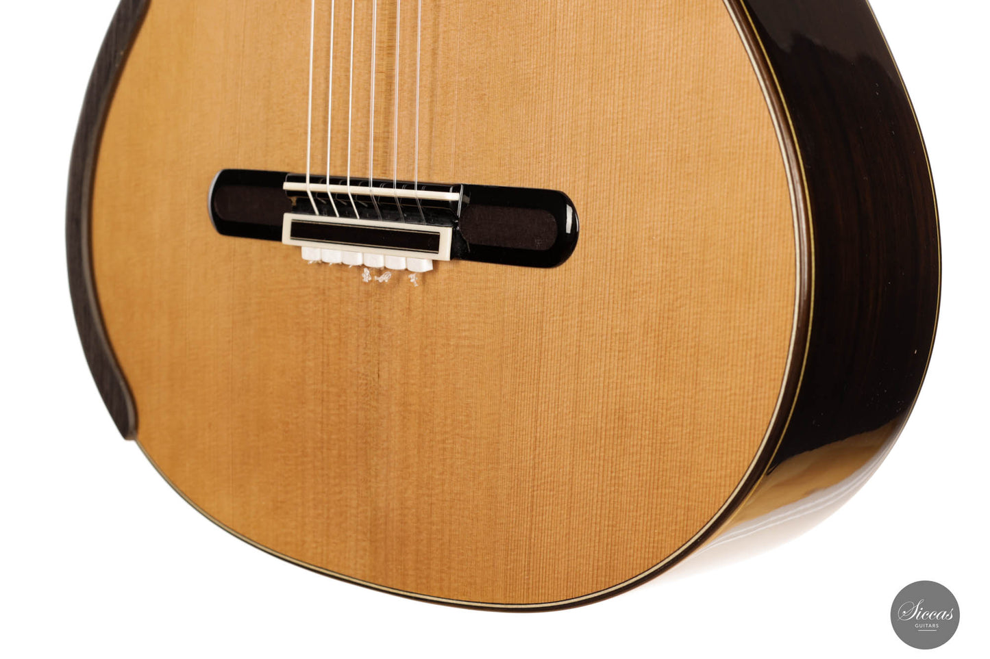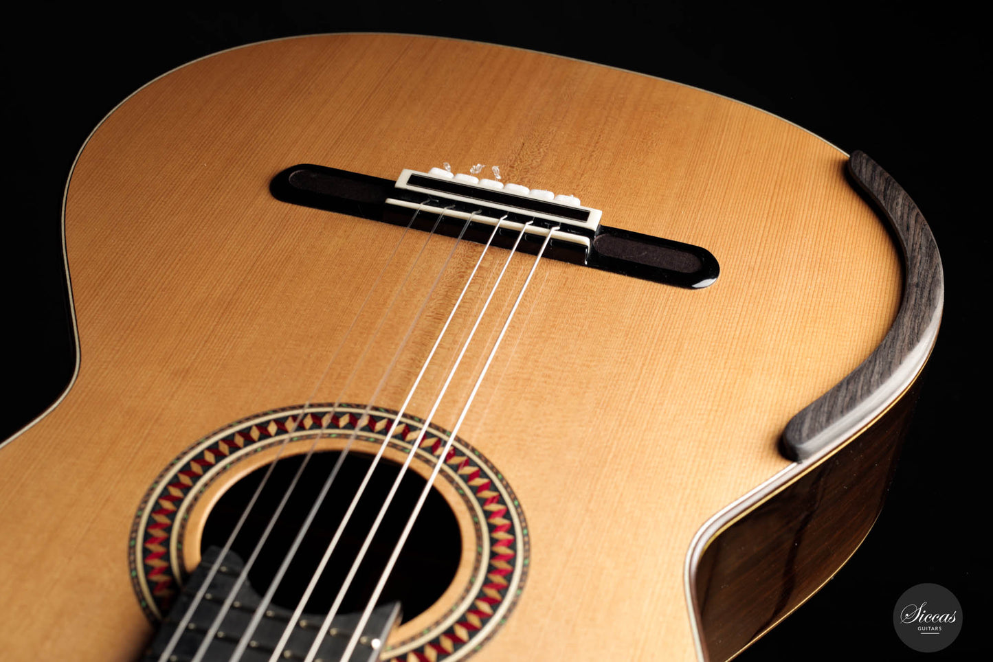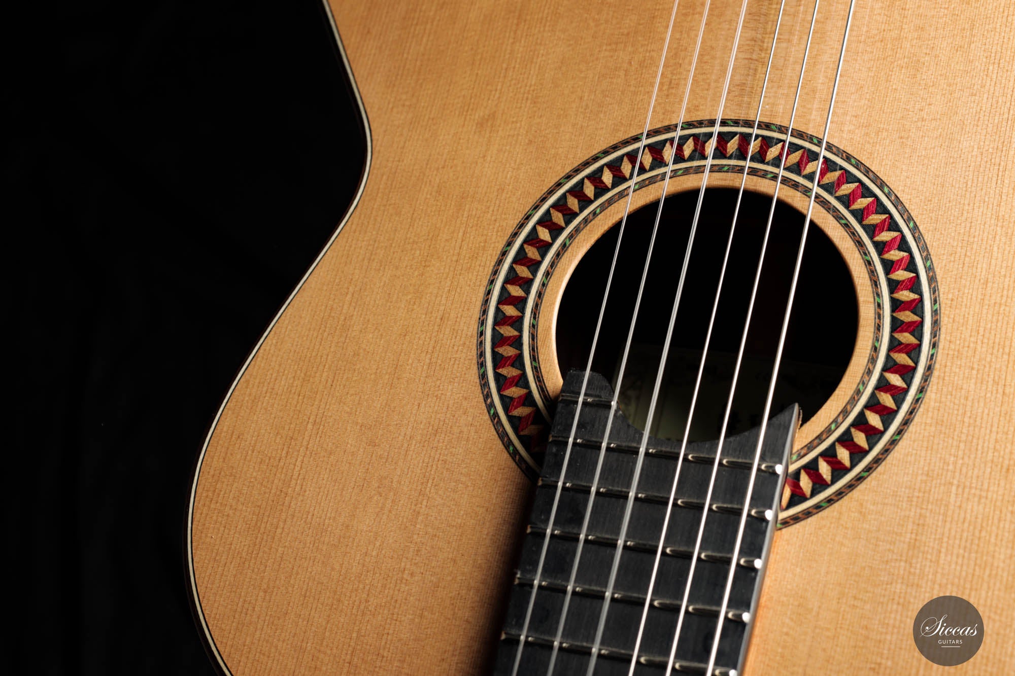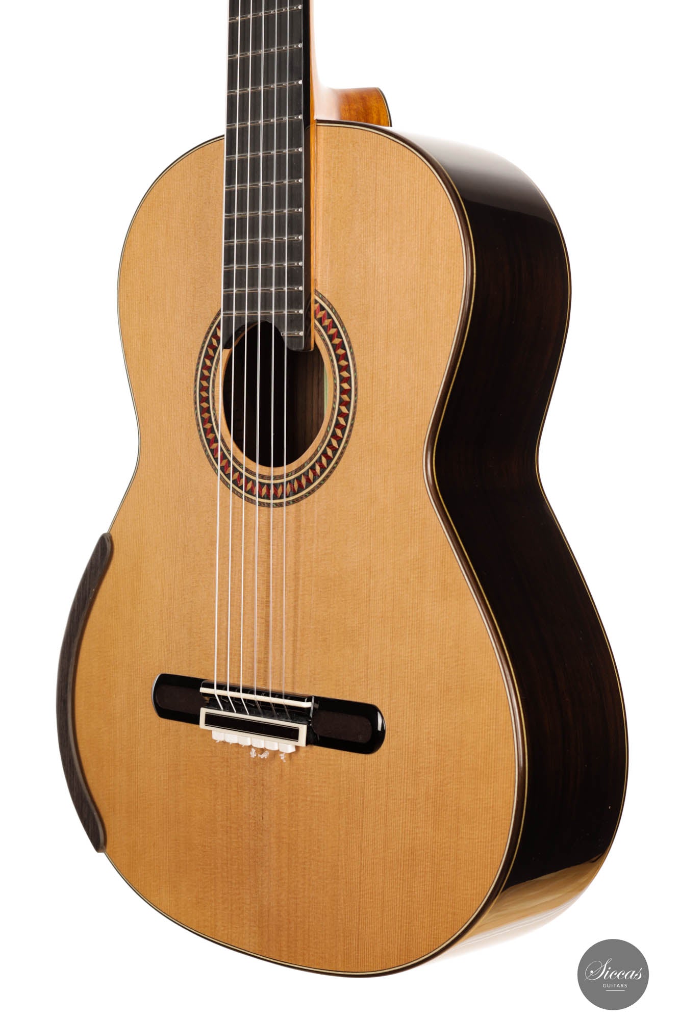 For this 40th Anniversary Chamber Concert model, the latest classical guitar technology was used: Double-top with two ultra-thin layers of first-class cedar on either side of a layer of Nomex to give the strength needed for the durability of the top. Using this technique also reduces the soundboard’s weight, and therefore enhances the guitar’s sound volume and responsiveness by far. Back and sides are made of Indian Rosewood, arched in the manner of the violin. This technique gives the guitar an amazing sound projection and volume, making it ideal for concert performances. Moreover, the upper bout of the body is sloped to provide a ‘raised fingerboard’ in the style of Humphrey guitars. Thanks to this slight change in the height of the fretboard, the playability of the trebles in high positions is greatly improved. A techwood armrest, ultra-smooth frets along with an extra sound port on the side, and a low string action make the Chamber Concert model exceptionally easy and comfortable to play.