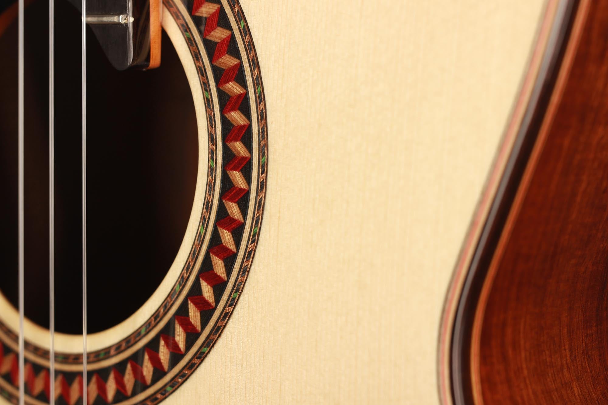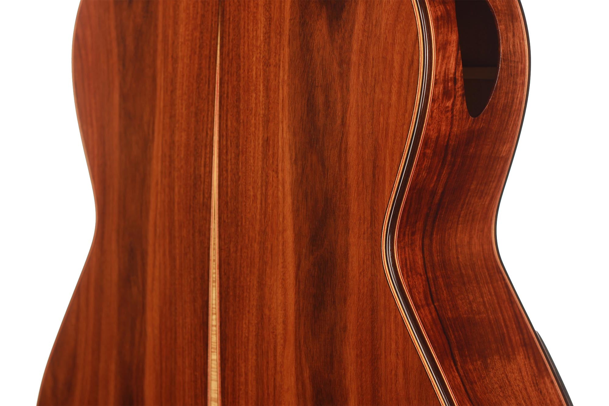 Für dieses Modell wurde die neueste Technologie der klassischen Gitarre verwendet: Double-Top, mit zwei ultradünnen Schichten hochwertiger Klanghölzer auf beiden Seiten einer Schicht Nomex, um die für die Haltbarkeit der Decke erforderliche Festigkeit zu erreichen. Boden und Seiten sind aus Santos Palisander gefertigt.