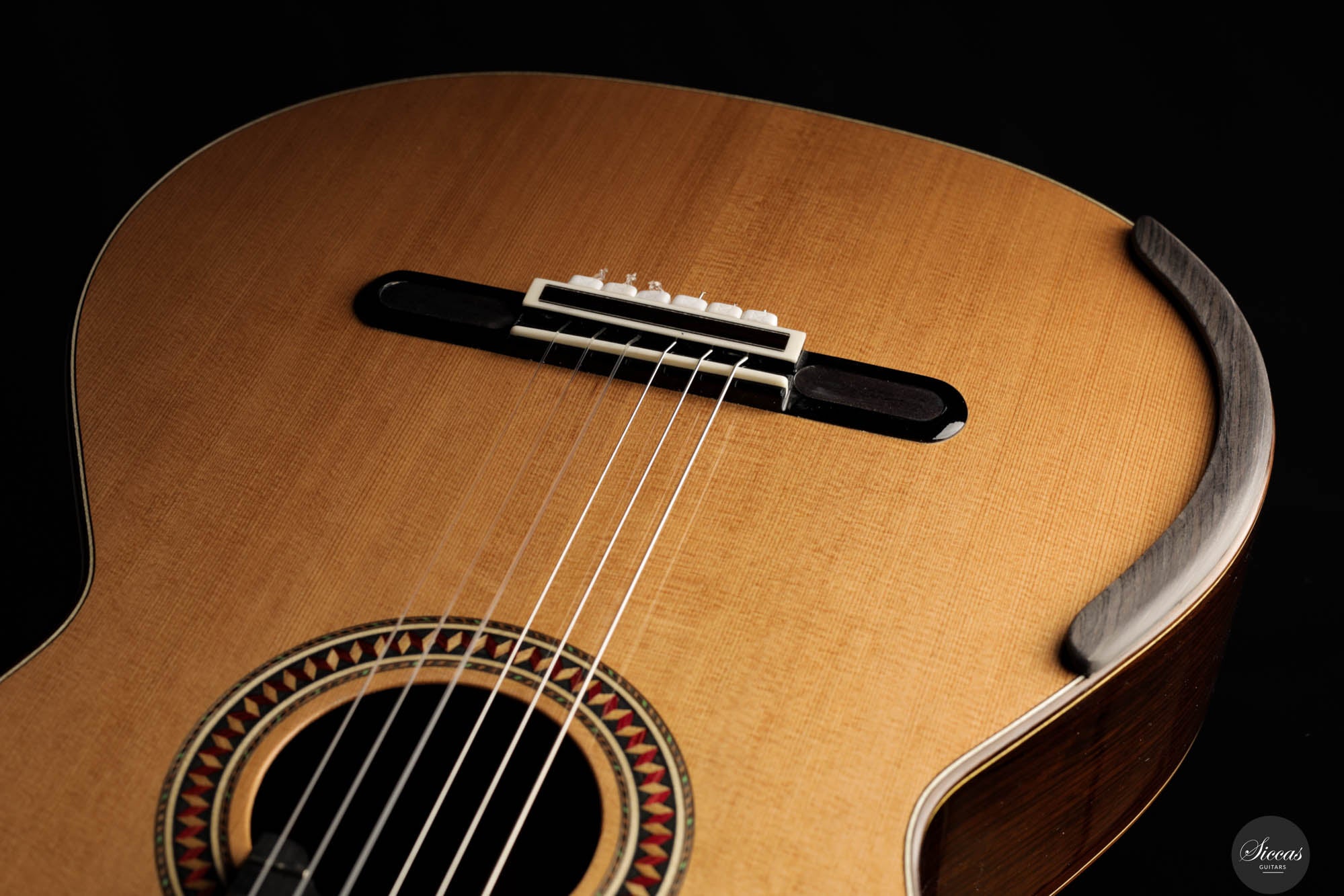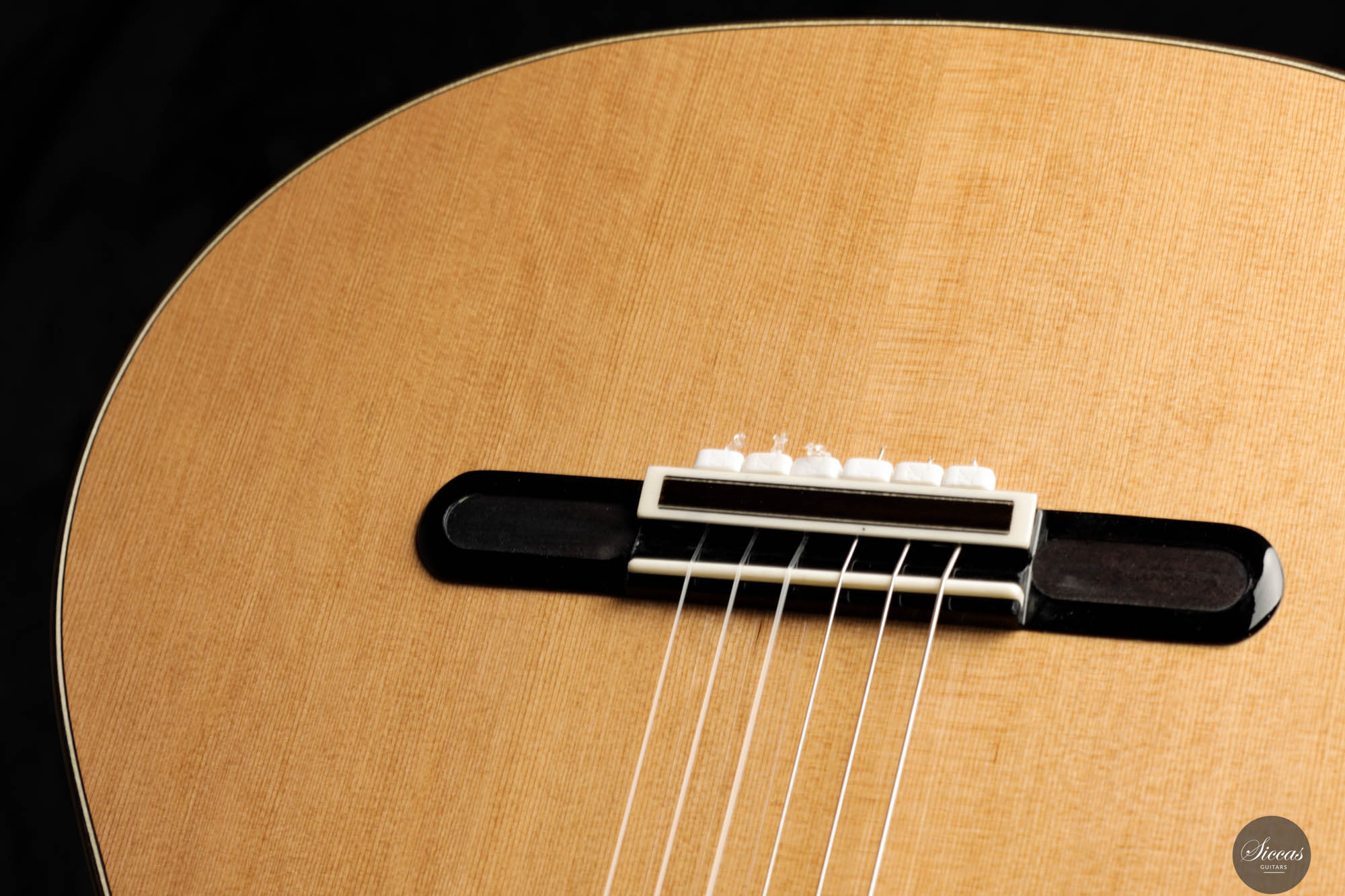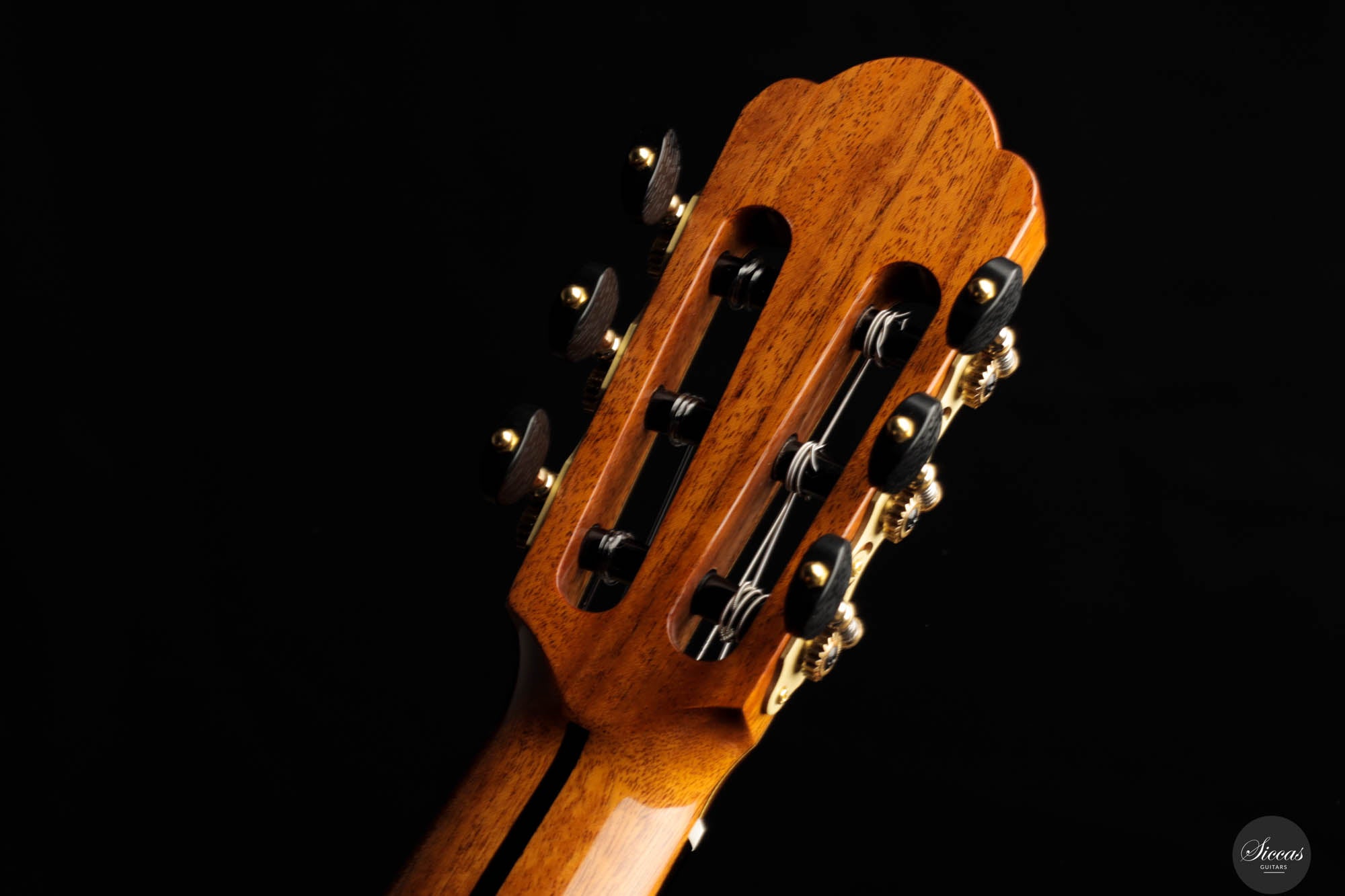 Mit dieser Doppeltop-Gitarre hat sich Dieter Müller wirklich selbst übertroffen. Er hat sie mit einer erstklassigen Zederndecke und wunderschönem Madagaskar-Palisander Boden und Zargen gebaut. Ihr Klangvolumen ist beeindruckend, ebenso wie ihre hervorragenden Spieleigenschaften. Besonders auffällig ist das für eine so leichte Doppeldeckengitarre außergewöhnlich lange Sustain. Eine Eigenschaft, die der ersten Saite eine lebendige Präsenz verleiht und es dem Gitarristen ermöglicht, virtuose Stücke und getragene, langsame Melodien mit großer Ausdruckskraft zu spielen. Für jeden ambitionierten Linkshänder, der eine Konzertgitarre von höchster Qualität sucht, ist dies eine einmalige Gelegenheit.