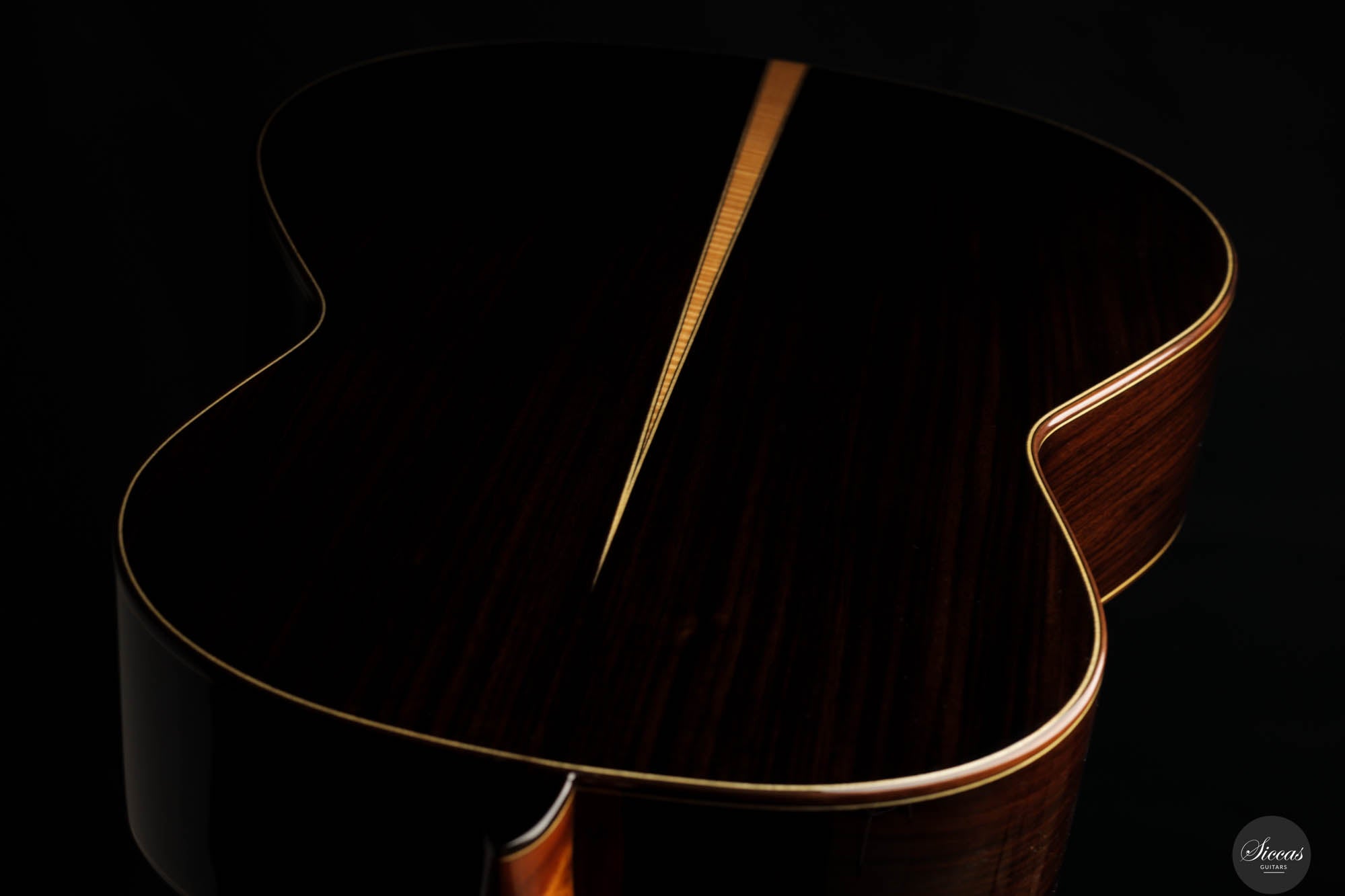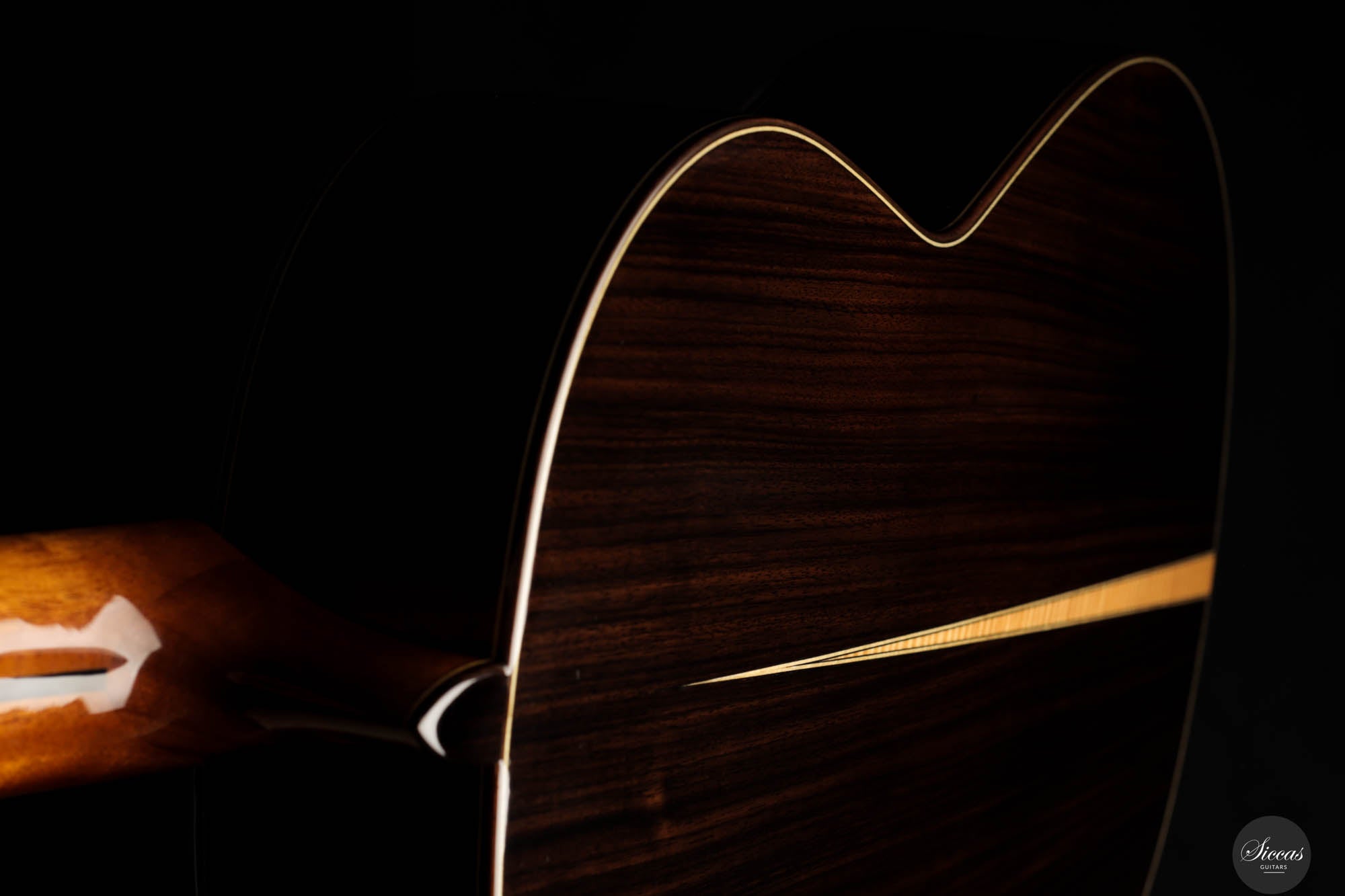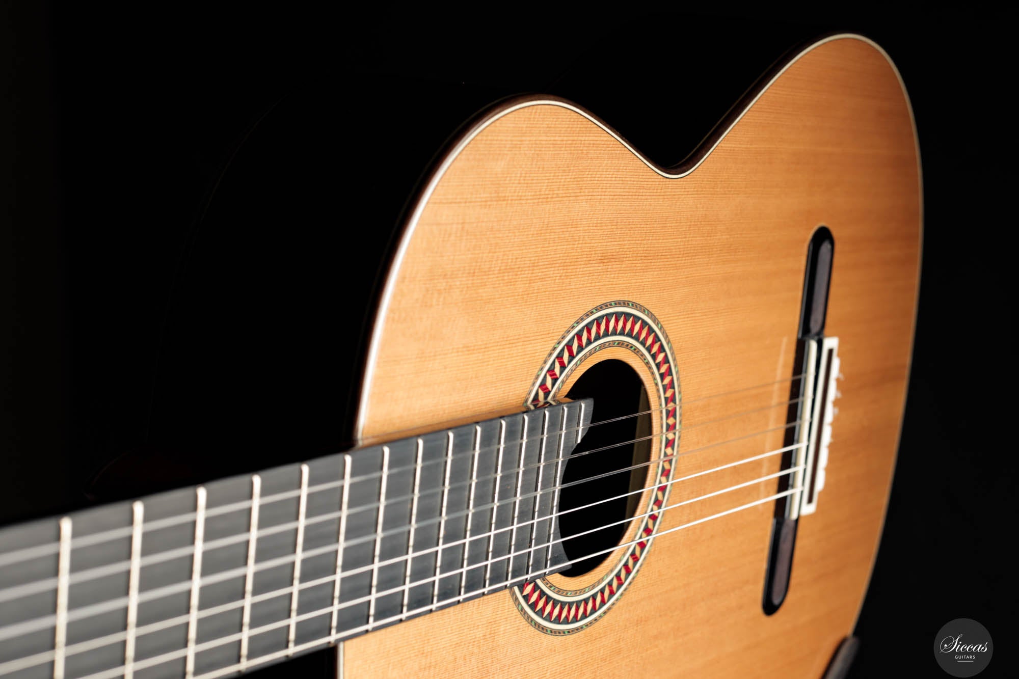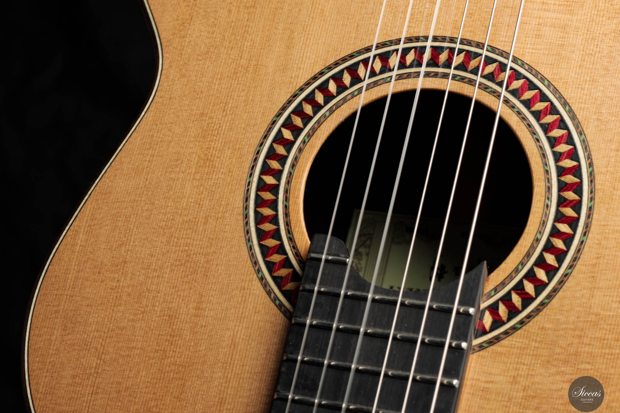 Mit dieser Doppeltop-Gitarre hat sich Dieter Müller wirklich selbst übertroffen. Er hat sie mit einer erstklassigen Zederndecke und wunderschönem Madagaskar-Palisander Boden und Zargen gebaut. Ihr Klangvolumen ist beeindruckend, ebenso wie ihre hervorragenden Spieleigenschaften. Besonders auffällig ist das für eine so leichte Doppeldeckengitarre außergewöhnlich lange Sustain. Eine Eigenschaft, die der ersten Saite eine lebendige Präsenz verleiht und es dem Gitarristen ermöglicht, virtuose Stücke und getragene, langsame Melodien mit großer Ausdruckskraft zu spielen. Für jeden ambitionierten Linkshänder, der eine Konzertgitarre von höchster Qualität sucht, ist dies eine einmalige Gelegenheit.