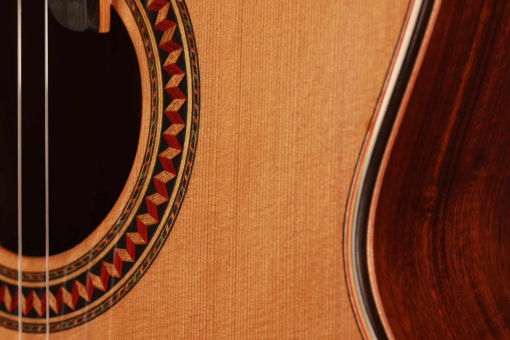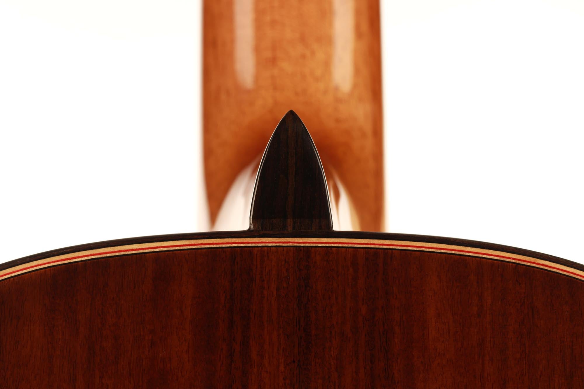 For this Chamber Concert model the latest classical guitar technology was used: double-top with two ultra-thin layers of high quality sound woods on either side of a layer of Nomex to give the strength needed for the durability of the top. The violin-style arched back and the sides are made of Santos Rosewood. The guitar has an amazing sound projection and volume, making it ideal for concert performances. The upper bout of the body is sloped to give a ‘raised fingerboard’ in the style of Humphrey guitars. The ebony fingerboard is 52 mm in width at the nut and 62 mm at the 12th fret. The fingerboard also extends to the 20th fret for the treble strings. An armrest, ultra-smooth frets and a low string action make the Chamber Concert exceptionally easy and comfortable to play. This guitar is CITES-free! The original hard-shell case is included.