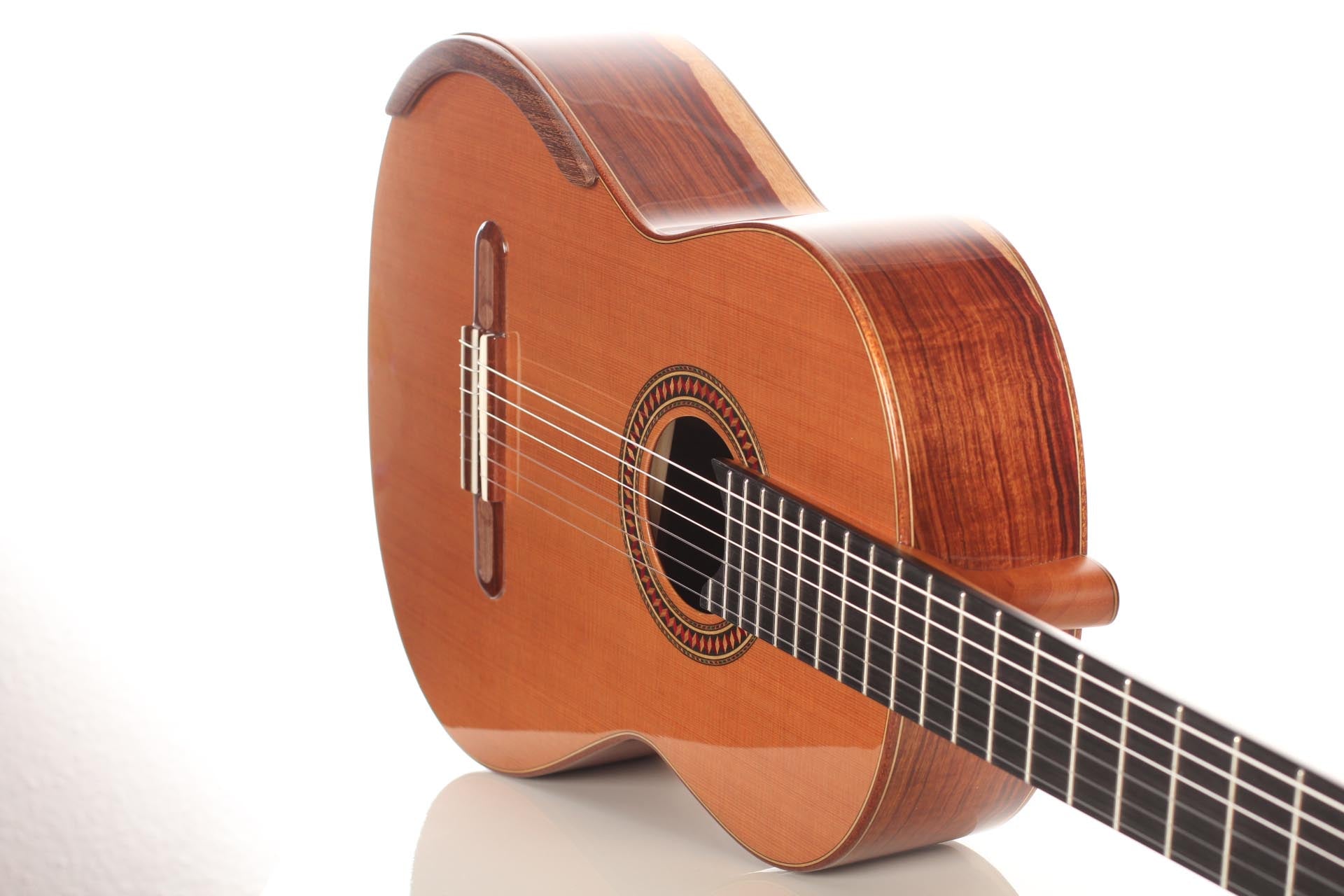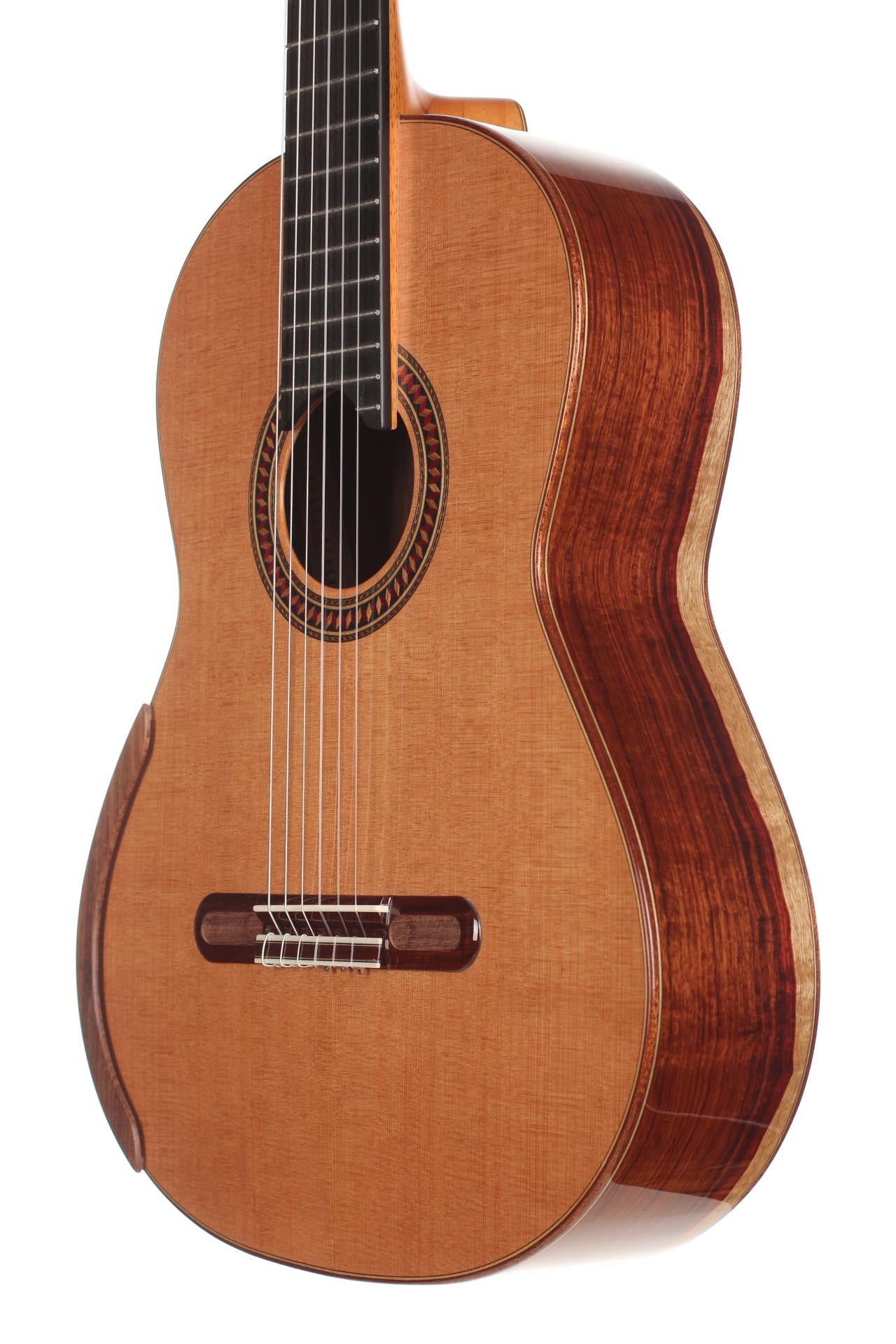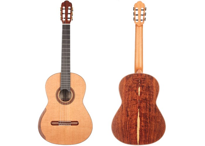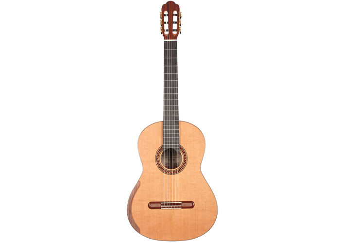 For this Chamber Concert model the latest classical guitar technology was used: double-top with two ultra-thin layers of high quality sound woods on either side of a layer of Nomex to give the strength needed for the durability of the top. Back and sides are made of Santos Rosewood. The guitar has an amazing sound projection and volume, making it ideal for concert performances. The upper bout of the body is sloped to give a ‘raised fingerboard’ in the style of Humphrey guitars. The ebony fingerboard is 52 mm in width at the nut and 62 mm at the 12th fret. The fingerboard also extends to the 20th fret for the treble strings. An armrest, ultra-smooth frets and a low string action make the Chamber Concert exceptionally easy and comfortable to play. This guitar is CITES-free! The original hard-shell case is included.