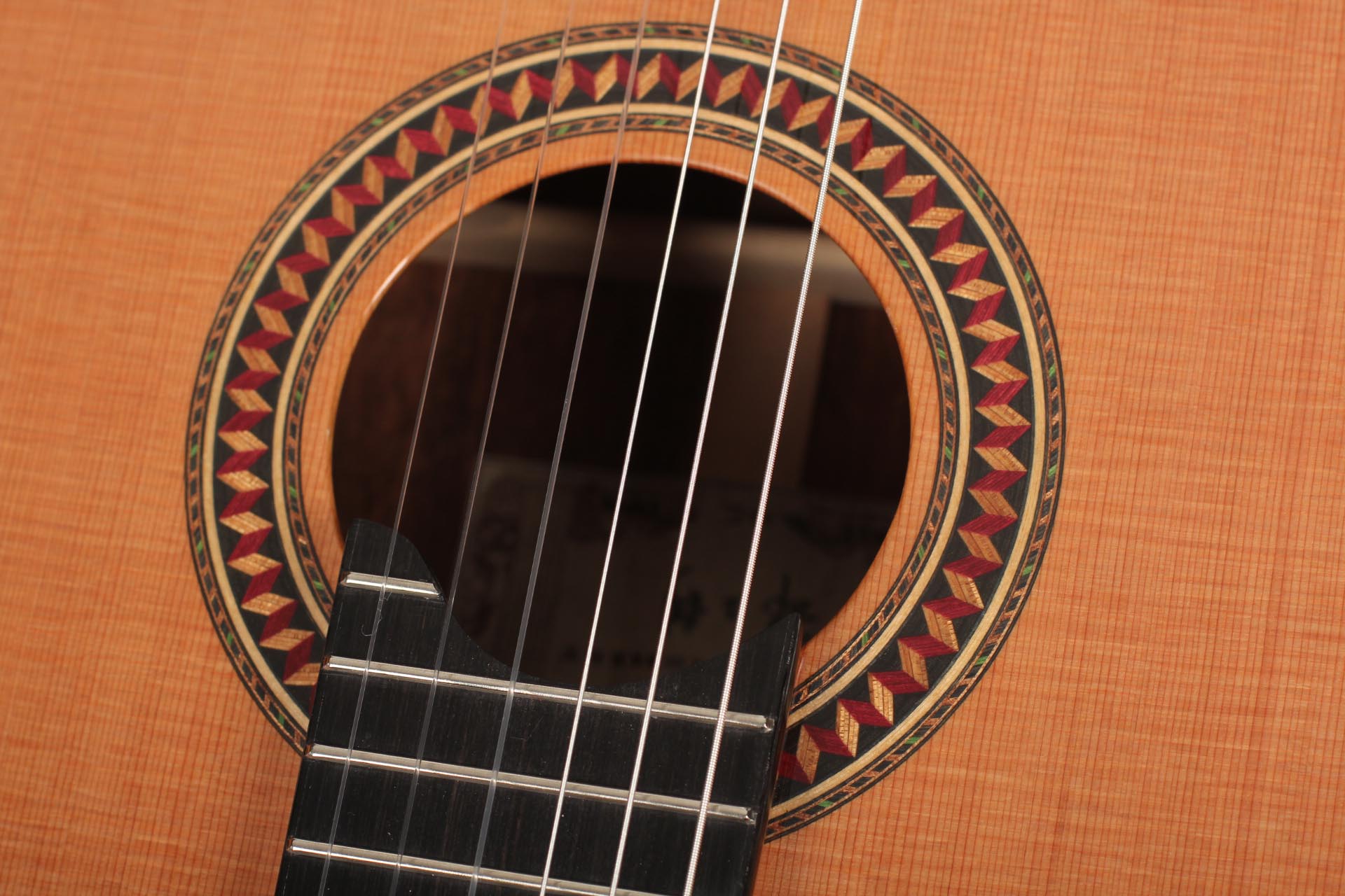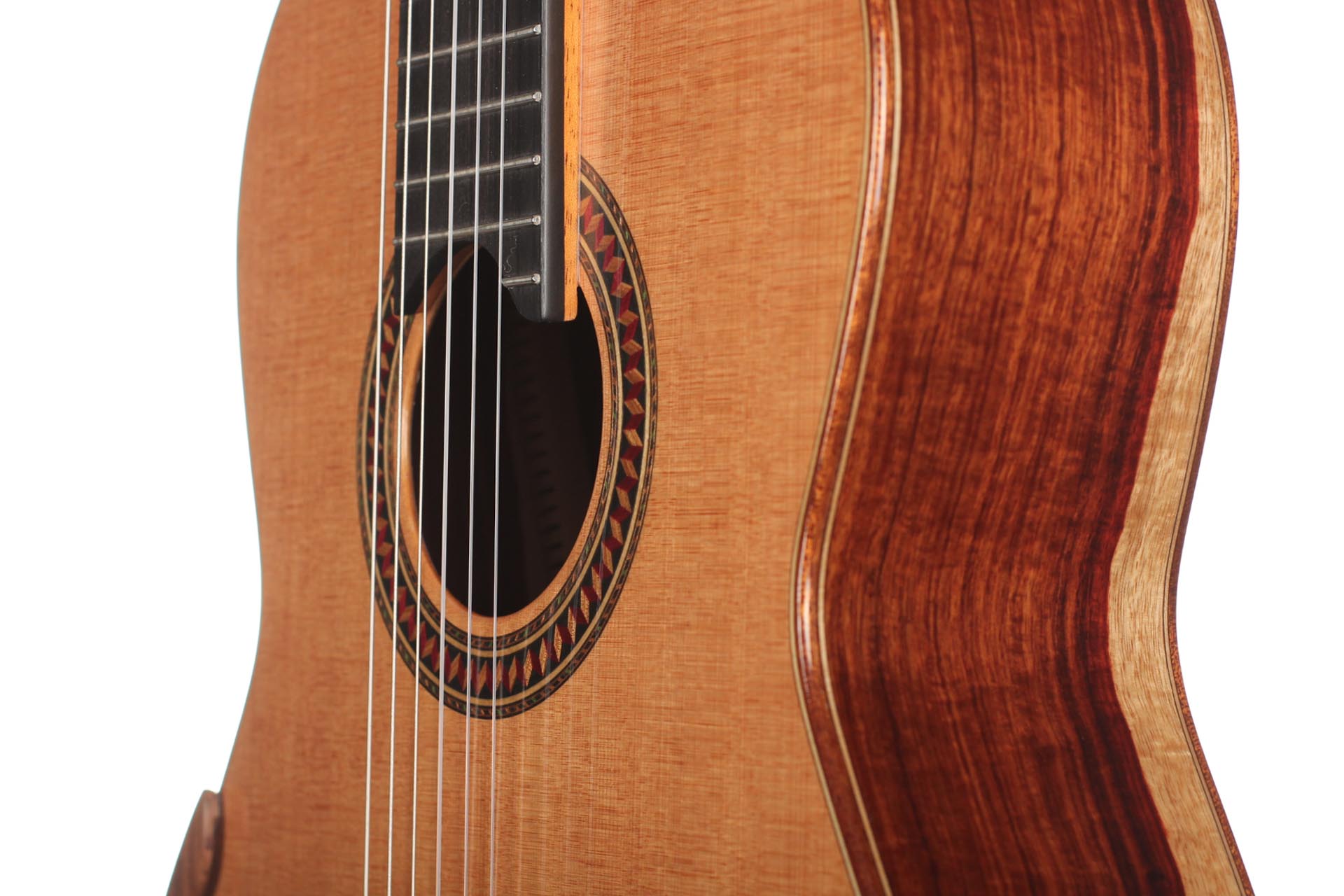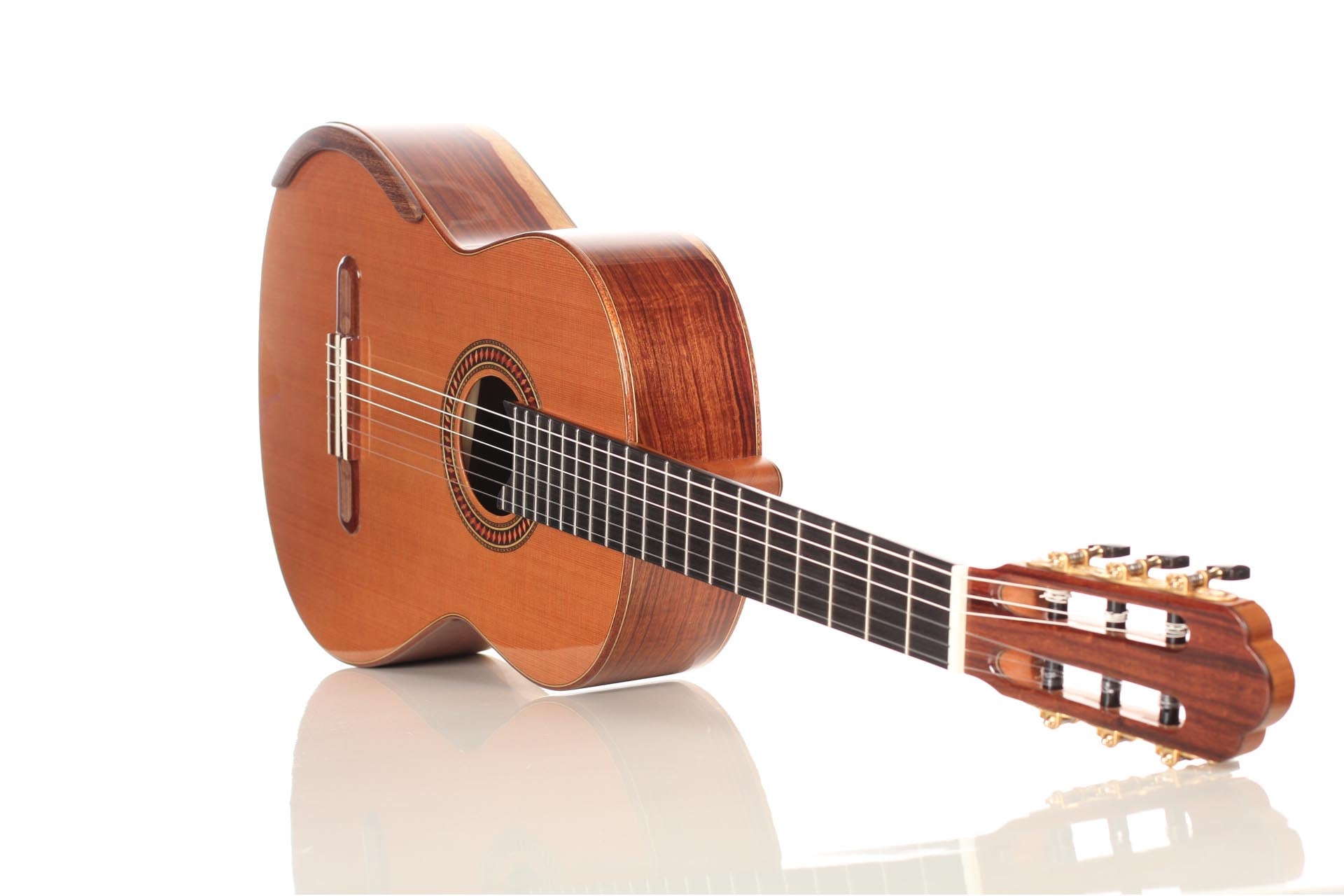 For this Chamber Concert model the latest classical guitar technology was used: double-top with two ultra-thin layers of high quality sound woods on either side of a layer of Nomex to give the strength needed for the durability of the top. Back and sides are made of Santos Rosewood. The guitar has an amazing sound projection and volume, making it ideal for concert performances. The upper bout of the body is sloped to give a ‘raised fingerboard’ in the style of Humphrey guitars. The ebony fingerboard is 52 mm in width at the nut and 62 mm at the 12th fret. The fingerboard also extends to the 20th fret for the treble strings. An armrest, ultra-smooth frets and a low string action make the Chamber Concert exceptionally easy and comfortable to play. This guitar is CITES-free! The original hard-shell case is included.