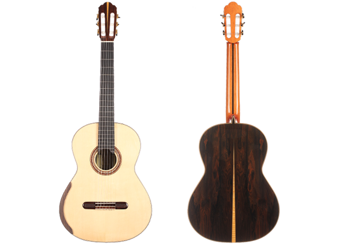 The top of this guitar is made of spruce - back and sides are made of solid Ziricote. The arched “violin back” gives the guitar amazing sound projection and volume, making it ideal for concert performances. The upper bout of the body is sloped to give a ‘raised fingerboard’ in the style of Humphrey guitars. The ebony fingerboard is 52 mm in width at the nut and 62 mm at the 12th fret. The fingerboard also extends to the 20th fret for the treble strings. A rosewood armrest, ultra-smooth frets, a low string action make the Yulong Guo Concert exceptionally easy and comfortable to play. The orignal hard-sehll case is included.