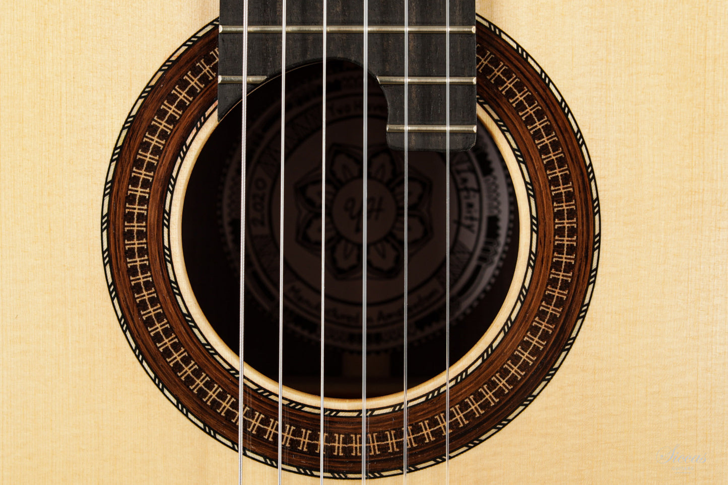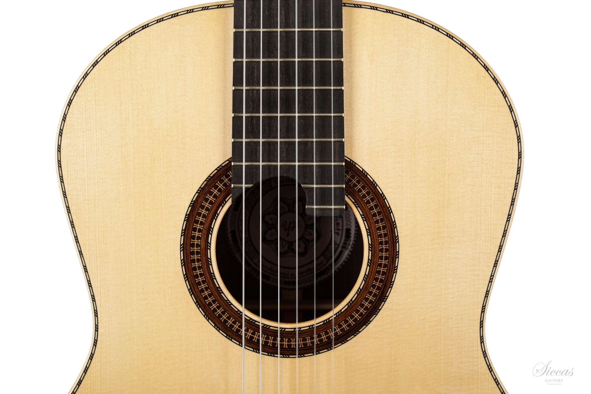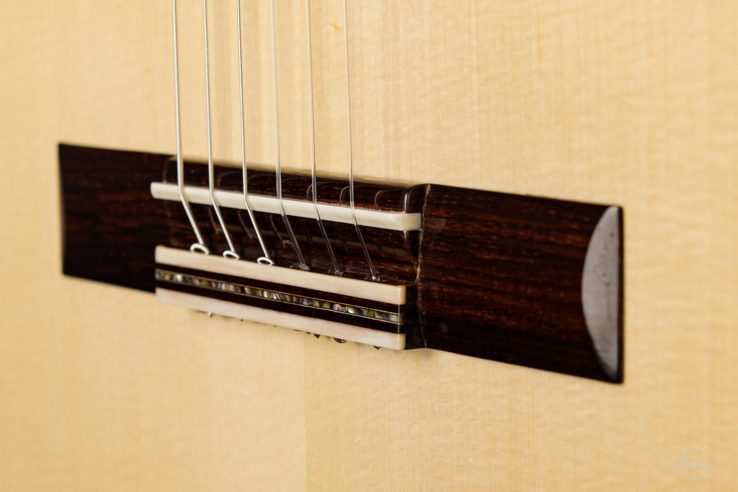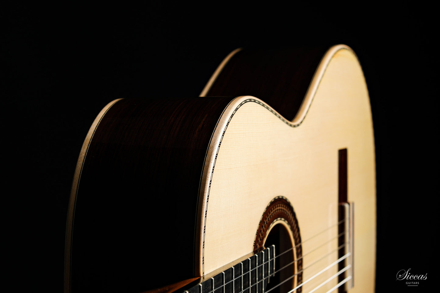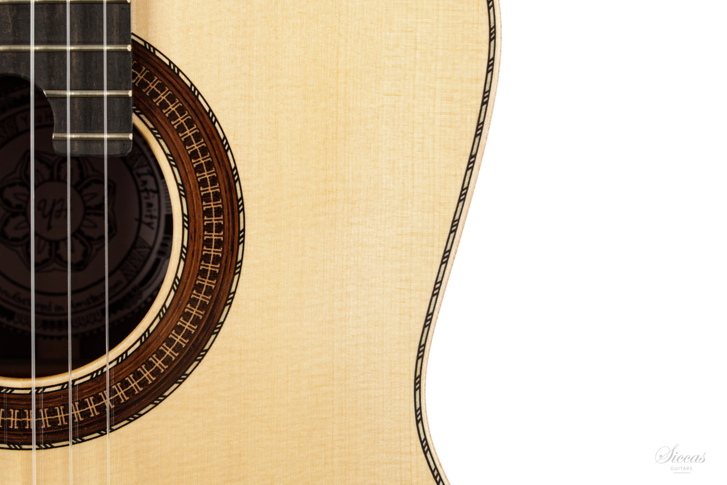 The combination of a tight grain spruce top with a very light lattice bracing offers fantastic volume and outstanding projection. The playability is splendid for both the left and right hand. This instrument leaves the guitarist great freedom allowing to approach all the repertoires. Moreover, the sound is quite expressive, and the general aesthetics absolutely charming.