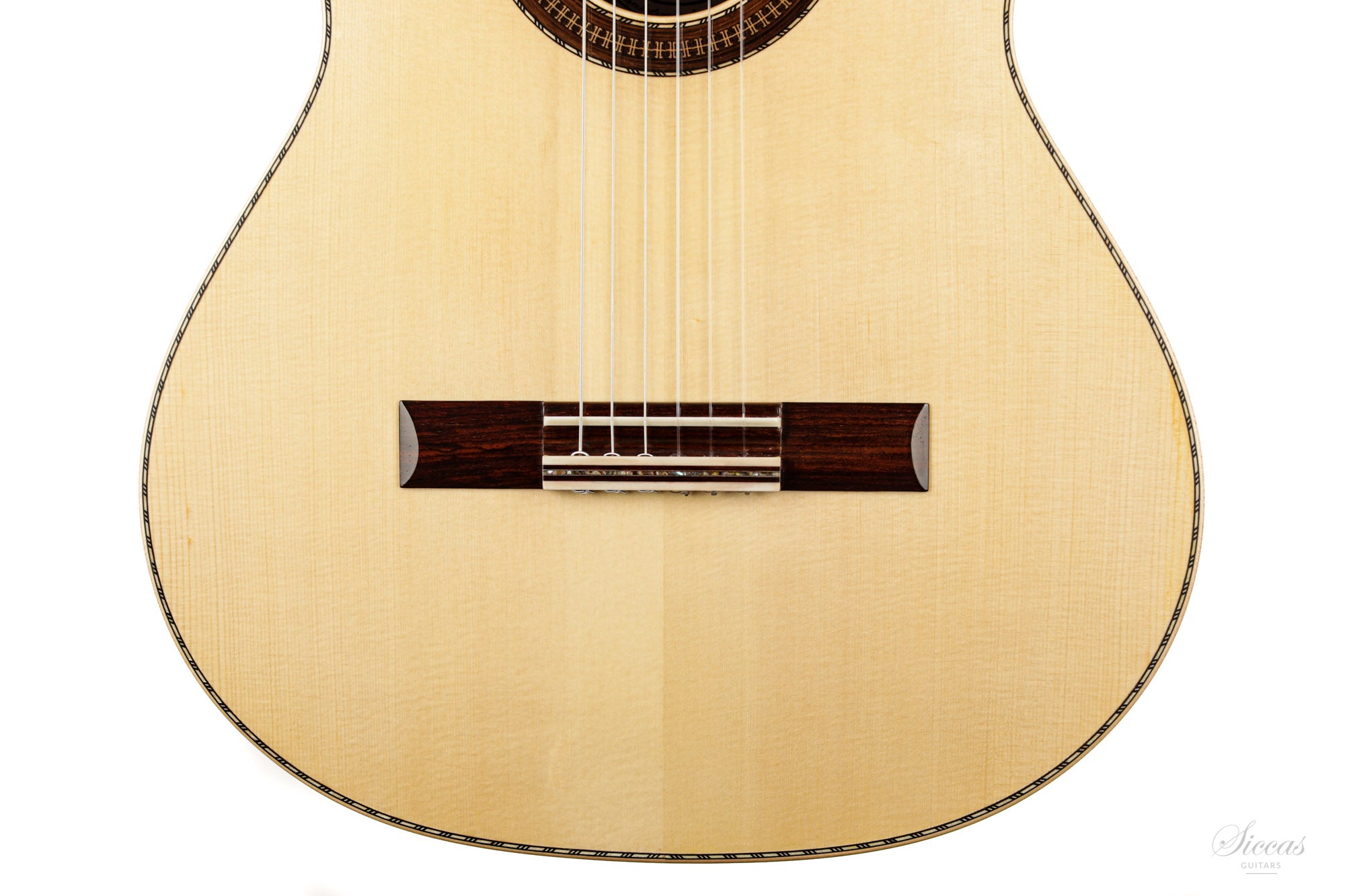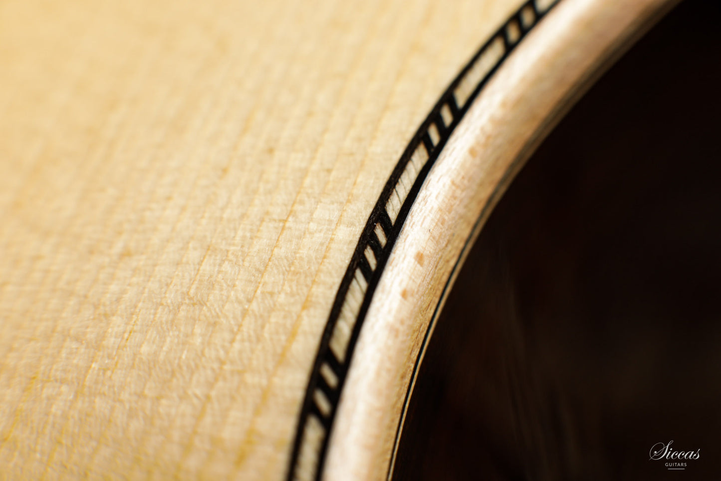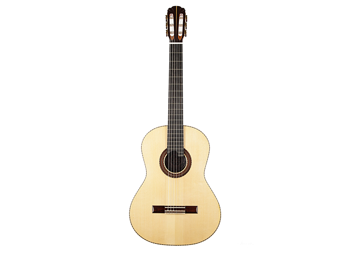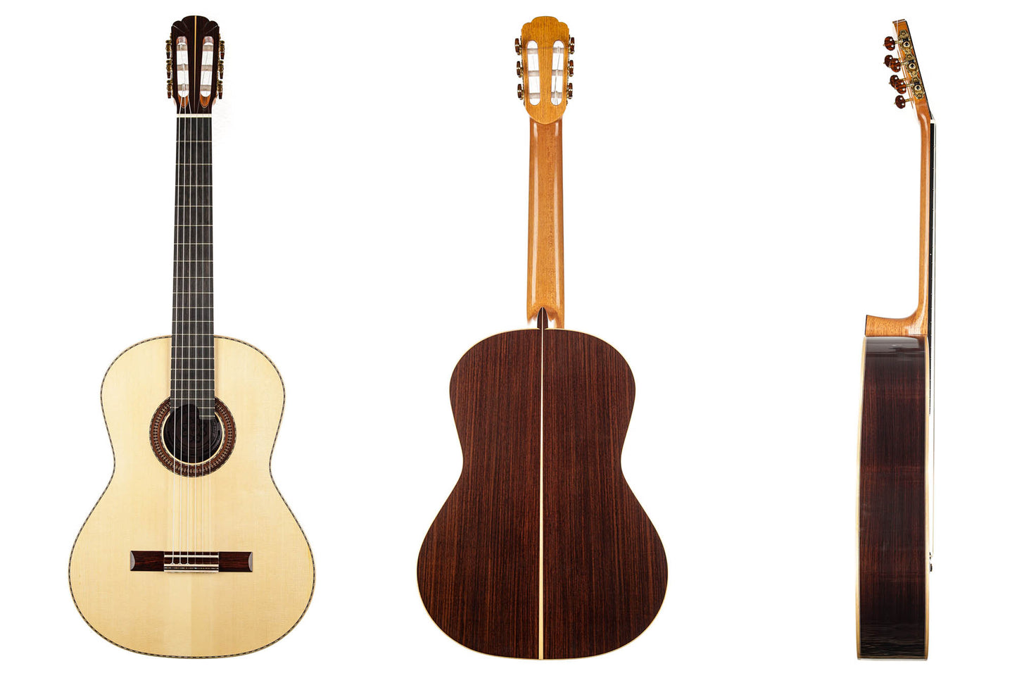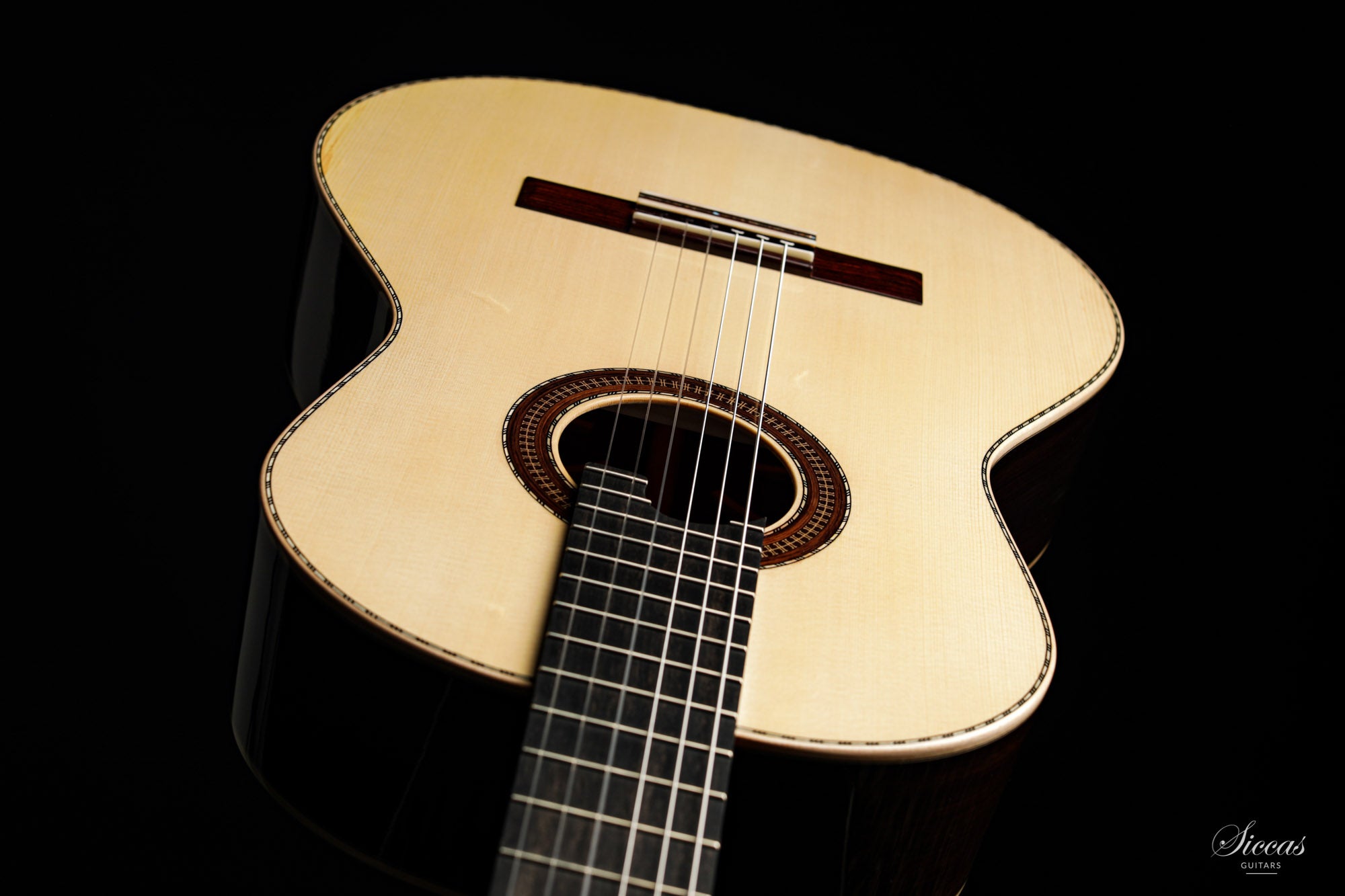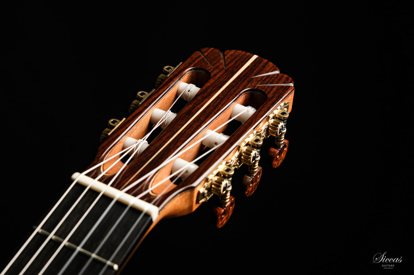 The combination of a tight grain spruce top with a very light lattice bracing offers fantastic volume and outstanding projection. The playability is splendid for both the left and right hand. This instrument leaves the guitarist great freedom allowing to approach all the repertoires. Moreover, the sound is quite expressive, and the general aesthetics absolutely charming.