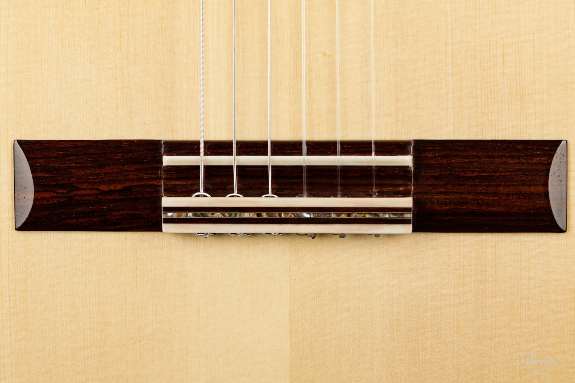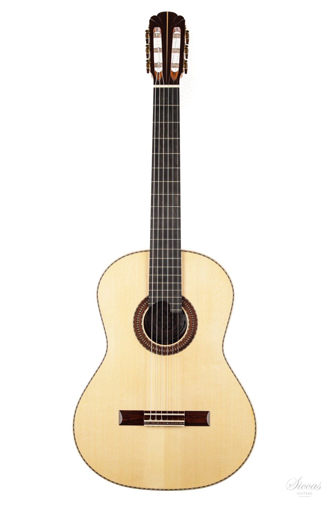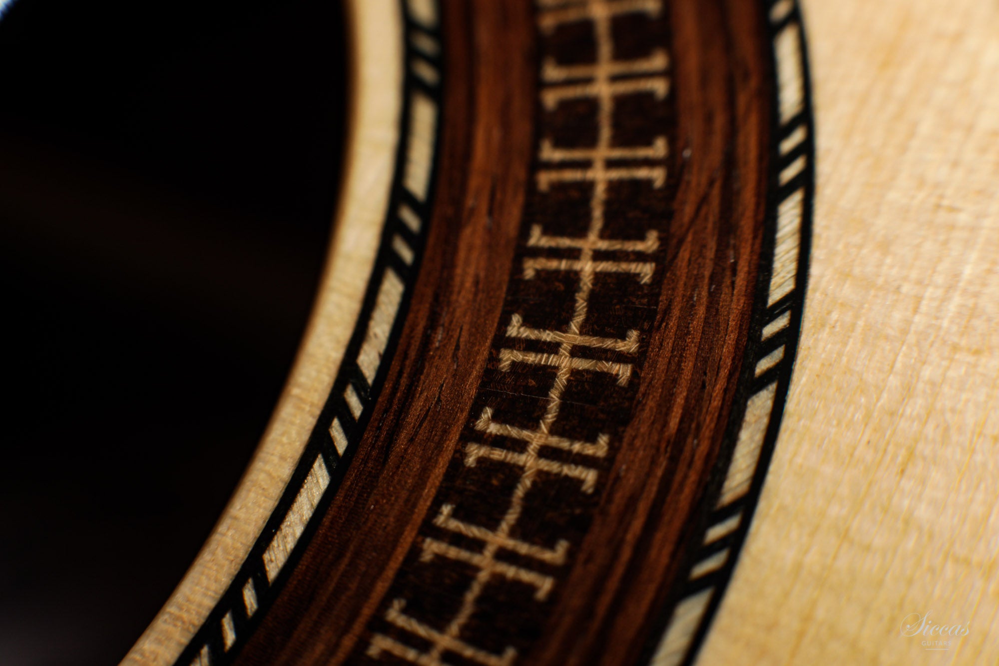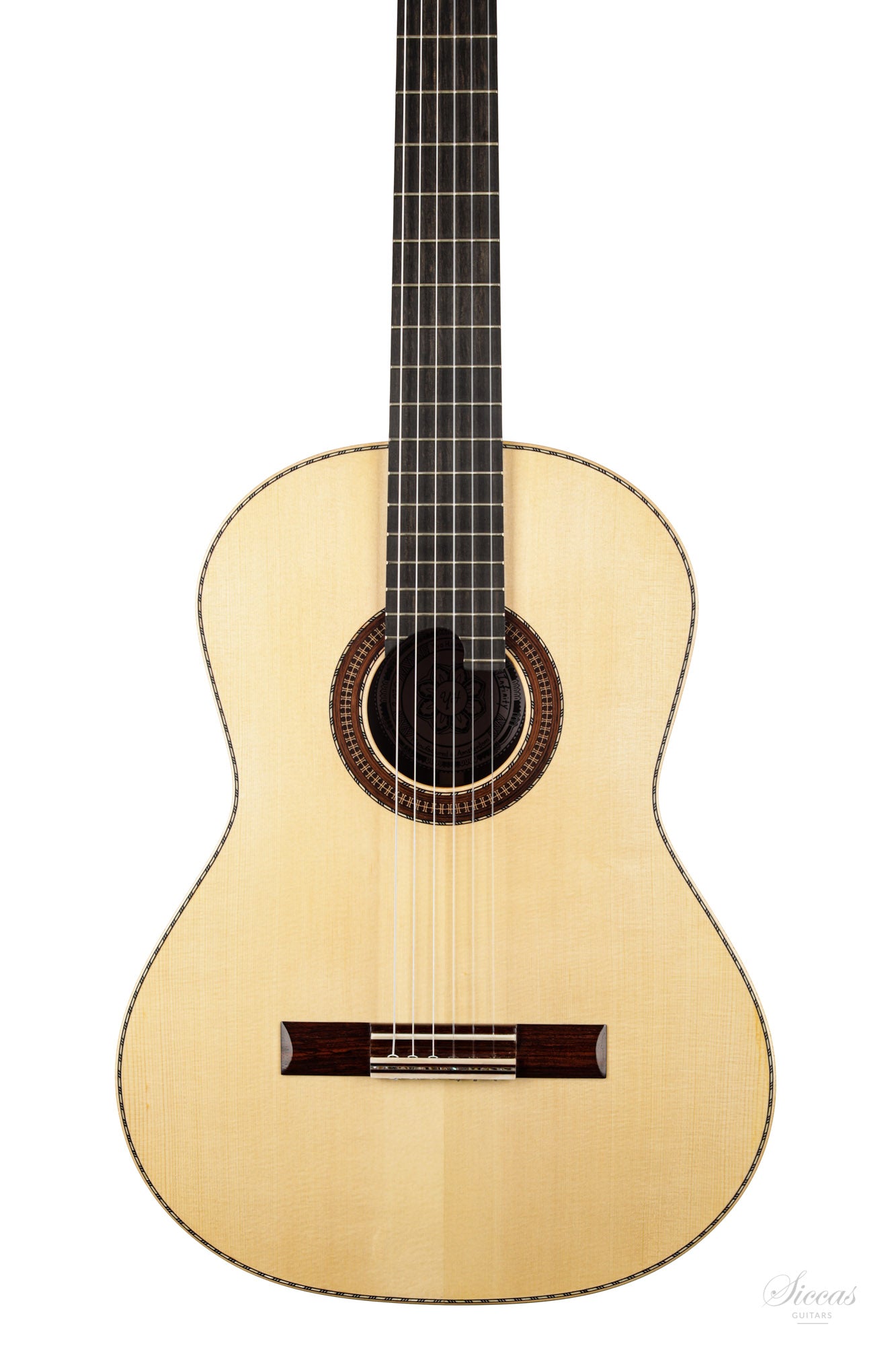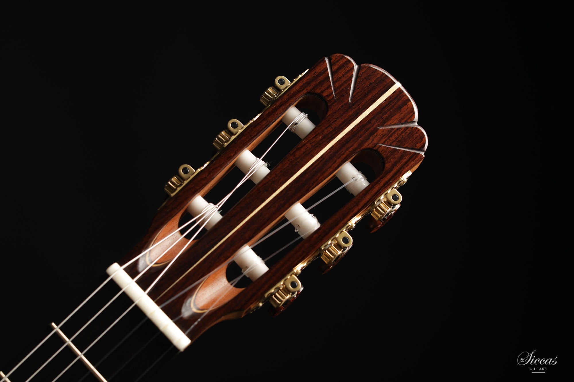 The combination of a tight grain spruce top with a very light lattice bracing offers fantastic volume and outstanding projection. The playability is splendid for both the left and right hand. This instrument leaves the guitarist great freedom allowing to approach all the repertoires. Moreover, the sound is quite expressive, and the general aesthetics absolutely charming.