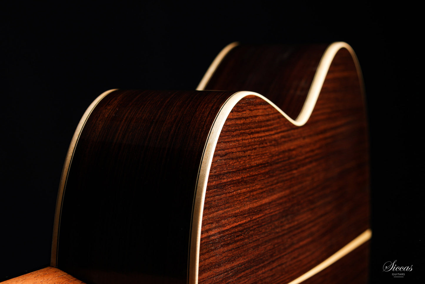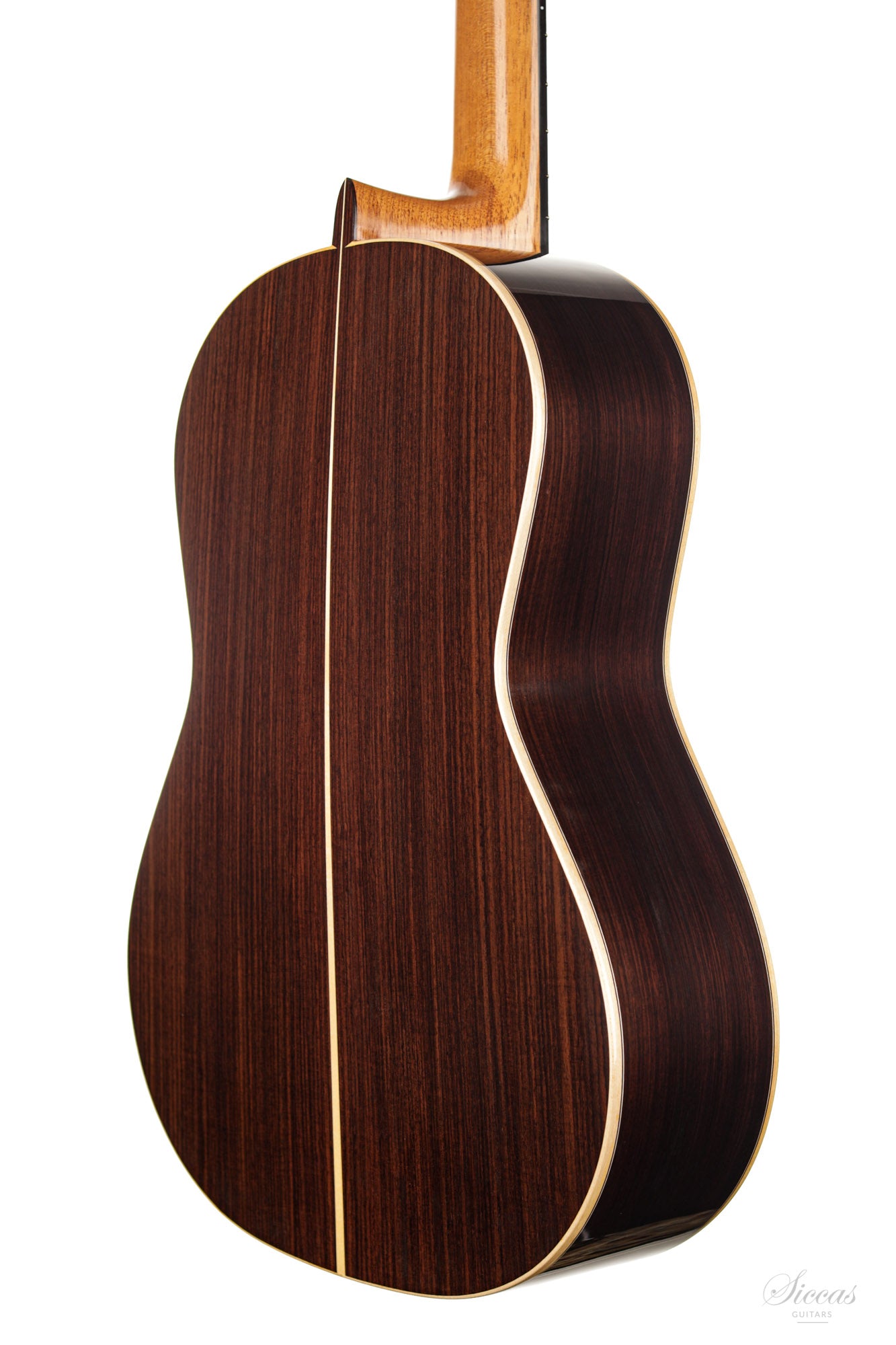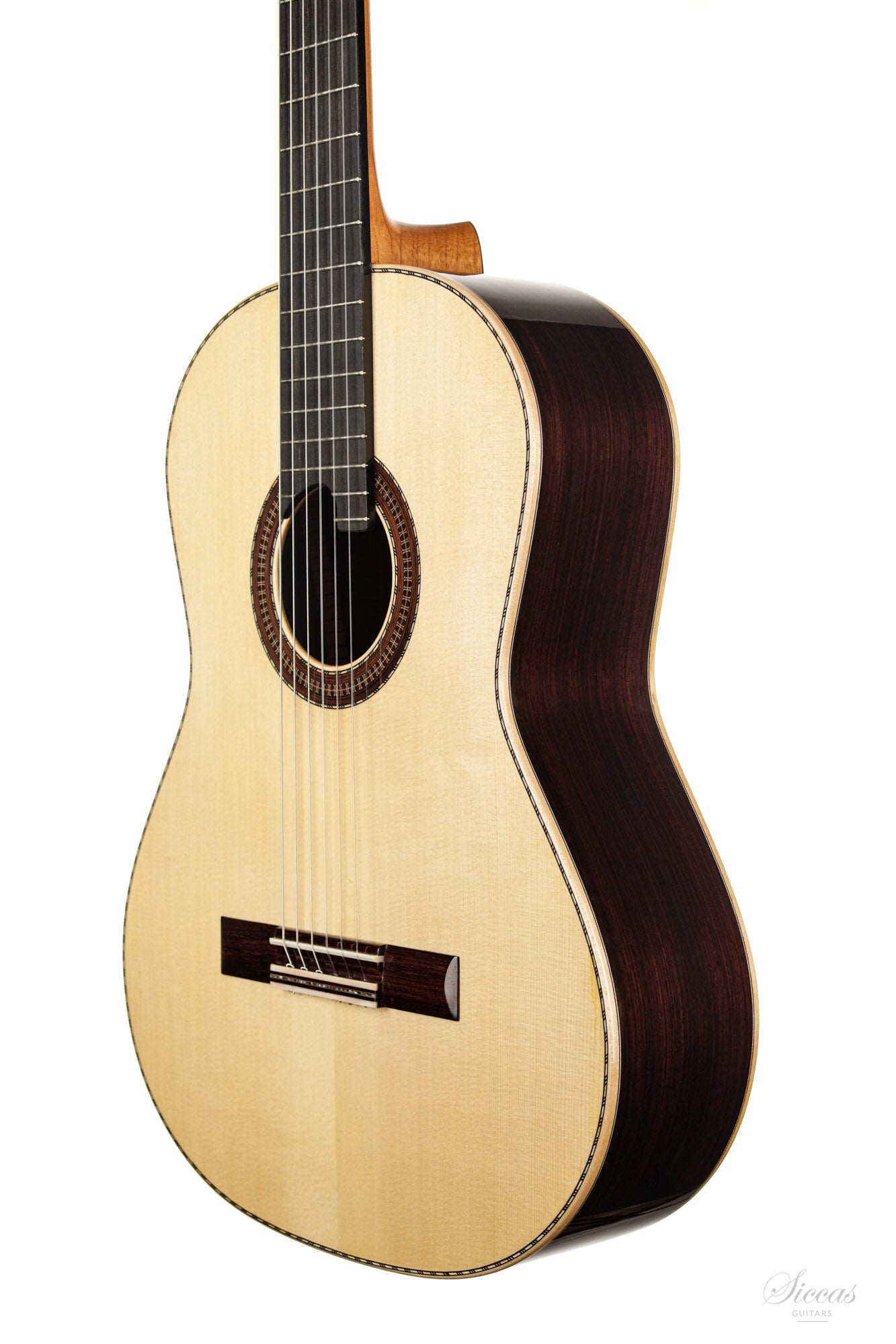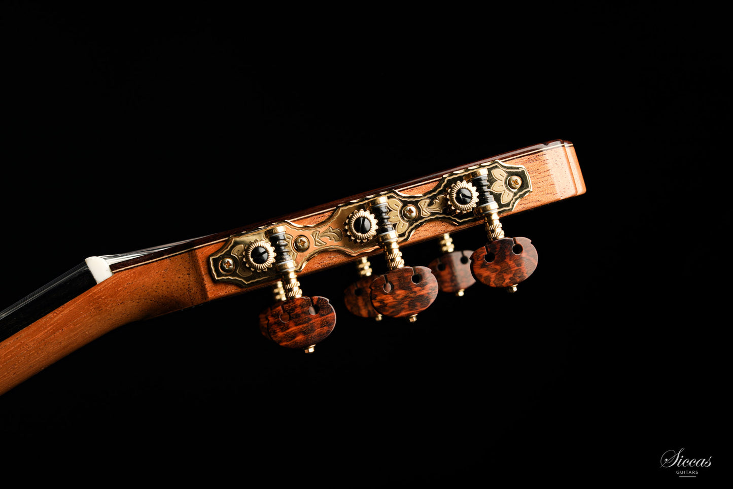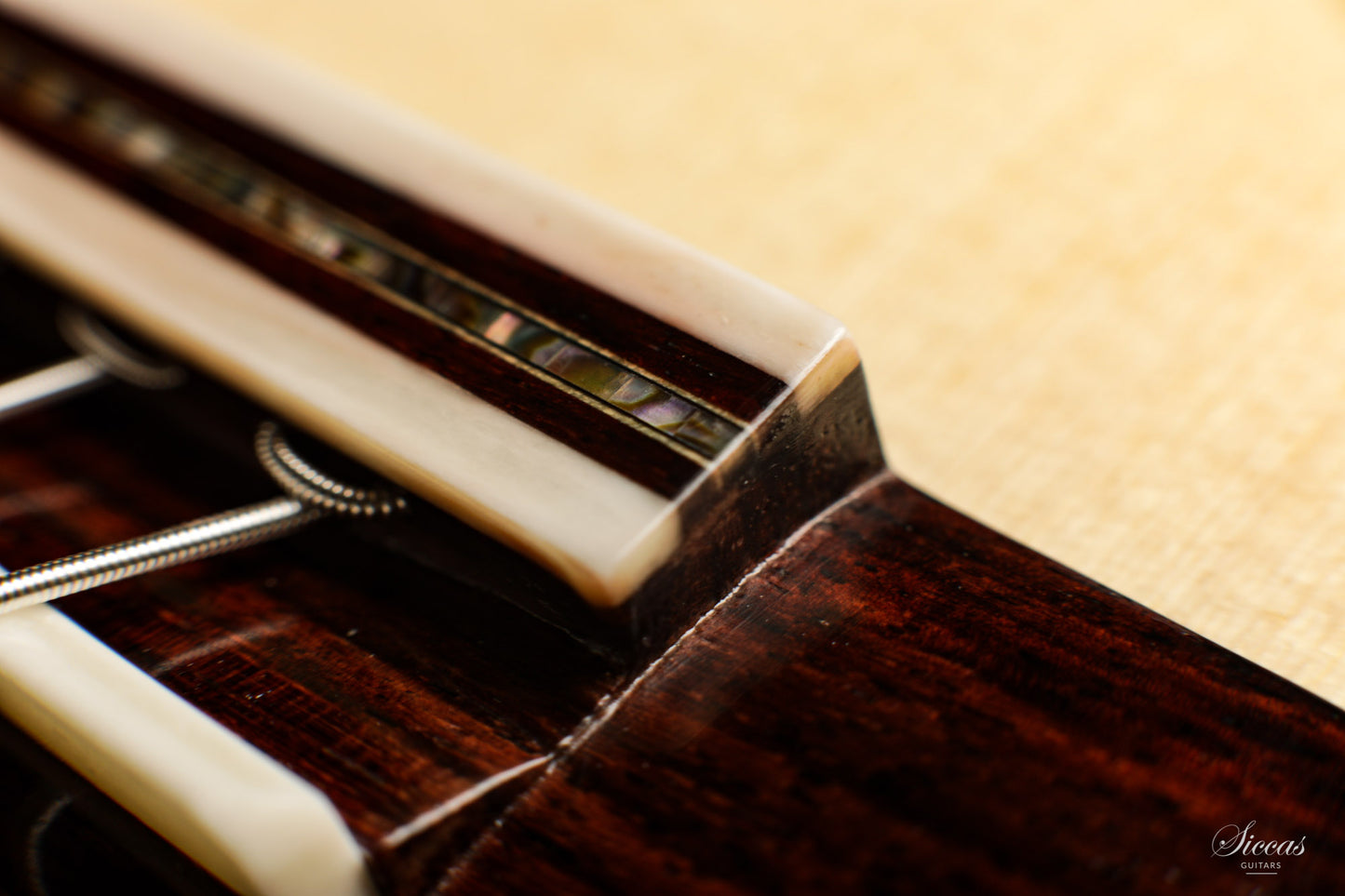 The combination of a tight grain spruce top with a very light lattice bracing offers fantastic volume and outstanding projection. The playability is splendid for both the left and right hand. This instrument leaves the guitarist great freedom allowing to approach all the repertoires. Moreover, the sound is quite expressive, and the general aesthetics absolutely charming.
