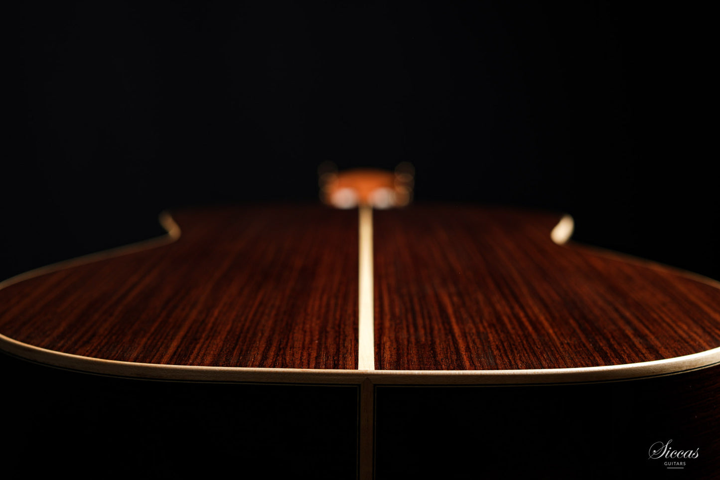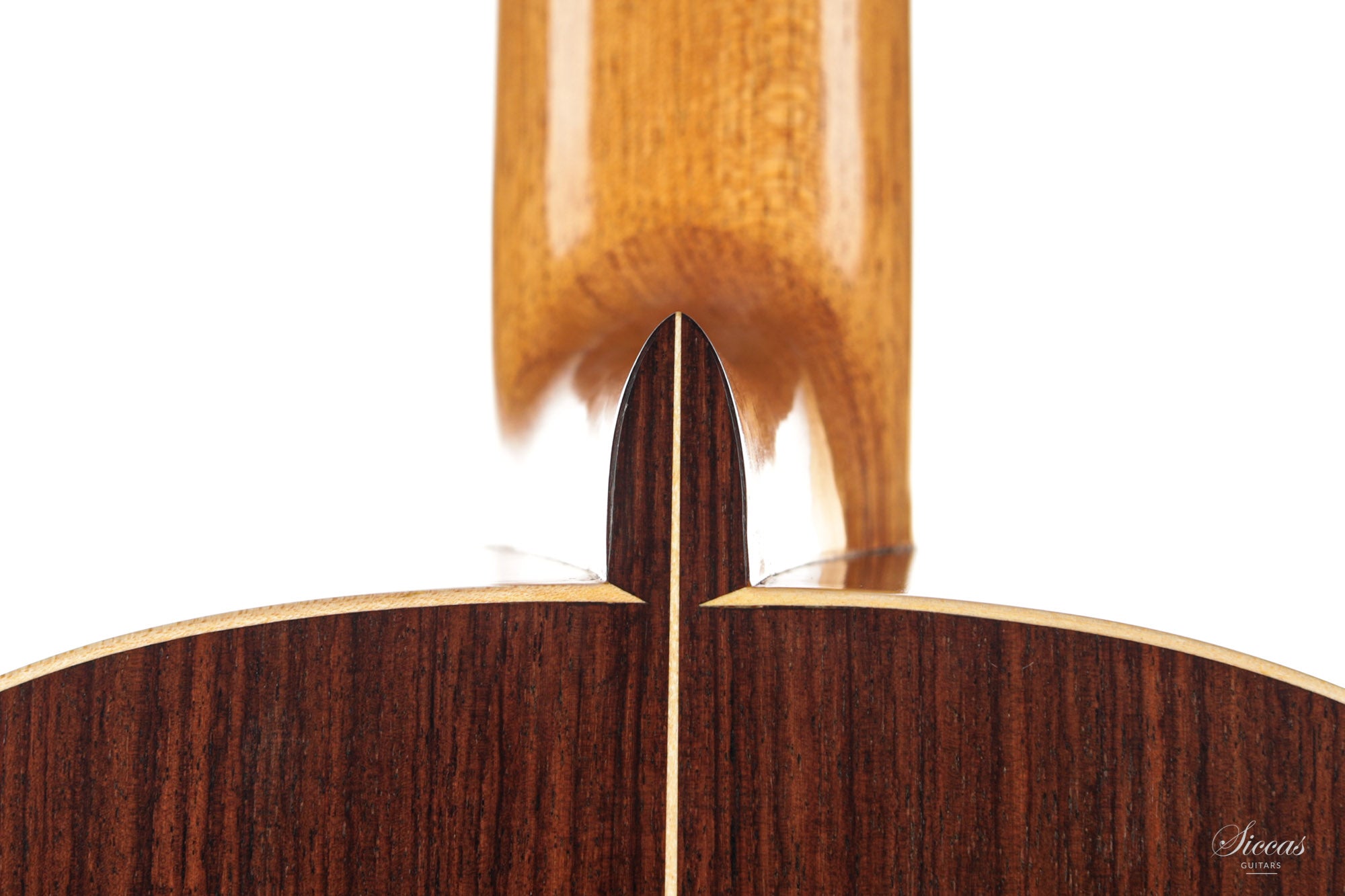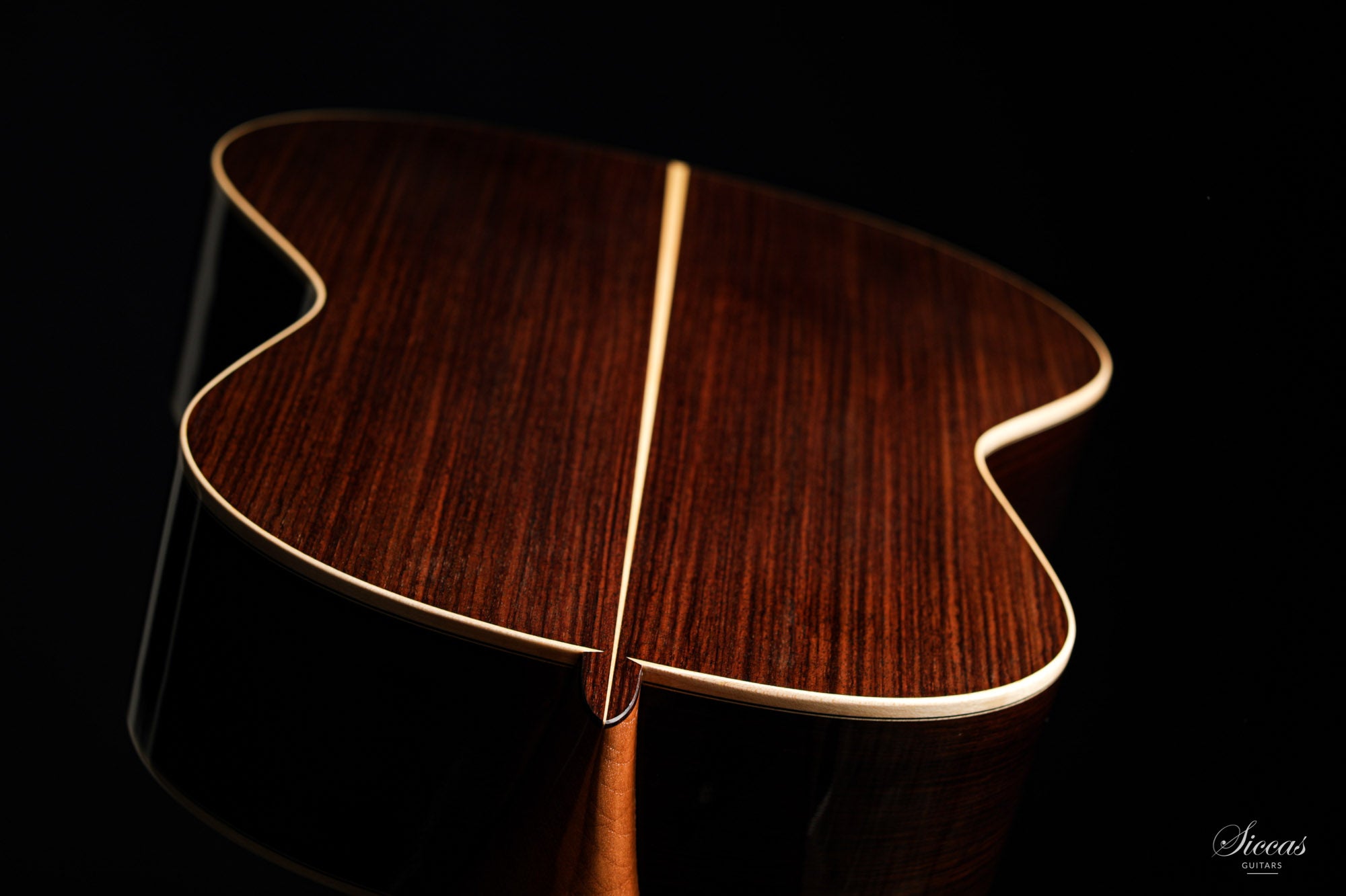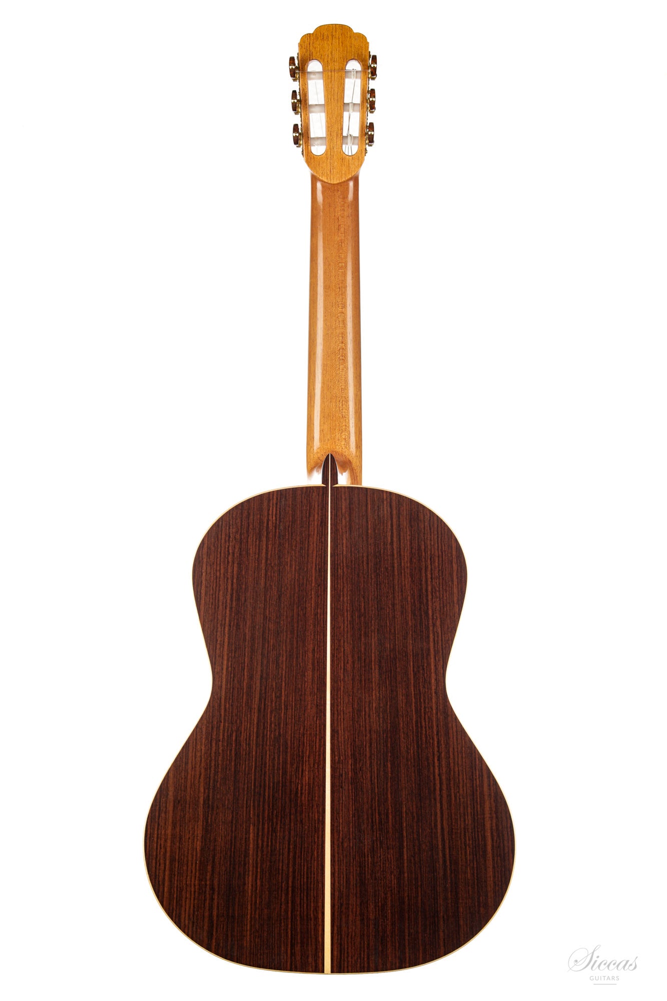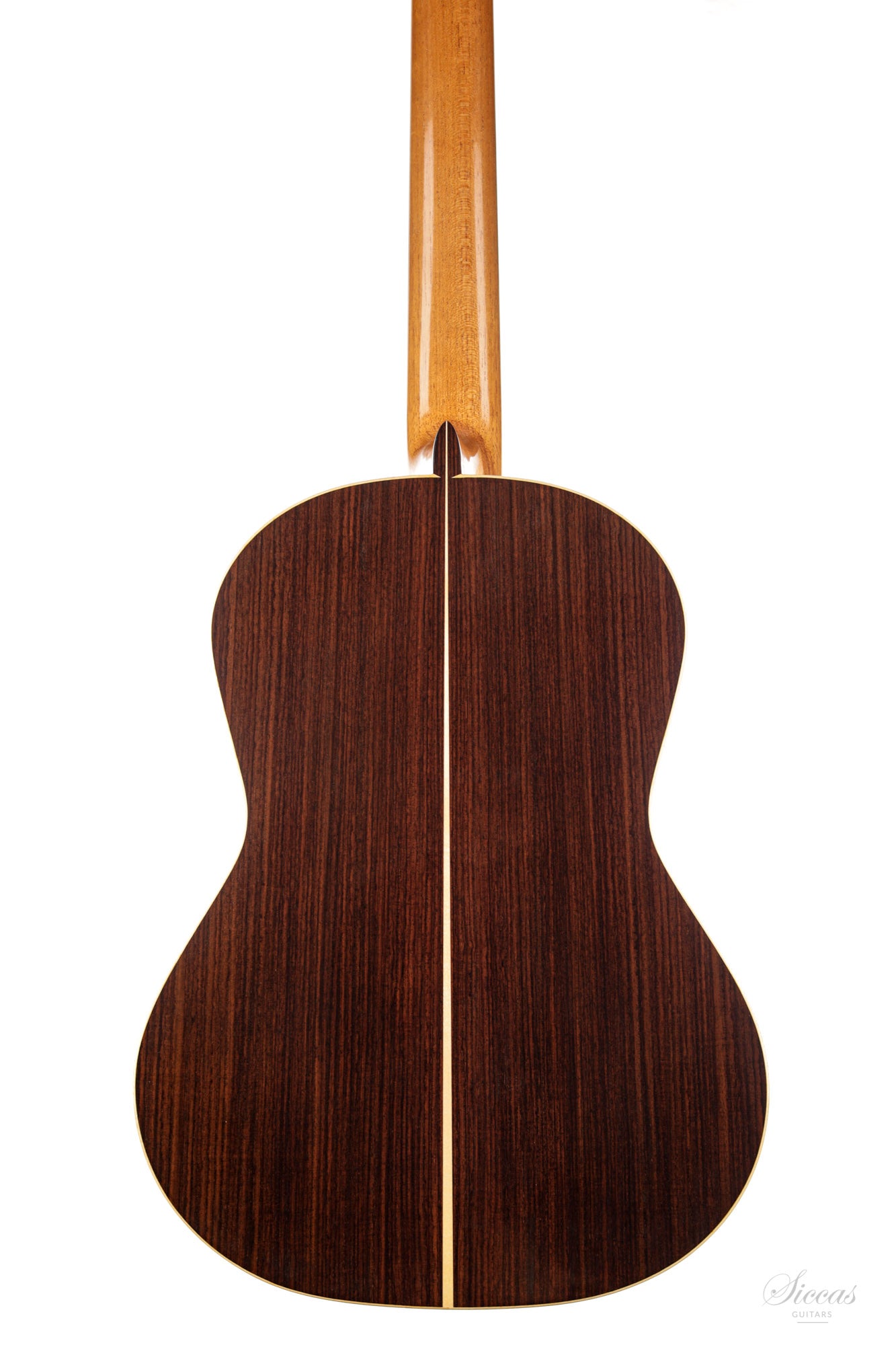 The combination of a tight grain spruce top with a very light lattice bracing offers fantastic volume and outstanding projection. The playability is splendid for both the left and right hand. This instrument leaves the guitarist great freedom allowing to approach all the repertoires. Moreover, the sound is quite expressive, and the general aesthetics absolutely charming.