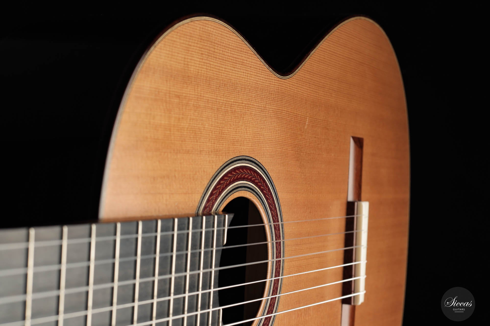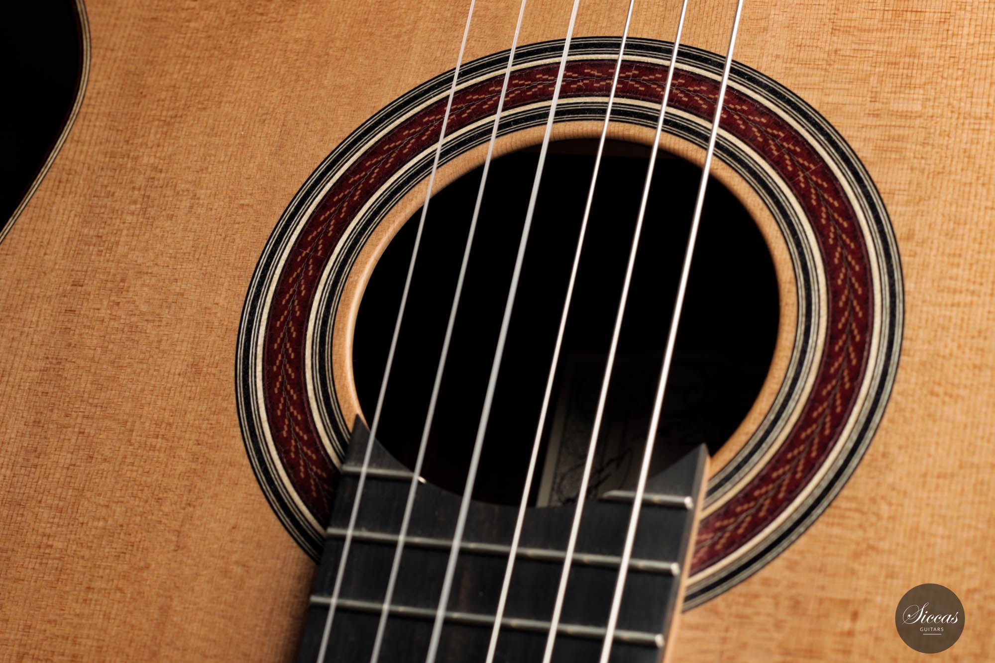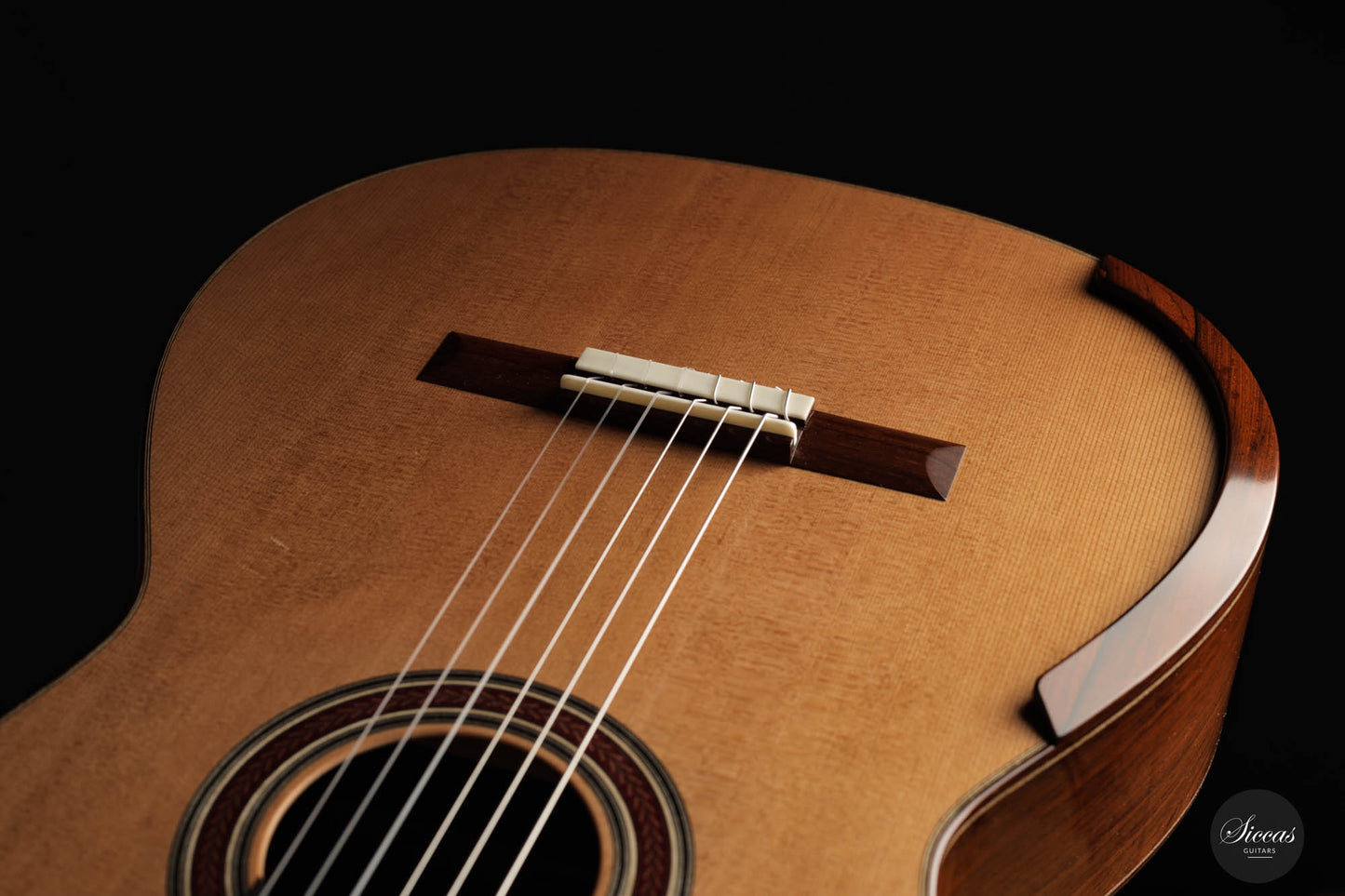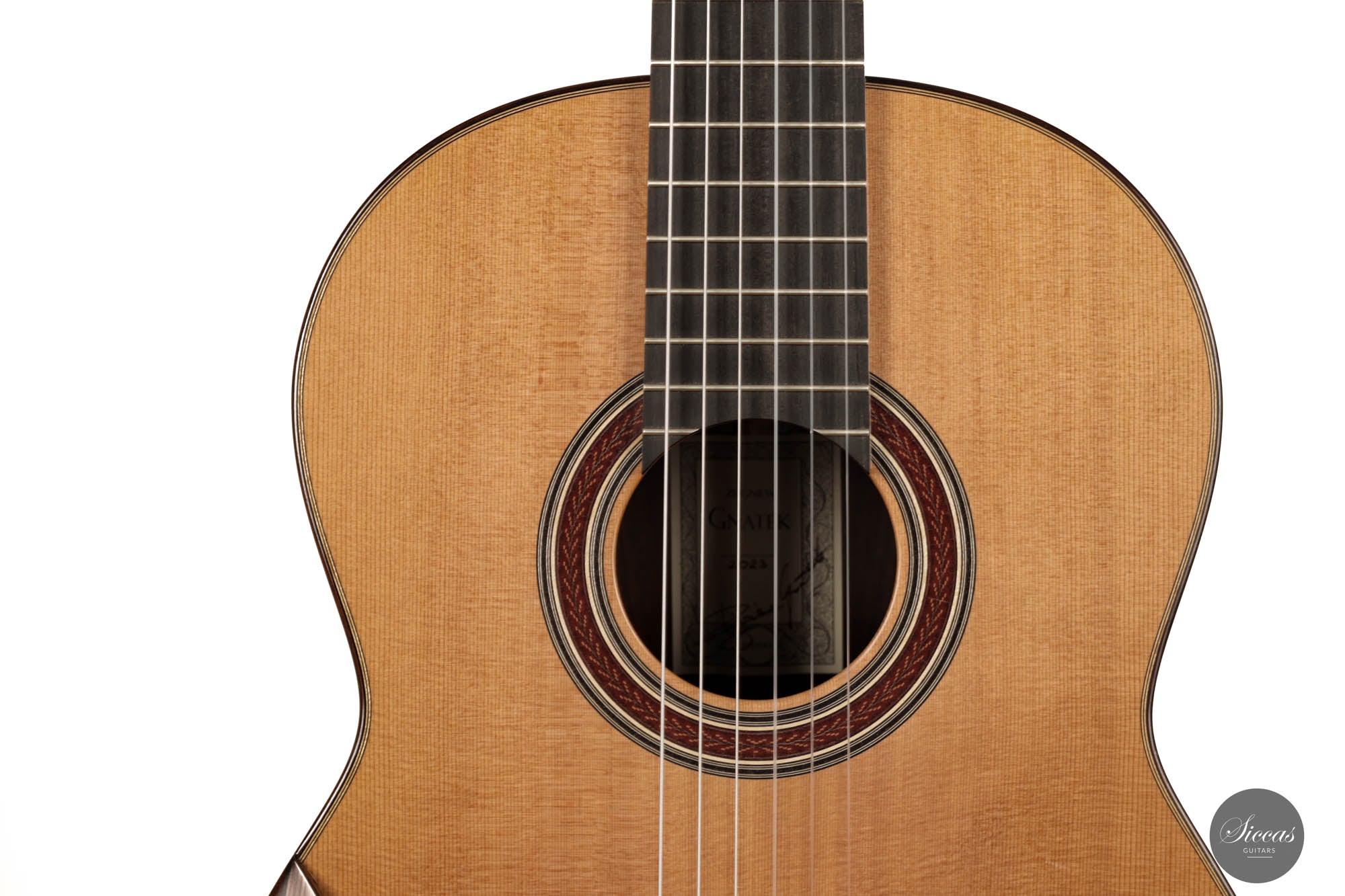 Diese Zbigniew-Gnatek-Gitarre aus dem Jahr 2023 stellt eine beeindruckende Leistung auf dem Gebiet der Geigenbaukunst dar, die ein Gleichgewicht zwischen ästhetischer Anmut und hervorragender Handwerkskunst schafft. Dieses aus Australien stammende Instrument unterscheidet sich von anderen regionalen Modellen durch seine leichte Gitterkonstruktion. Die Decke der Gitarre ist fachmännisch aus hochwertigem Zedernholz gefertigt. Boden und Zargen sind aus Madagaskar-Palisander gefertigt, einem Holz, das sowohl optisch als auch klanglich beeindruckend ist. Diese sorgfältige Auswahl und Kombination von Tonhölzern ergibt ein Instrument mit einer akustischen Qualität, die seinem ästhetischen Reiz entspricht. Was den Klang betrifft, so bietet dieses Gnatek-Modell überragende Höhen, die reich an Obertönen und Harmonien sind. Die Bässe sind direkt und klar und tragen zu einem ausgewogenen und dynamischen Klangprofil bei, das für verschiedene Konzertszenarien geeignet ist. Besonders hervorzuheben ist die außergewöhnliche Lautstärke des Instruments, die es für verschiedene Spielformen geeignet macht, von intimen Settings bis hin zu größeren Konzertumgebungen. Die Gitarre ist in nahezu neuwertigem Zustand, abgesehen von einigen kleinen Gebrauchsspuren, die typisch für gebrauchte Instrumente sind. Mit ihrer Integration von visueller und klanglicher Kunstfertigkeit ist diese Zbigniew-Gnatek-Gitarre ein Zeugnis für die sorgfältige Handwerkskunst ihres Erbauers und bereit, dem Spieler ein überragendes Musikerlebnis zu bieten.