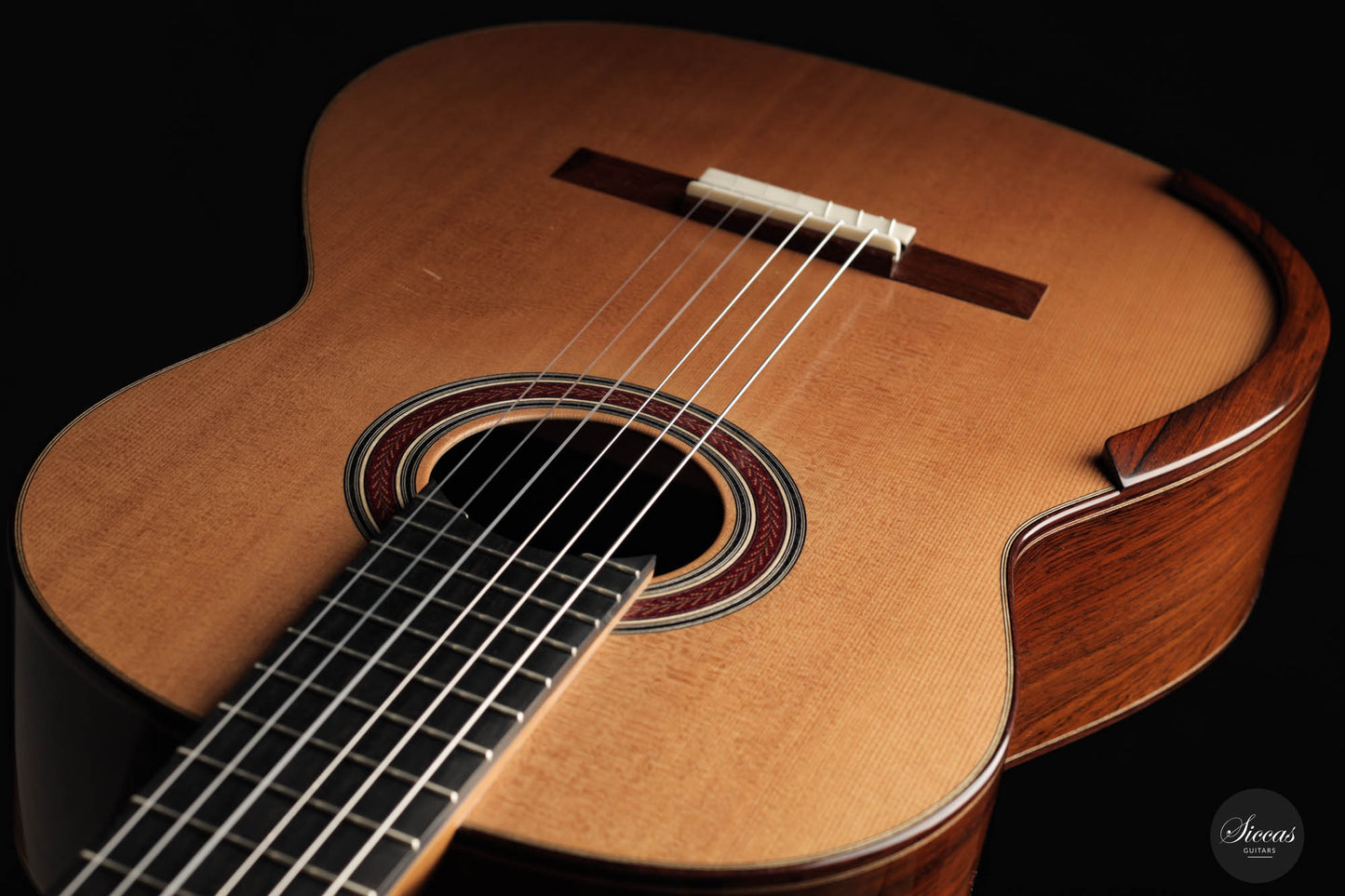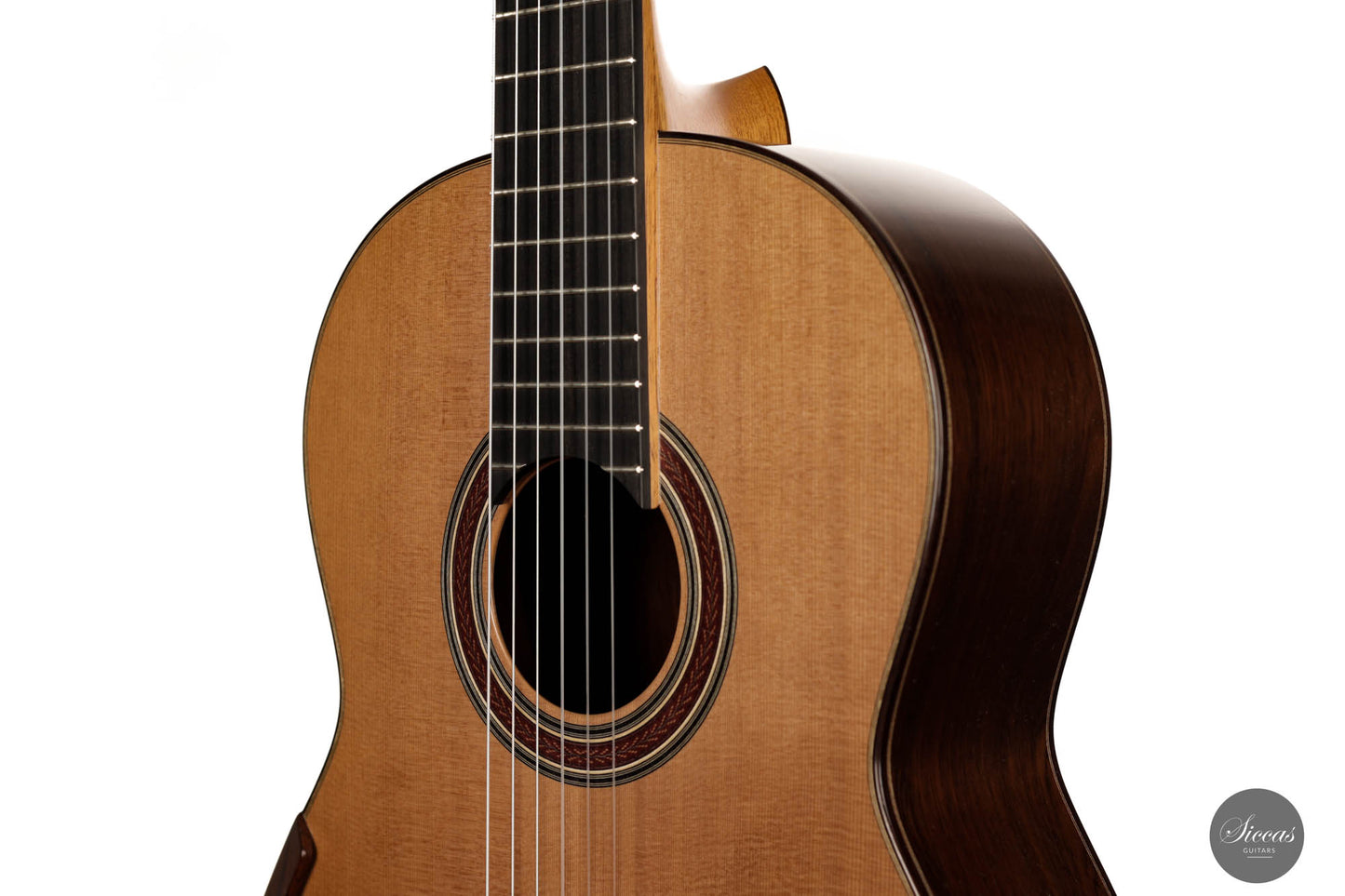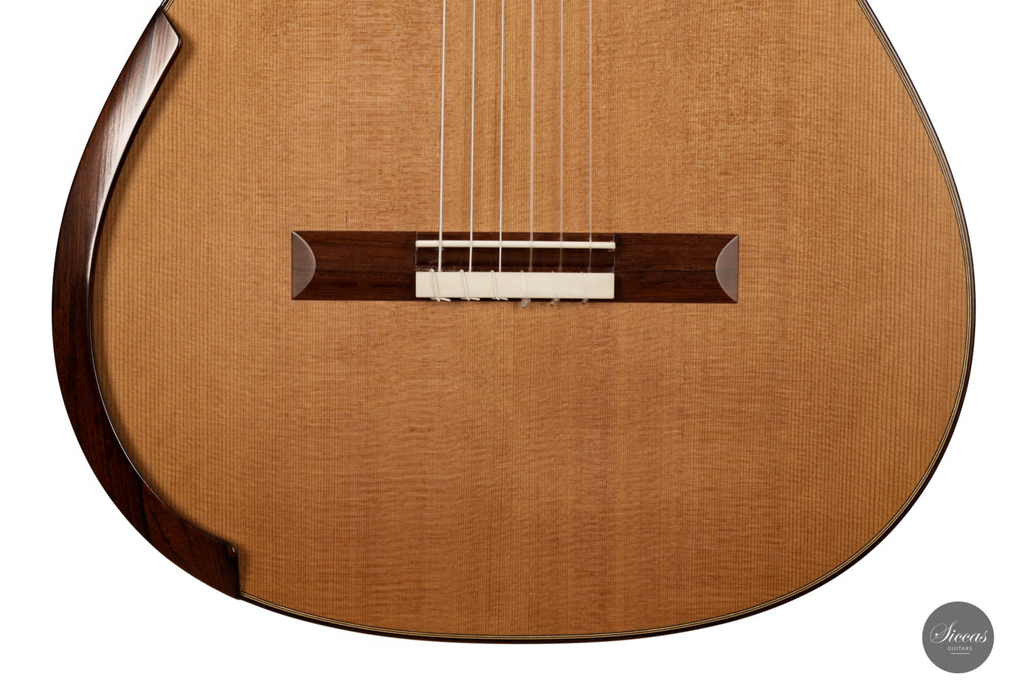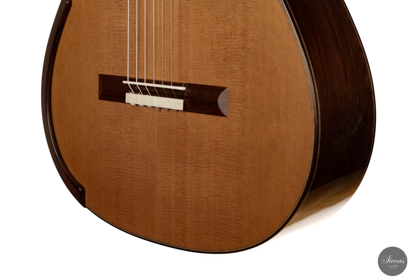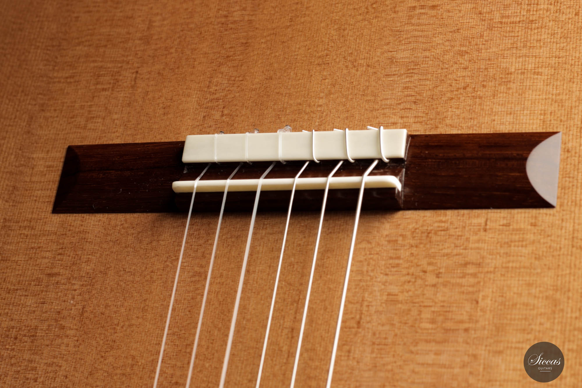 Diese Zbigniew-Gnatek-Gitarre aus dem Jahr 2023 stellt eine beeindruckende Leistung auf dem Gebiet der Geigenbaukunst dar, die ein Gleichgewicht zwischen ästhetischer Anmut und hervorragender Handwerkskunst schafft. Dieses aus Australien stammende Instrument unterscheidet sich von anderen regionalen Modellen durch seine leichte Gitterkonstruktion. Die Decke der Gitarre ist fachmännisch aus hochwertigem Zedernholz gefertigt. Boden und Zargen sind aus Madagaskar-Palisander gefertigt, einem Holz, das sowohl optisch als auch klanglich beeindruckend ist. Diese sorgfältige Auswahl und Kombination von Tonhölzern ergibt ein Instrument mit einer akustischen Qualität, die seinem ästhetischen Reiz entspricht. Was den Klang betrifft, so bietet dieses Gnatek-Modell überragende Höhen, die reich an Obertönen und Harmonien sind. Die Bässe sind direkt und klar und tragen zu einem ausgewogenen und dynamischen Klangprofil bei, das für verschiedene Konzertszenarien geeignet ist. Besonders hervorzuheben ist die außergewöhnliche Lautstärke des Instruments, die es für verschiedene Spielformen geeignet macht, von intimen Settings bis hin zu größeren Konzertumgebungen. Die Gitarre ist in nahezu neuwertigem Zustand, abgesehen von einigen kleinen Gebrauchsspuren, die typisch für gebrauchte Instrumente sind. Mit ihrer Integration von visueller und klanglicher Kunstfertigkeit ist diese Zbigniew-Gnatek-Gitarre ein Zeugnis für die sorgfältige Handwerkskunst ihres Erbauers und bereit, dem Spieler ein überragendes Musikerlebnis zu bieten.