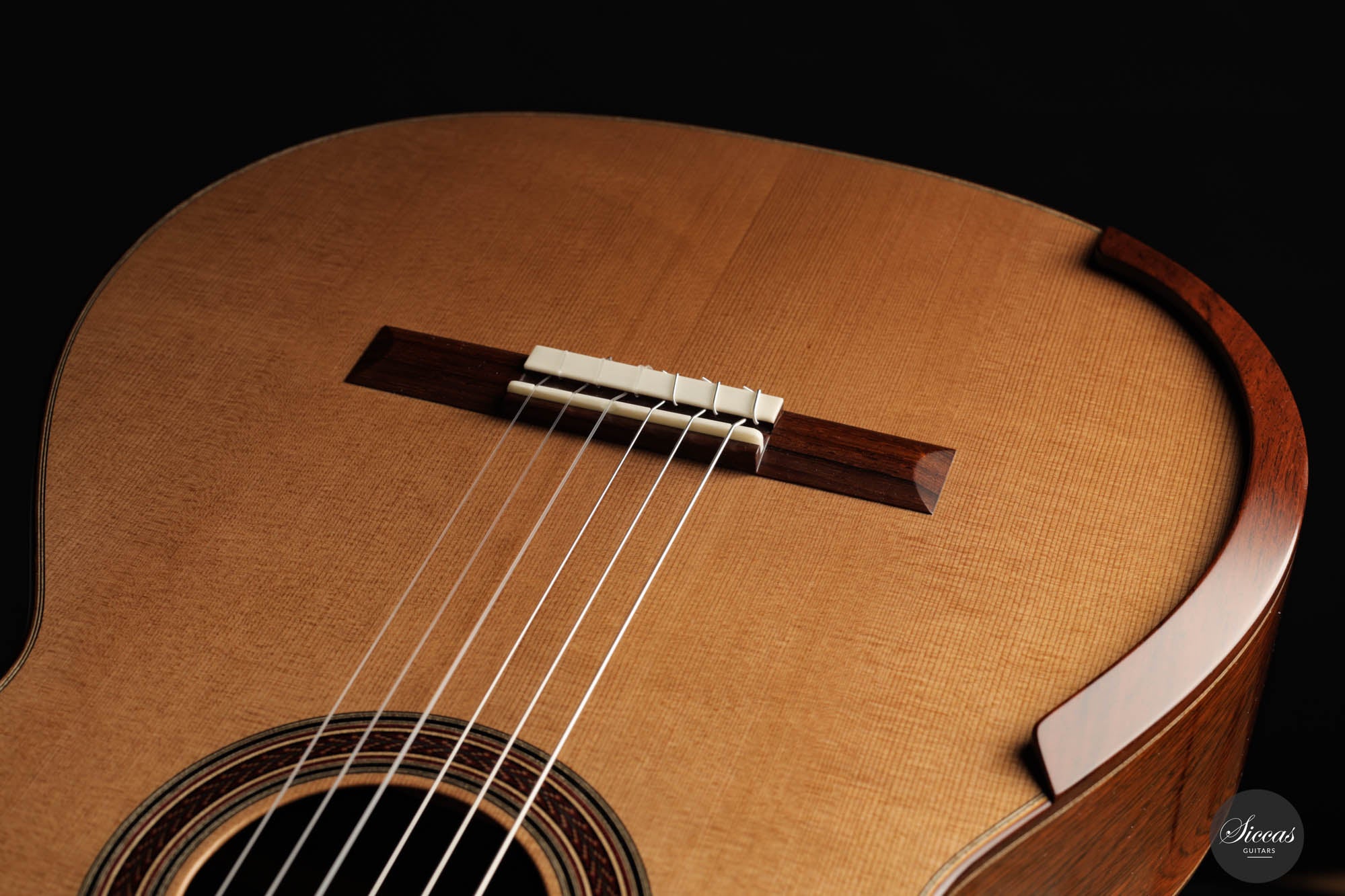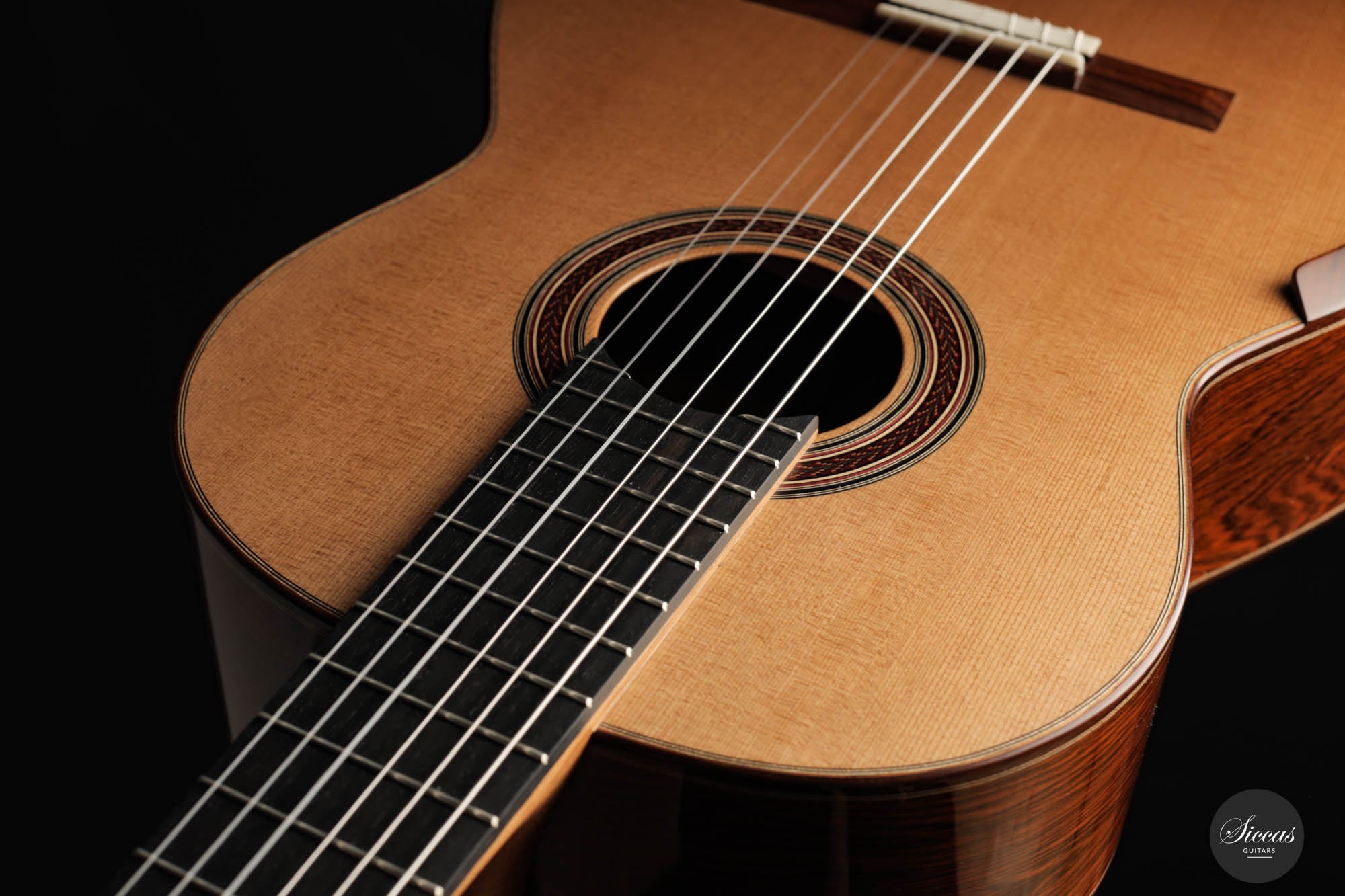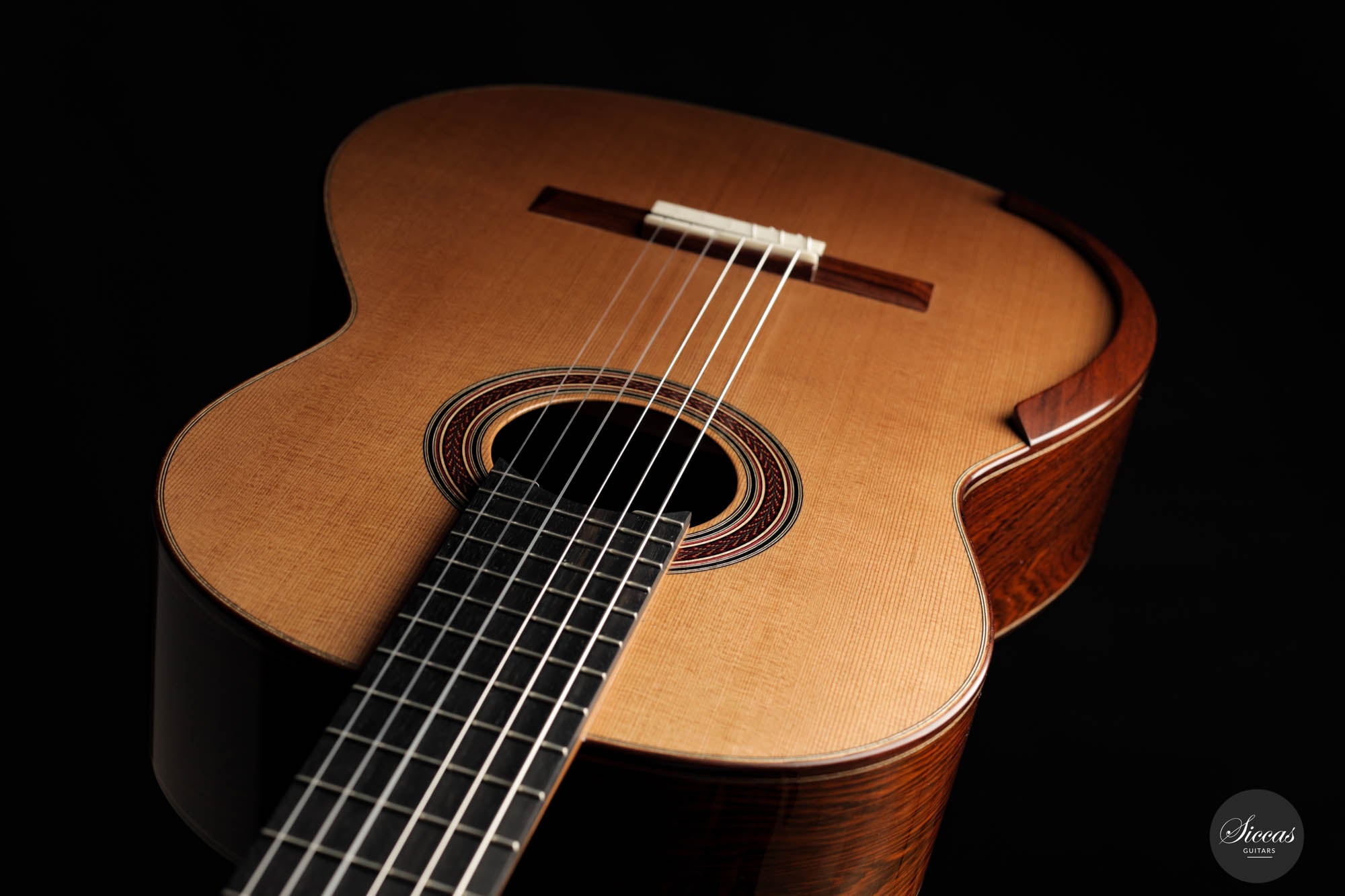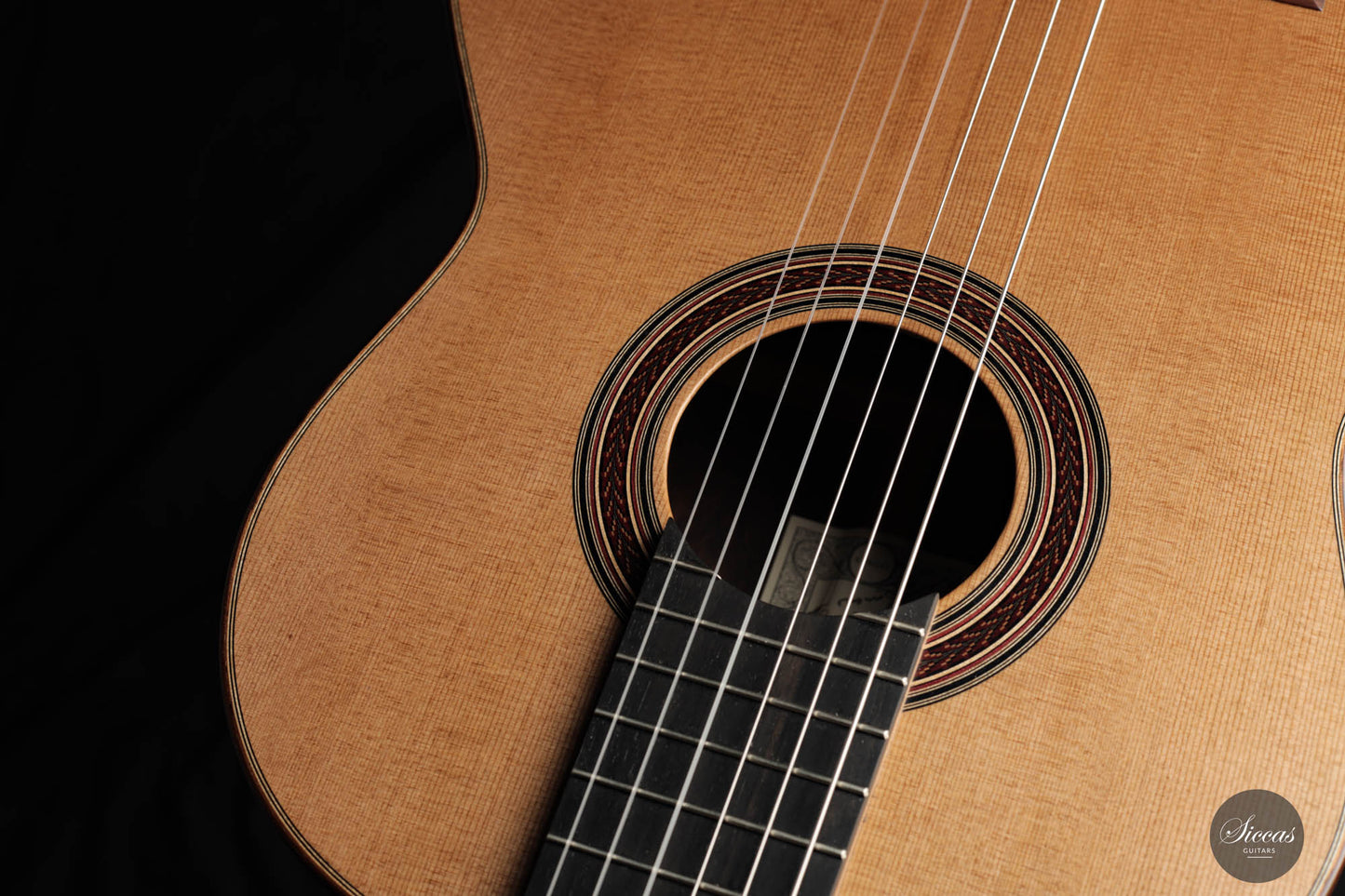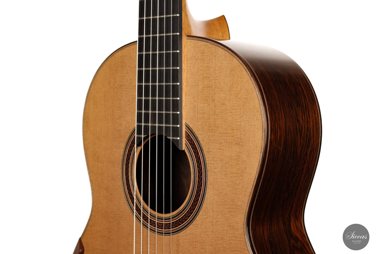 Im Herzen dieser Gitarre befindet sich eine akribisch geschnitzte Decke aus erstklassigem Zedernholz, das für seine Resonanz und klangliche Treue bekannt ist. Ergänzt wird dies durch Rücken und Seiten, die aus dem prächtigen Madagaskar-Palisanderholz geformt sind, einem Holz, das nicht nur durch seinen fesselnden visuellen Charme, sondern auch durch seine außergewöhnliche klangliche Lebendigkeit gefeiert wird. Das Ergebnis ist ein harmonisches Zusammenspiel der ausgewählten Klanghölzer, das in einem Instrument gipfelt, das ebenso klanglich erhaben ist wie es visuell fesselnd.