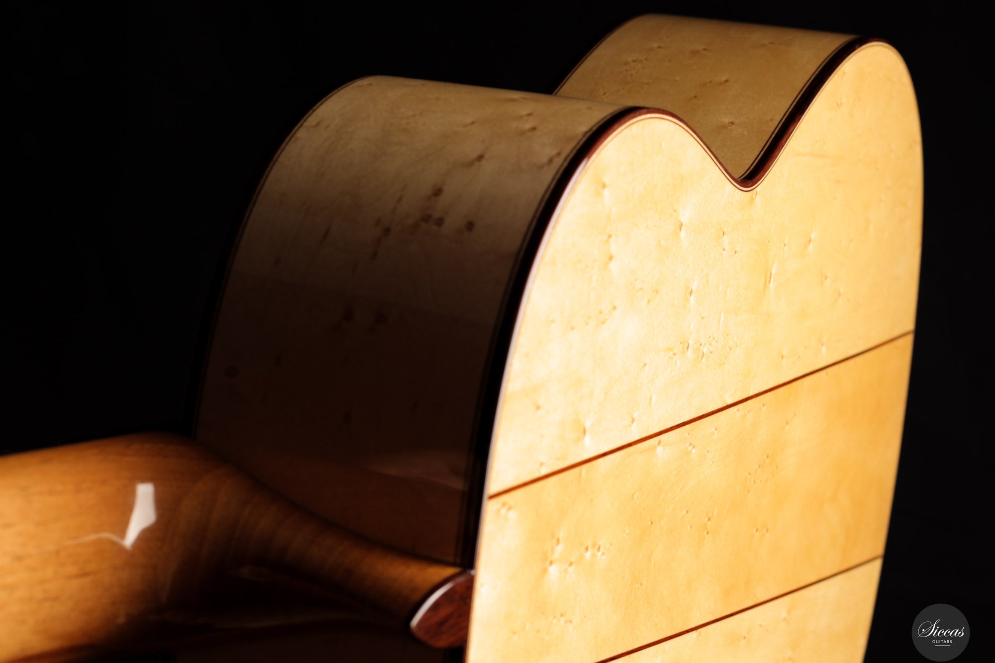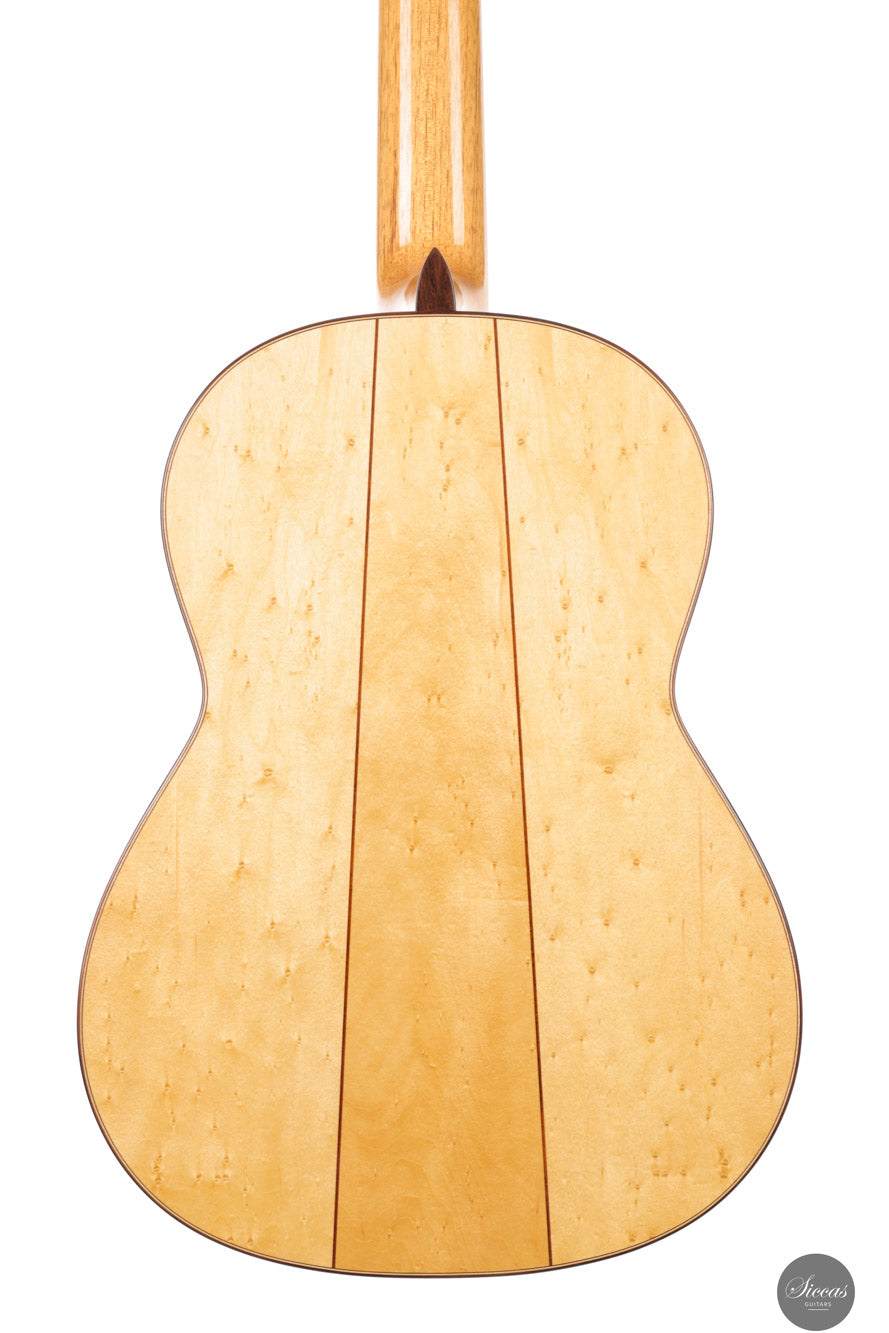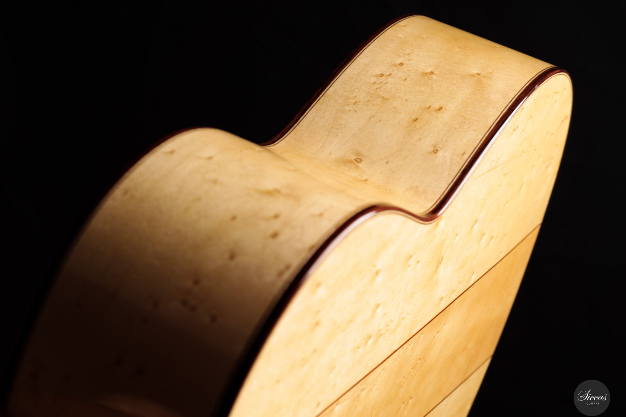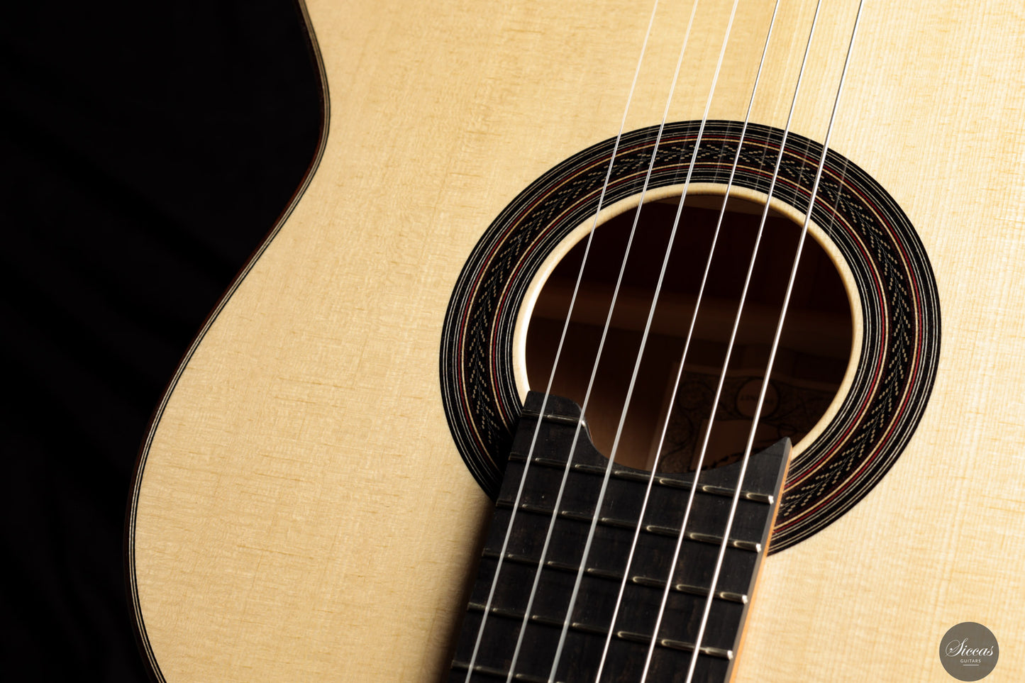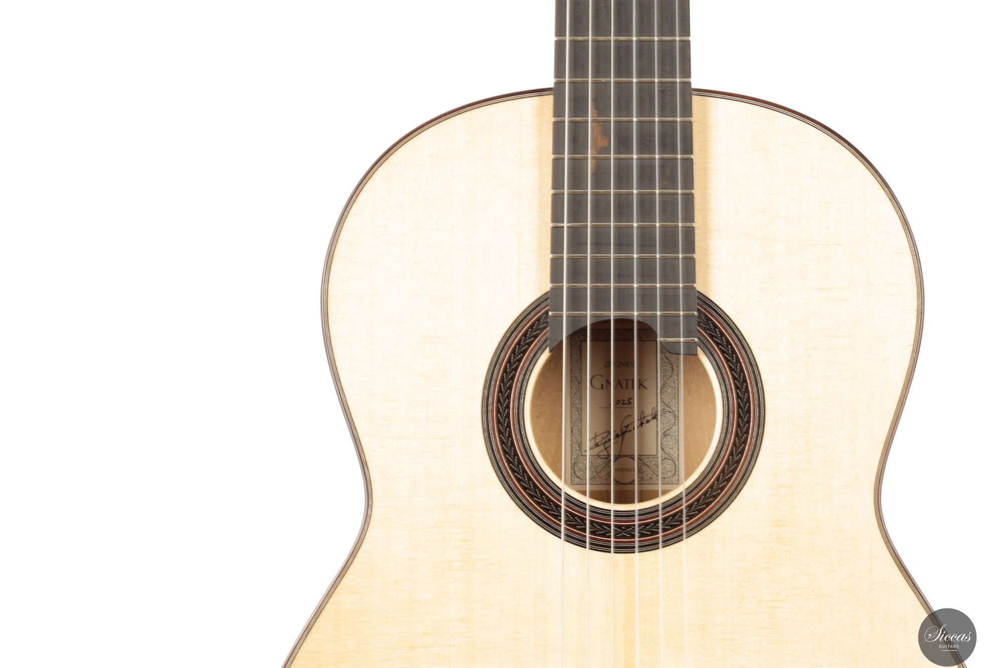 Dieses Instrument aus dem Jahr 2025 ist ein beeindruckendes Beispiel für Gnateks neueste Arbeit und verfügt über eine Fichtendecke in Kombination mit wunderschön geflammtem Vogelaugenahorn für Boden und Zargen. Die Wahl von Fichte, eher untypisch für Gnatek, der häufig mit Zeder arbeitet, verleiht der Gitarre einen fokussierten und klar artikulierten Klangkern. Die Gitarre ist mit einer feinen, karbonverstärkten Lattice-Beleistung sowie doppelt gearbeiteten Zargen und Boden ausgestattet, die sowohl strukturelle Stabilität als auch außergewöhnliche Projektion und Sustain ermöglichen.