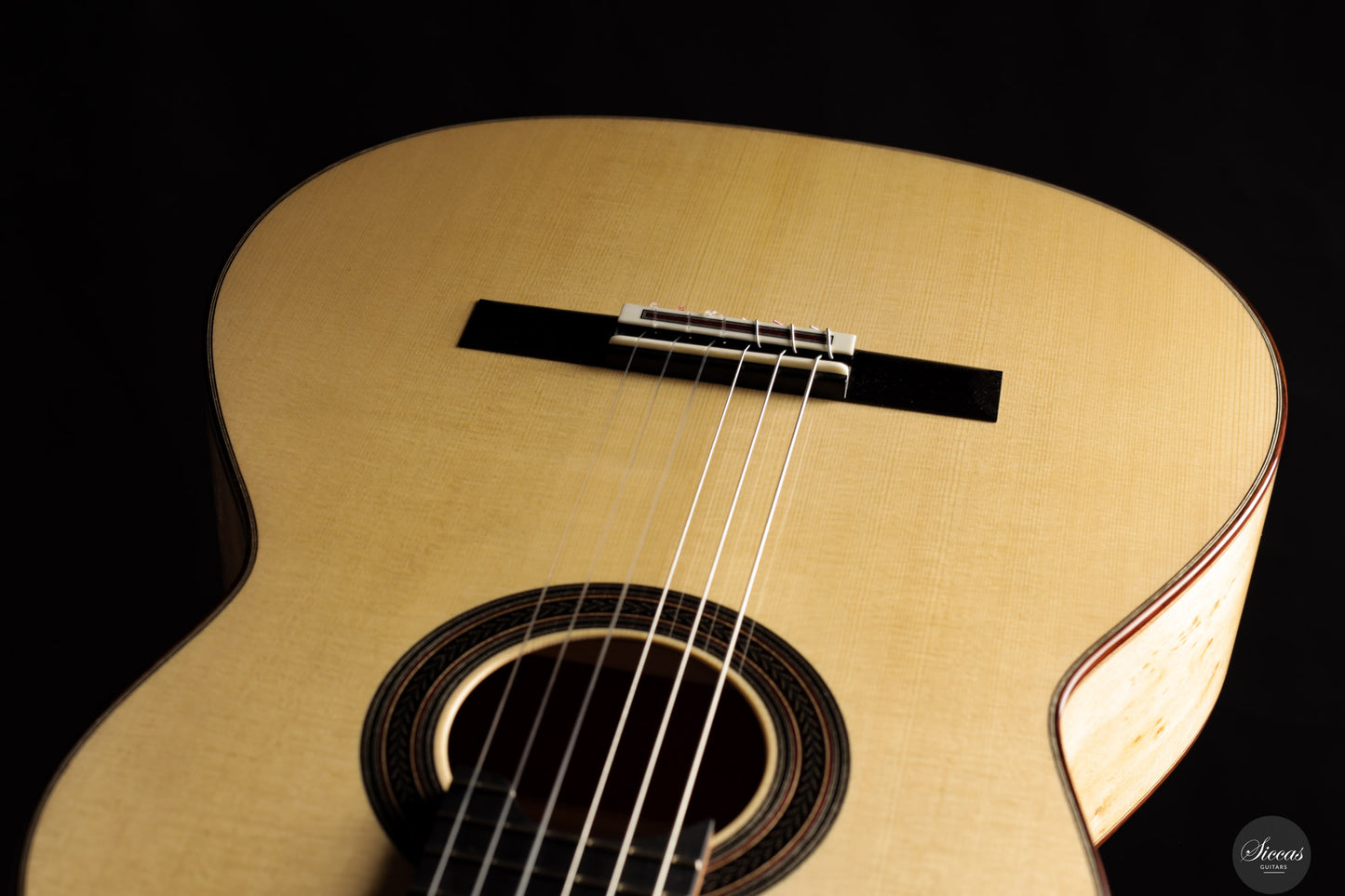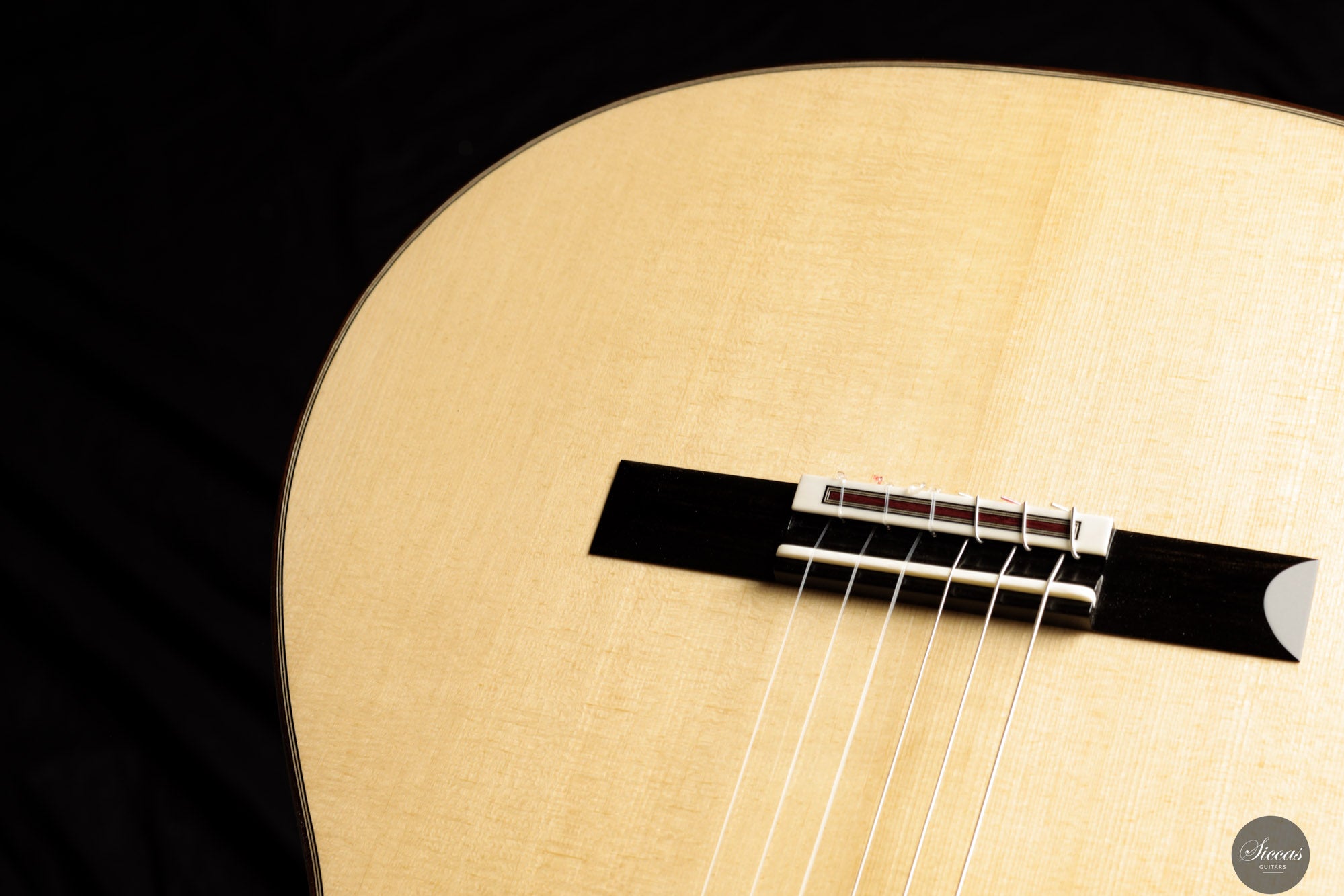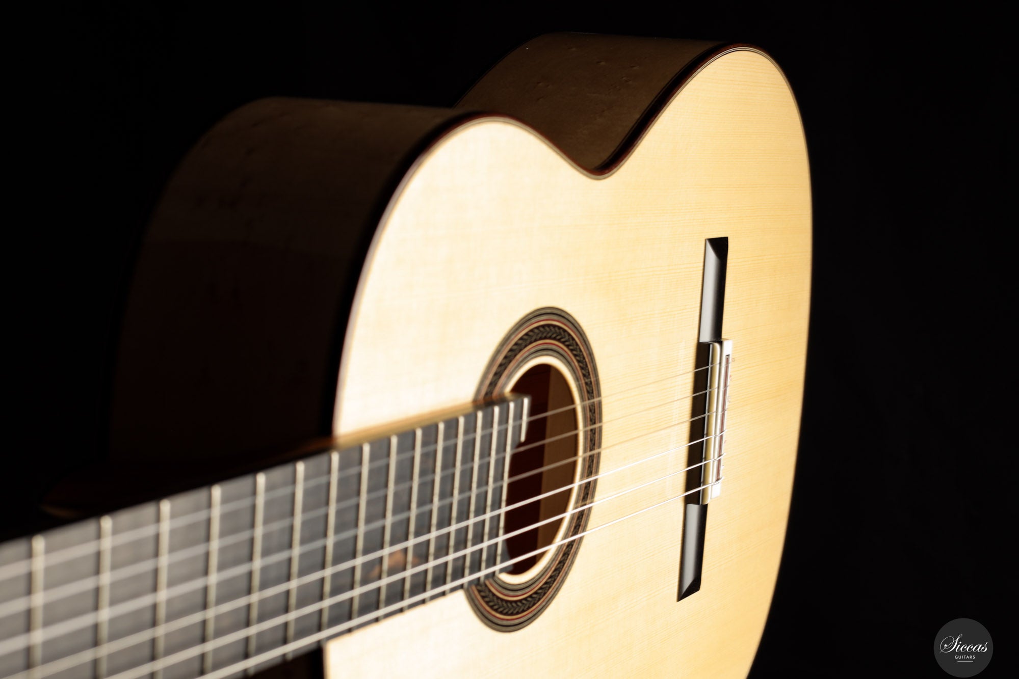 Trotz der fortschrittlichen Konstruktion bleibt das Instrument leicht und äußerst reaktionsfreudig. Bereits der geringste Impuls der rechten Hand erzeugt einen warmen, runden Ton, der sowohl samtig als auch klanglich komplex ist. Die Kombination aus Kraft, Klarheit und spielerischer Leichtigkeit macht dieses Modell zu einer herausragenden Konzertgitarre, präzise, expressiv und mit bemerkenswerter Klangtiefe.