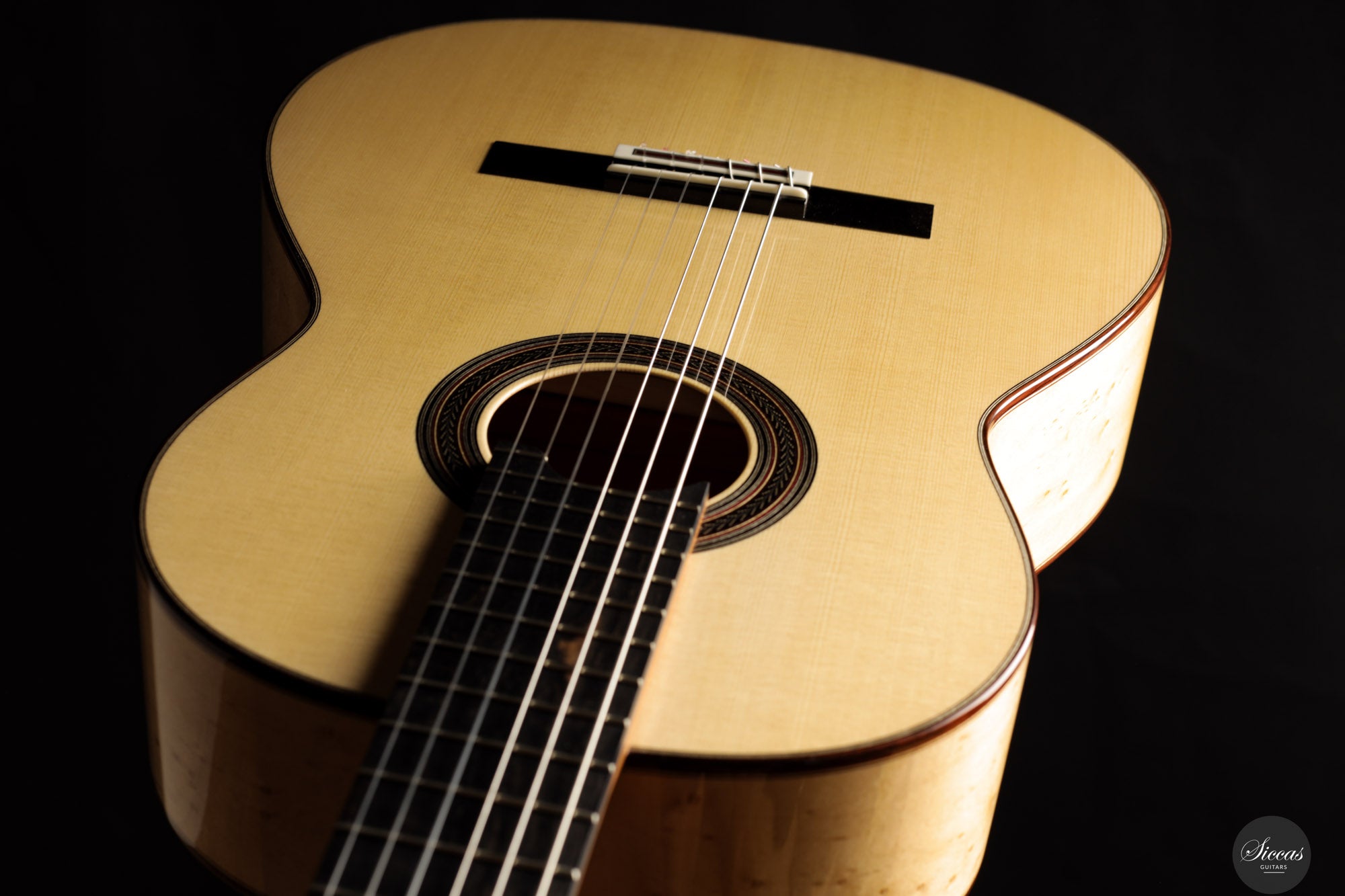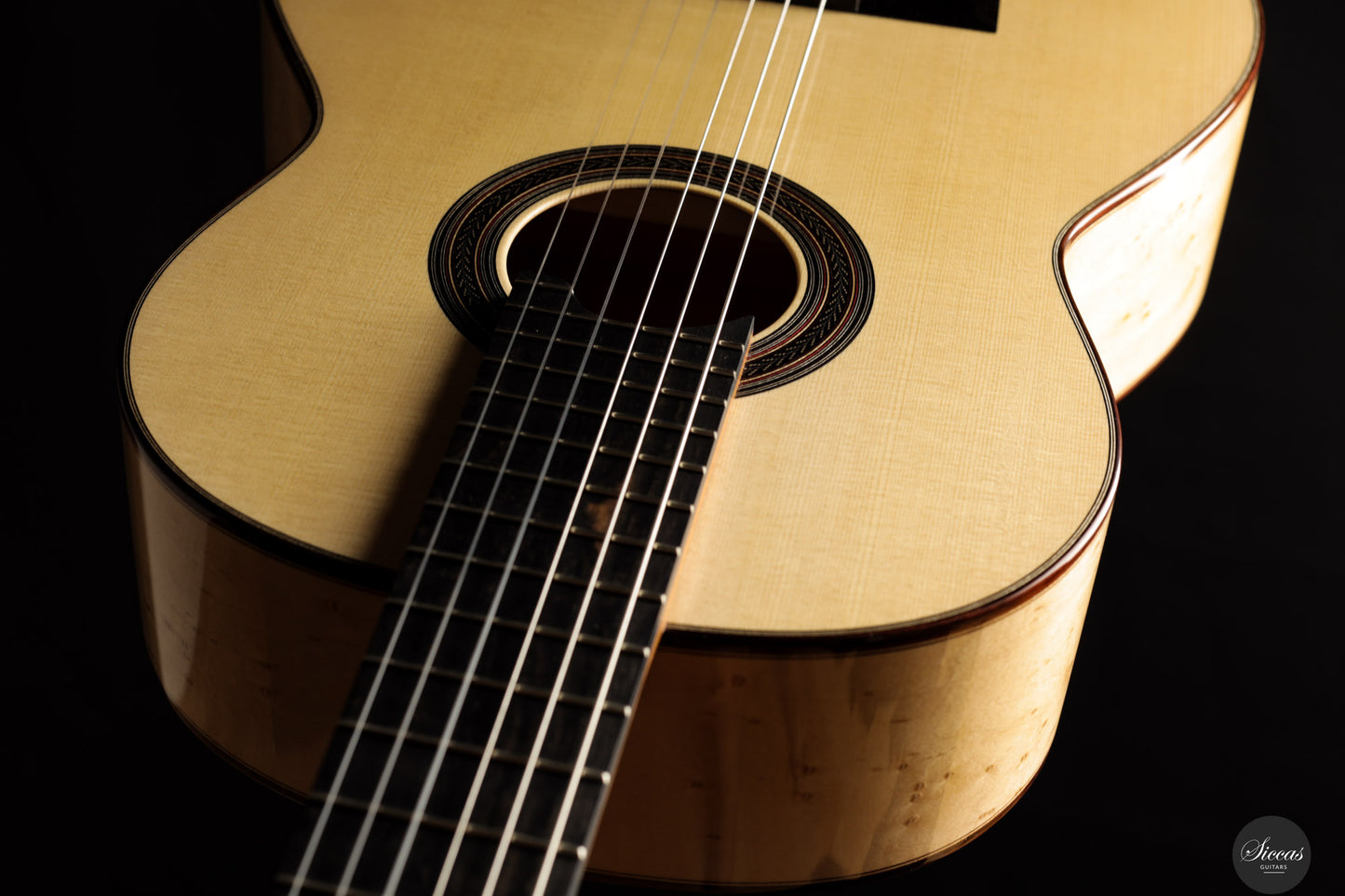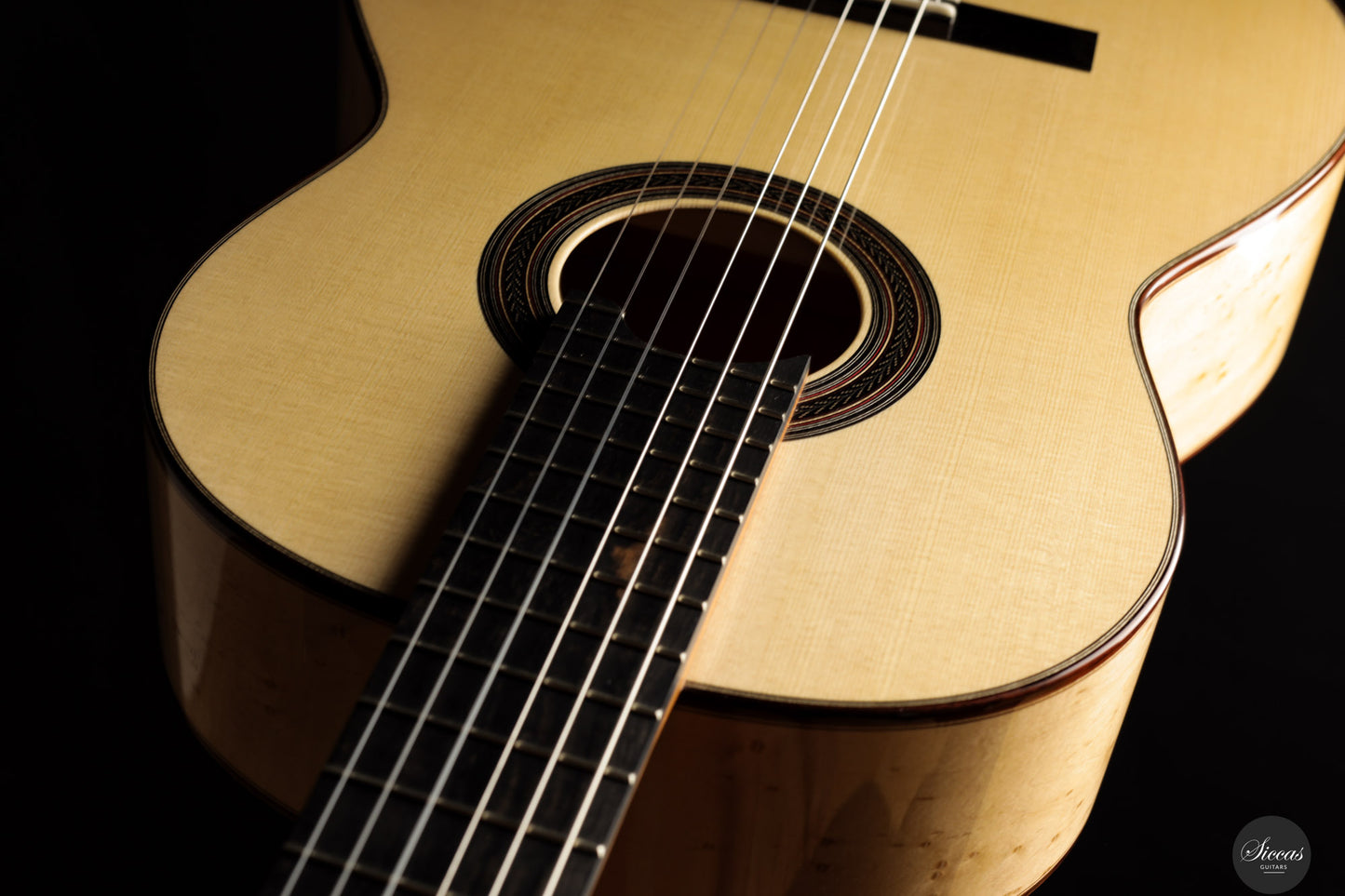 Trotz der fortschrittlichen Konstruktion bleibt das Instrument leicht und äußerst reaktionsfreudig. Bereits der geringste Impuls der rechten Hand erzeugt einen warmen, runden Ton, der sowohl samtig als auch klanglich komplex ist. Die Kombination aus Kraft, Klarheit und spielerischer Leichtigkeit macht dieses Modell zu einer herausragenden Konzertgitarre, präzise, expressiv und mit bemerkenswerter Klangtiefe.